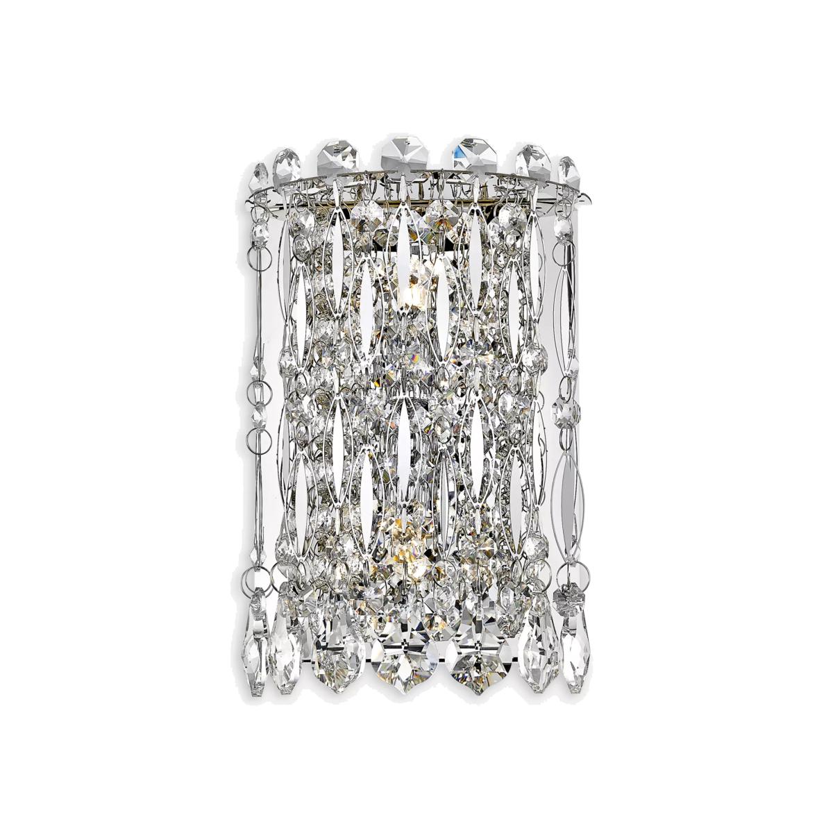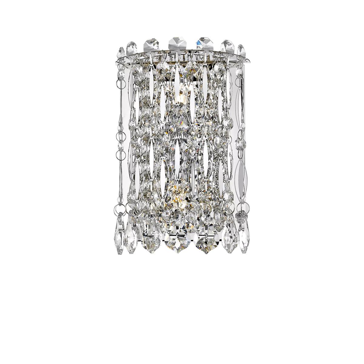 This dazzling wall light will make an impact in your space. Its ornate design features crystal droplets and a polished chrome frame. Bulbs not included.