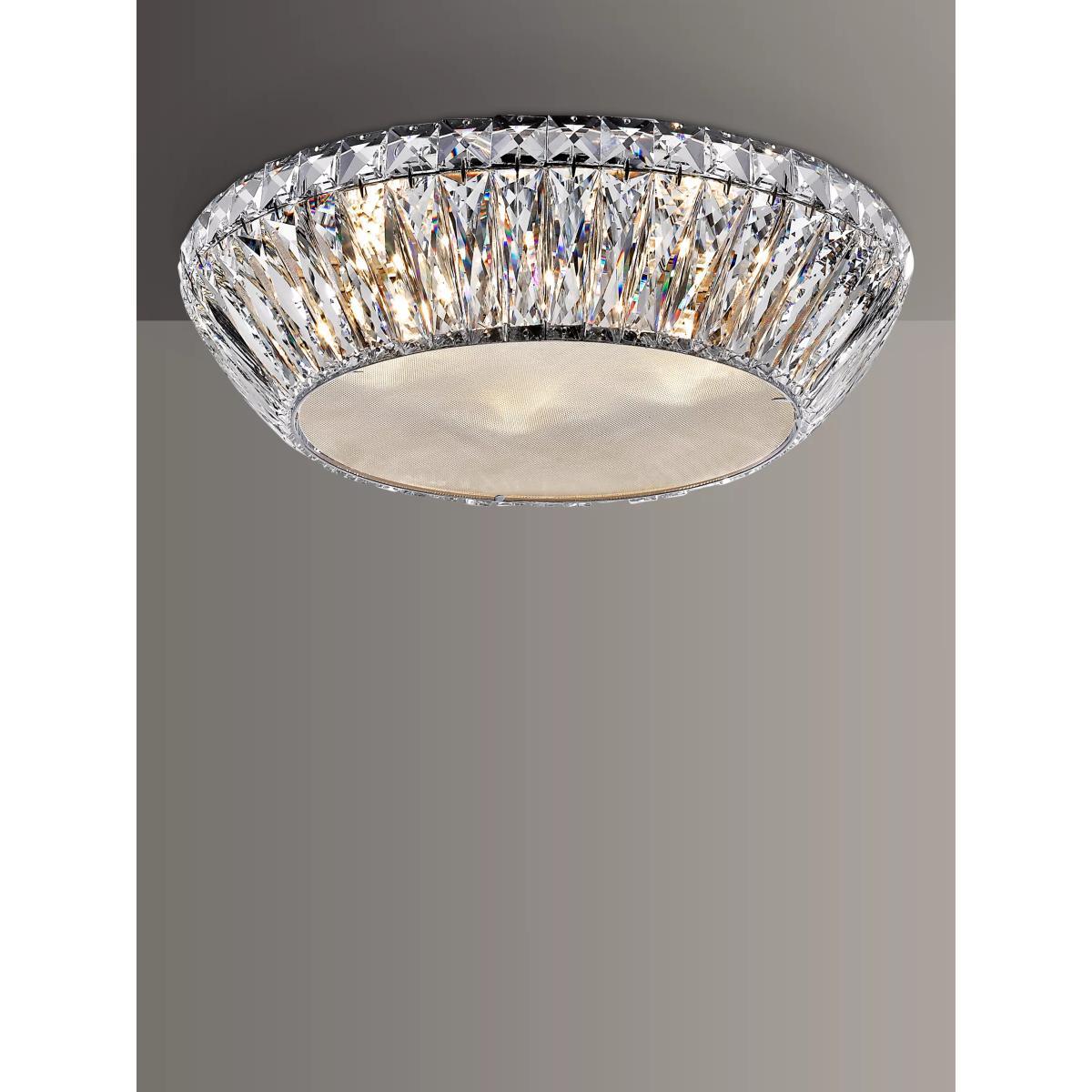 I love this semi-flush light for its sleek, contemporary look and the way it effortlessly adds a touch of glamour to any space. The clear crystals combined with the chrome finish create a bright, reflective effect that works beautifully in modern or transitional interiors. It’s a versatile piece that fits well in smaller spaces like hallways, bathrooms, or low-ceilinged rooms, providing ample illumination without overwhelming the ceiling height. For styling tips, consider pairing it with other minimalist metallic accents or a neutral colour palette to let the sparkle really stand out. It’s especially effective in schemes where a bit of elegance is desired without having to commit to a large chandelier or overly ornate lighting.