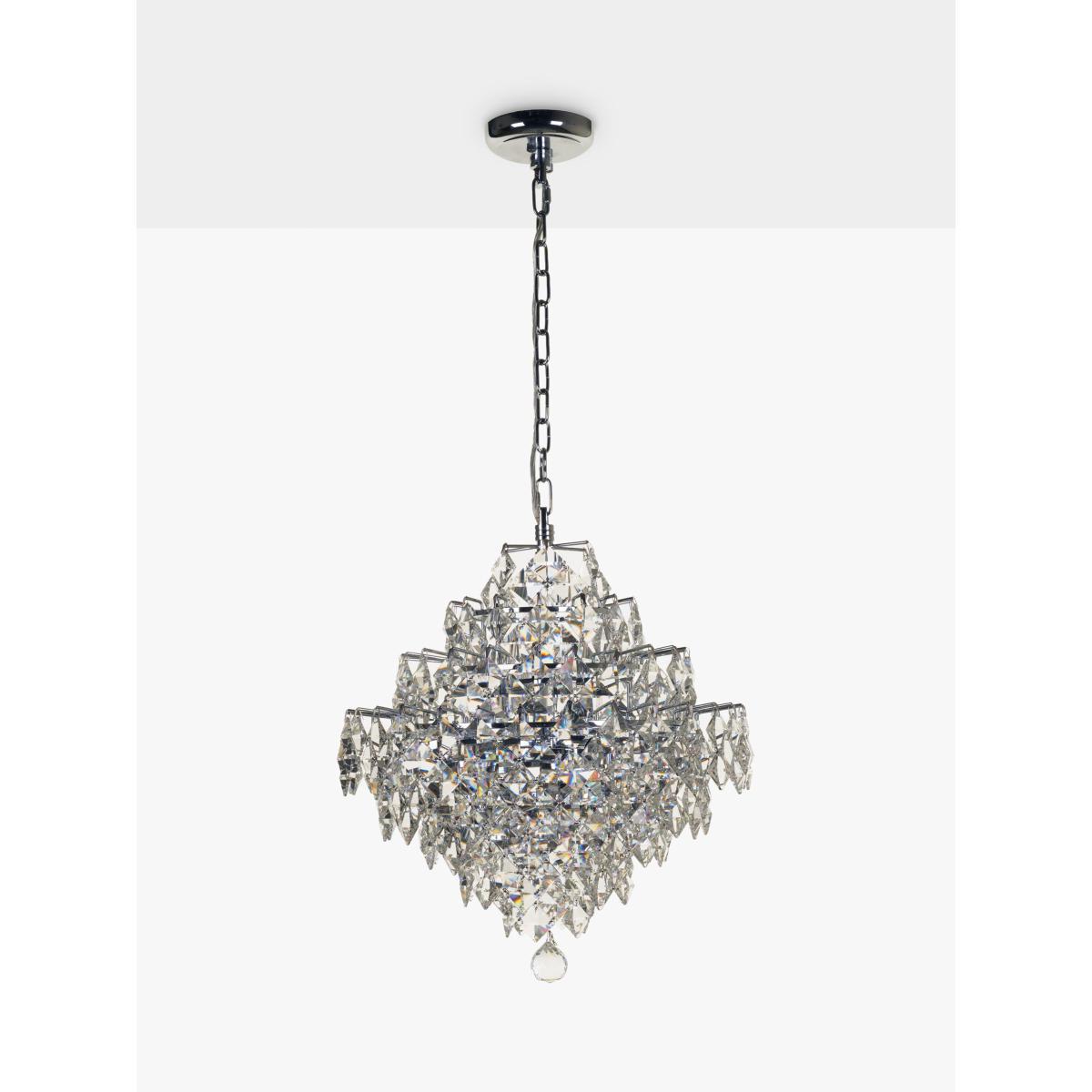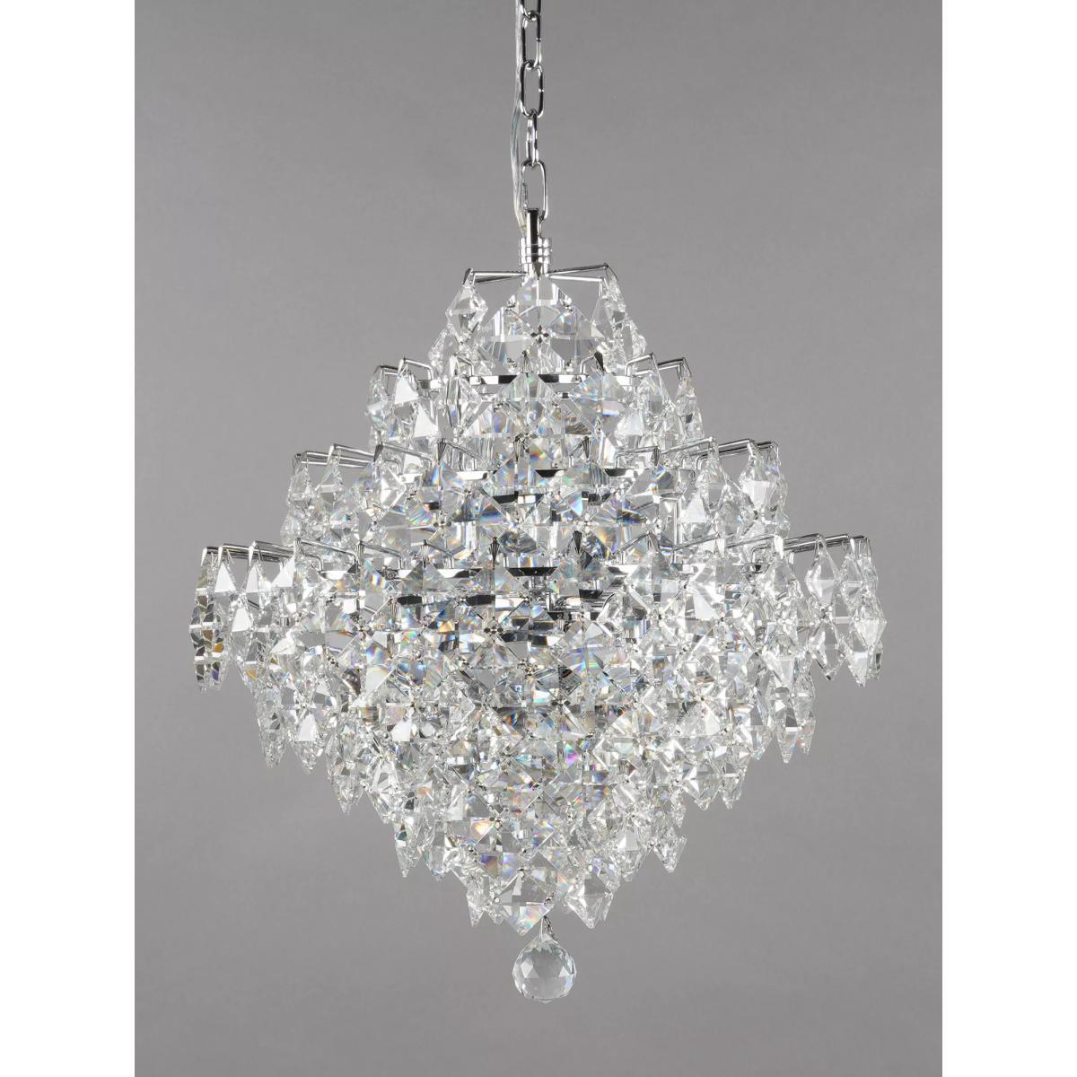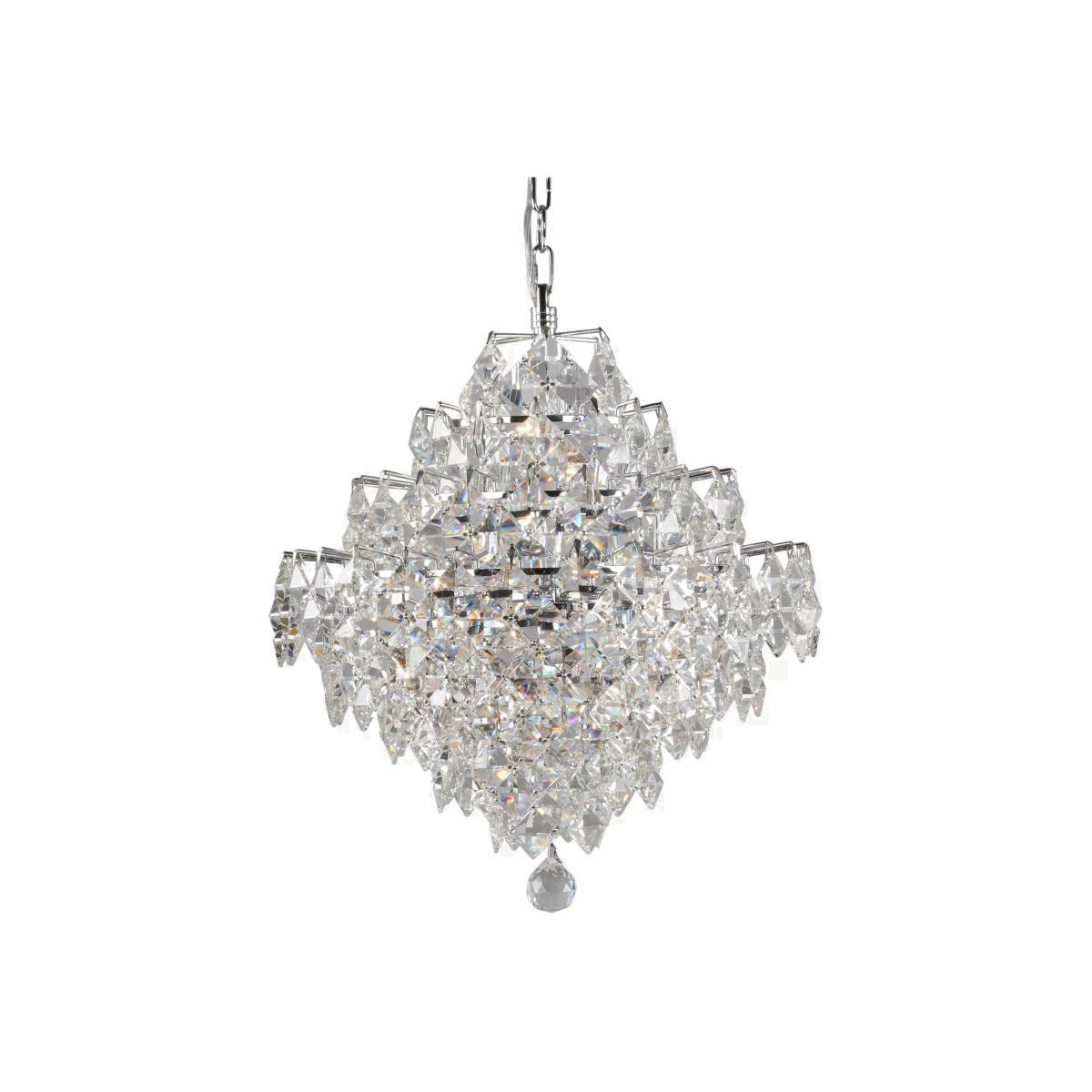A statement piece for any room or hallway, this crystal chandelier from Impex's Diamond range is reminiscent of Art Deco design. Faceted diamond-shaped crystals glisten on a chrome frame, finished with a faceted lower finial.