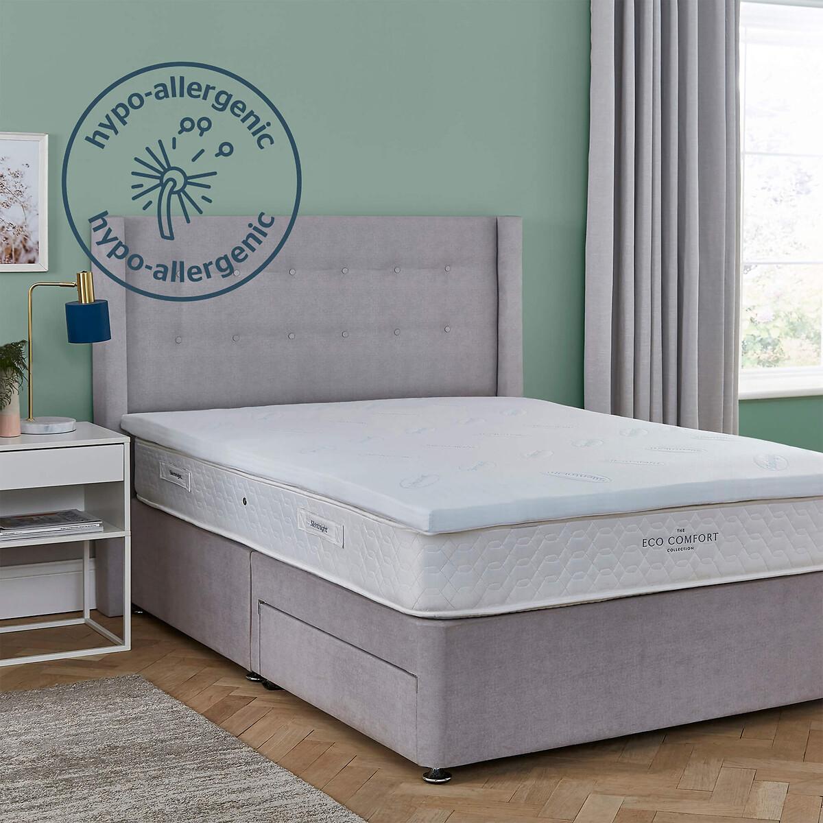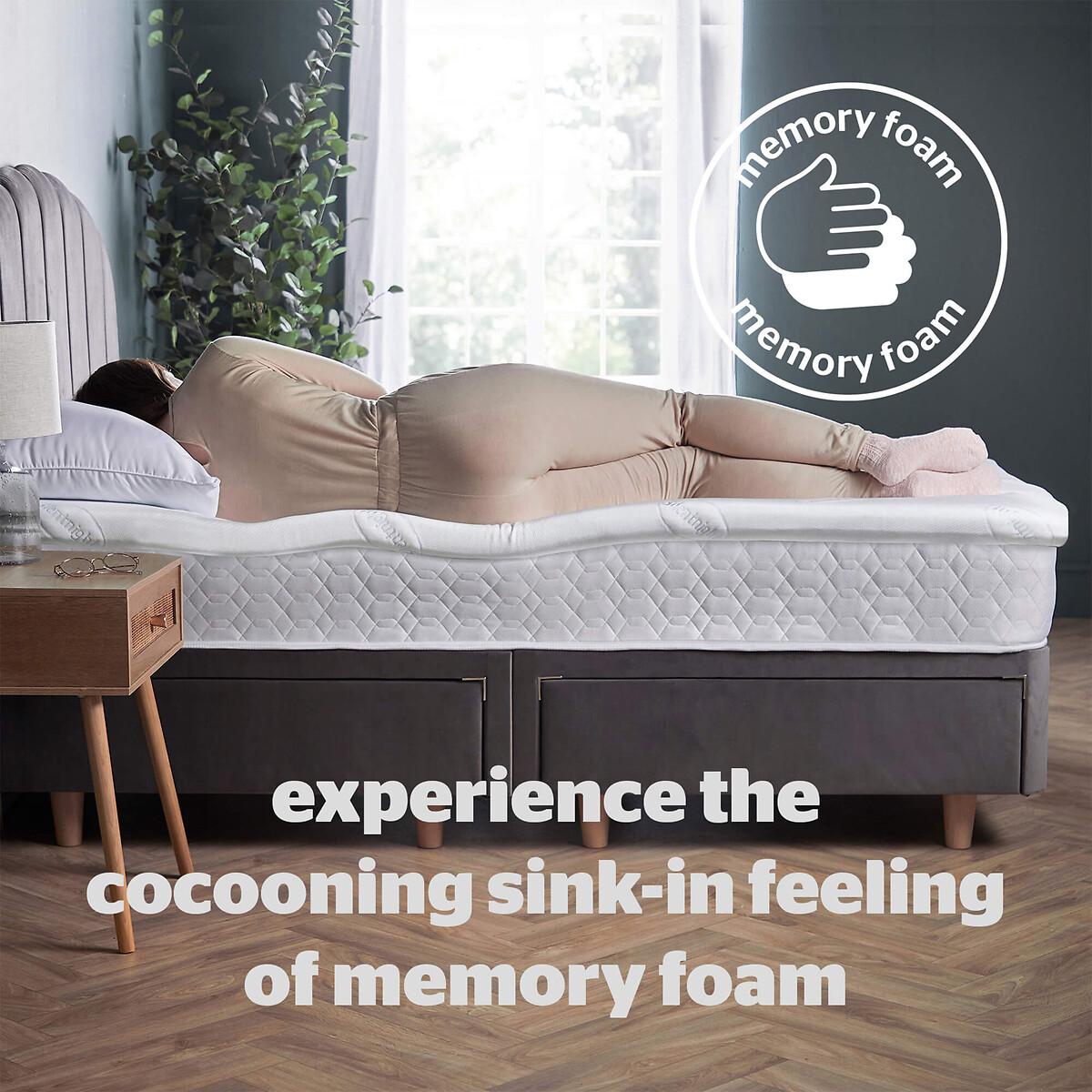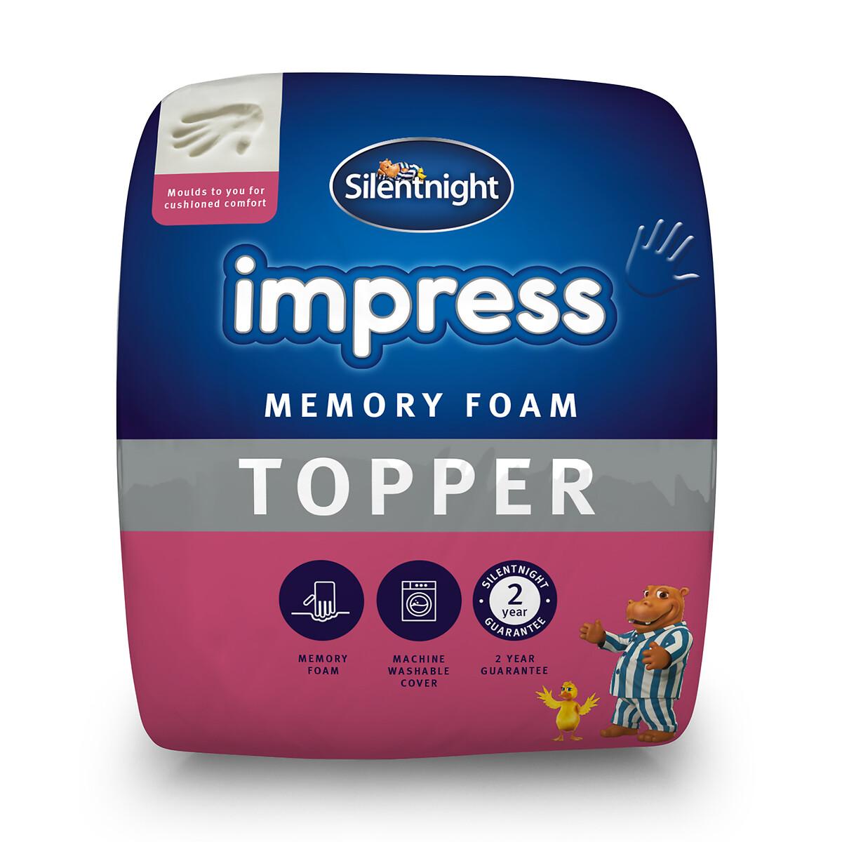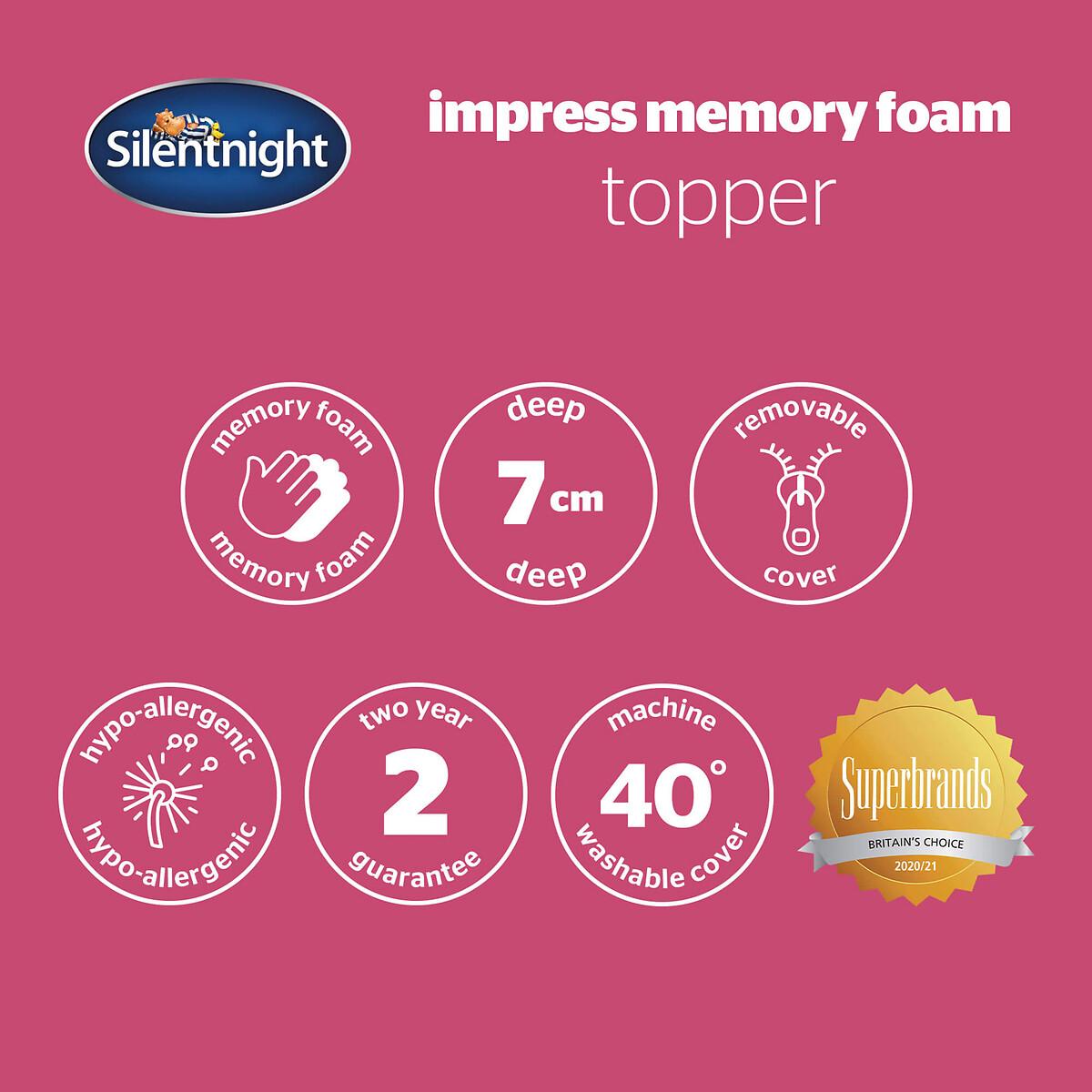 The Impress Memory Foam Mattress Topper by Silentnight has been designed to offer both soothing pressure relief and ultimate comfort. The mattress topper features soft and reactive 7cm deep memory foam that moulds to your unique body shape helping to reduce the pressure points on your spine, giving relief to the muscles and reducing aches and pains. Comes complete with a removable cover that is soft to the touch and will provide exceptional comfort for a perfect night’s sleep.•SOOTHING PRESSURE RELIEF:Moulds with the contours of your body for soothing pressure relief; making it the perfect choice for sink-in snoozers.•CUSHIONED COMFORT:Next level memory foam comfort that gently cocoons your body.•7CM DEEP:The 7cm depth of the topper helps to rejuvenate your mattress.•REMOVABLE COVER: Comes with a handy removable cover that is machine washable so you can always keep your topper feeling fresh and hygienic.•HYPOALLERGENIC: This product does not contain any materials likely to cause allergies.•GUARANTEE: 2 year manufacturer’s guarantee. Product Dimensions- Single- 135 x 200cm, Double- 200 x 200cm, King- 220 x 225cm, Superking- 220 x 260cm. This product will be dispatched by one of our trusted suppliers. You’ll be contacted by their selected courier about your delivery. Goods must be unused and returned in their original packaging. If sealed for health/hygiene reasons they must also be returned unopened with seals, stickers and tags intact.