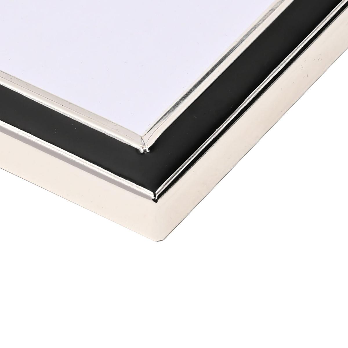 * Modern design * Velvet stand * Perfect for gifting * Available in multiple sizes This photo frame features a sleek silver-plated finish with a black epoxy border, adding a touch of modern elegance to any décor. It is ideal for showcasing cherished memories, making it a perfect gift for special occasions. Designed for portrait or landscape orientation, it includes a sturdy stand for easy display on any surface. This photo frame is available in multiple sizes.