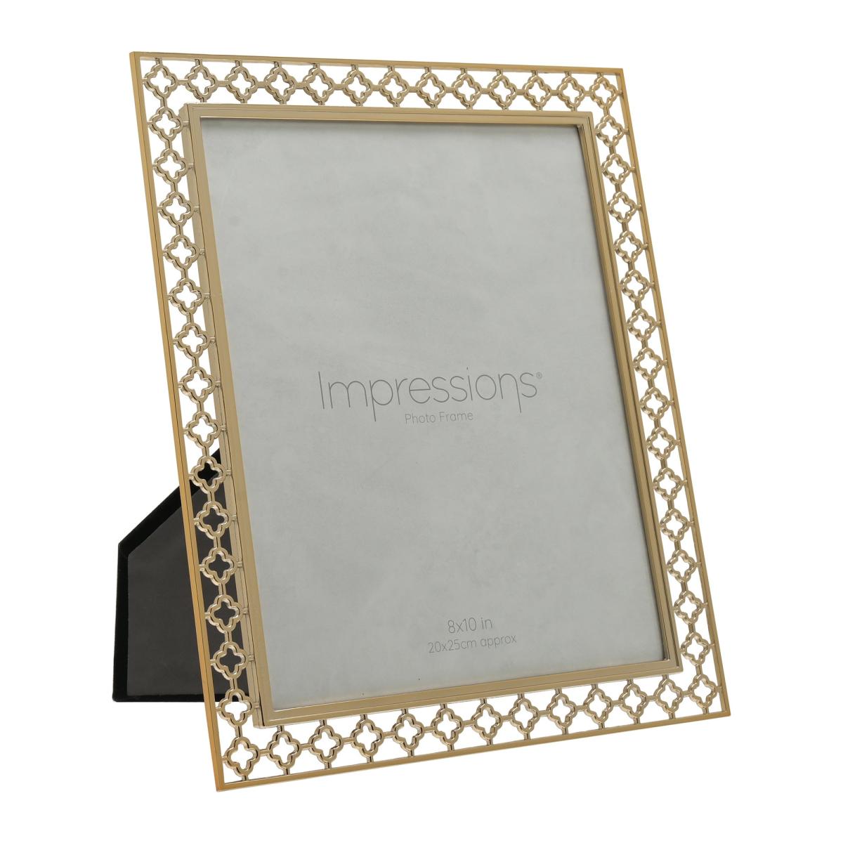 * Lattice cut pattern * Moroccan inspired design * Portrait or landscape orientation * Available in multiple sizes This Impressions Photo Frame features an intricate lattice cut design inspired by Moroccan aesthetics, adding a touch of exotic elegance to any space. Made from a durable metal in a gold colourway, it has a high quality finish and is suitable for display in either orientation using the sturdy inbuilt stand. This photo frame is available in multiple sizes to suit different photos.