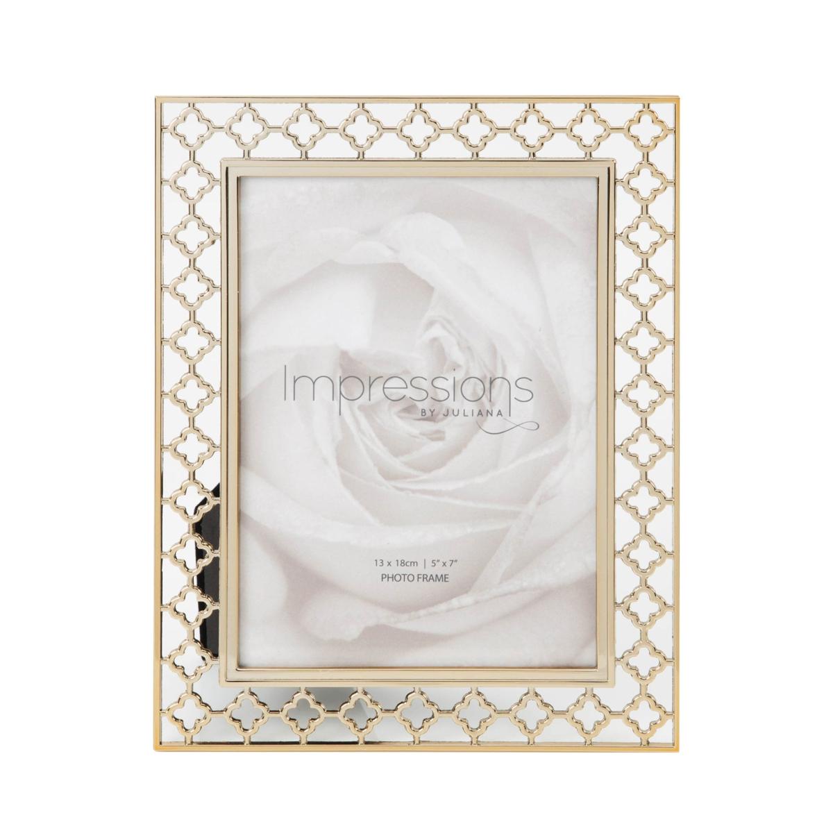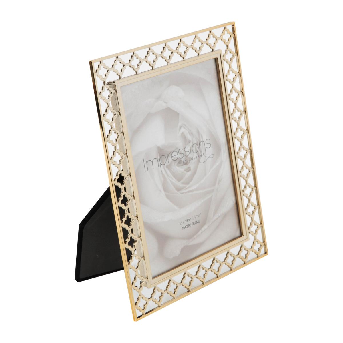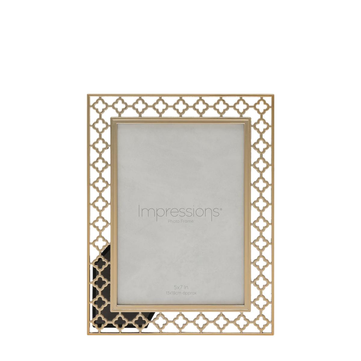 * Lattice cut pattern * Moroccan inspired design * Portrait or landscape orientation * Available in multiple sizes This Impressions Photo Frame features an intricate lattice cut design inspired by Moroccan aesthetics, adding a touch of exotic elegance to any space. Made from a durable metal in a gold colourway, it has a high quality finish and is suitable for display in either orientation using the sturdy inbuilt stand. This photo frame is available in multiple sizes to suit different photos.
