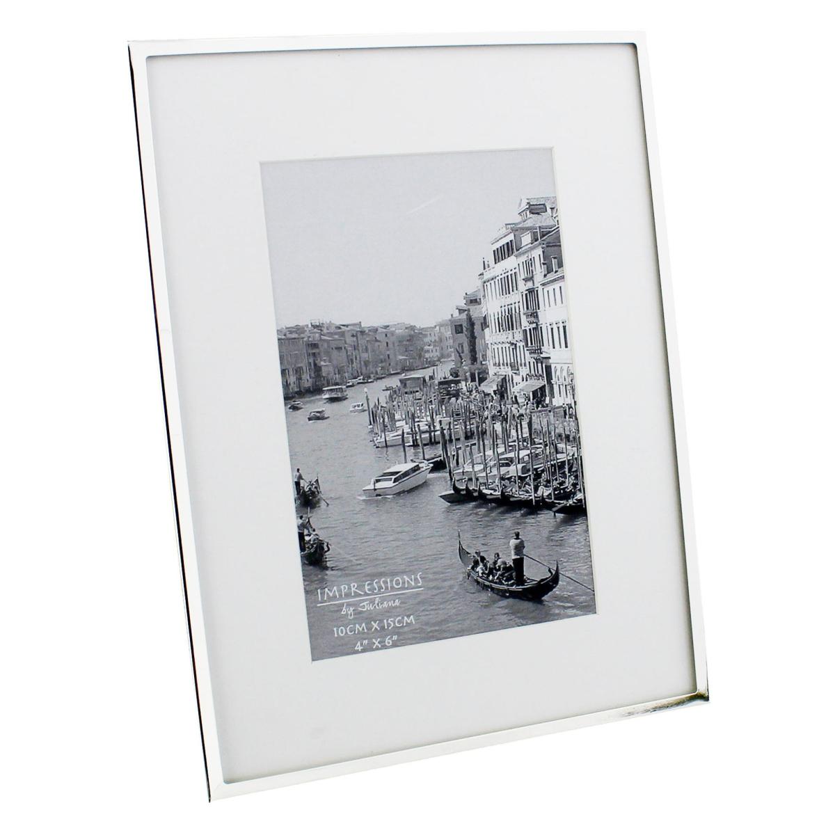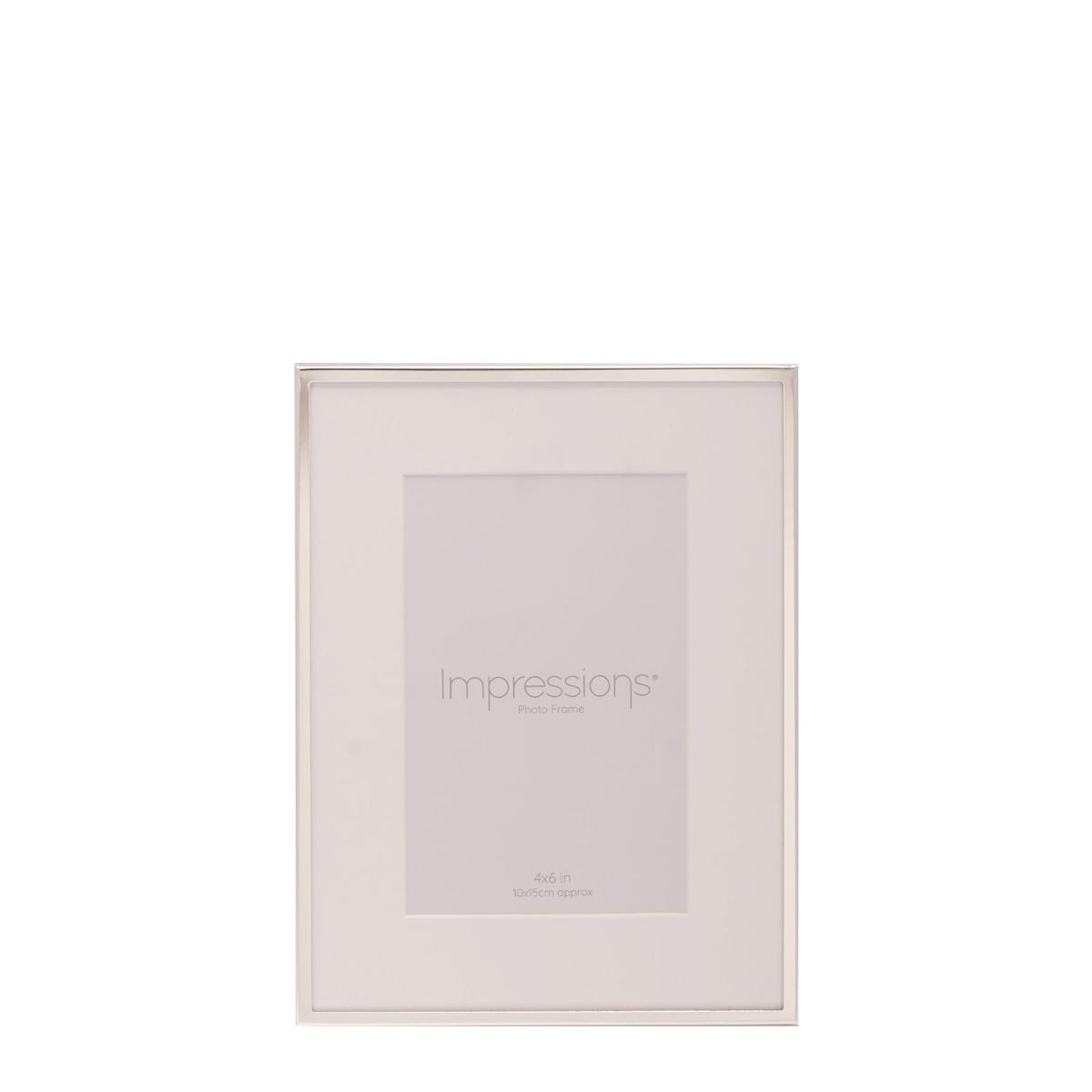 * Sleek design * Silver plated * Portrait or landscape orientation * Velvet stand * Available in multiple sizes The Impressions Silver Plated Metal Photo Frame features a sleek silver-plated finish with a thin white border, adding a touch of modern elegance.  Designed for either orientation, it includes a sturdy stand for easy display on any surface. This photo frame is available in multiple sizes to suit your space, and would make a lovely gift for a special occasion.
