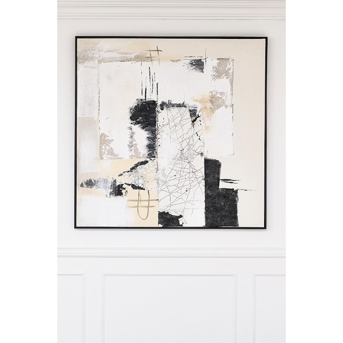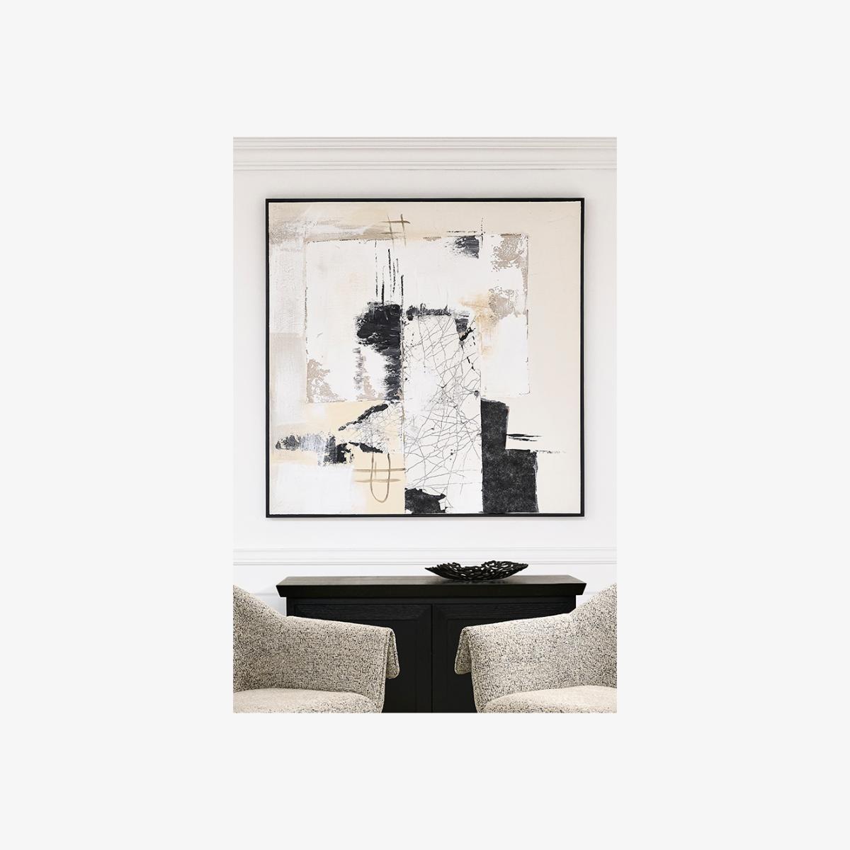 A high-quality, hand-painted artwork on stretched canvas. Abstract design with layered tones and interesting surface textures. With soft neutrals, earthy browns and bold black accents, this composition captures a sense of spontaneity and balance, adding depth and sophistication to any space. Finished in a deep, black-stained wooden frame.