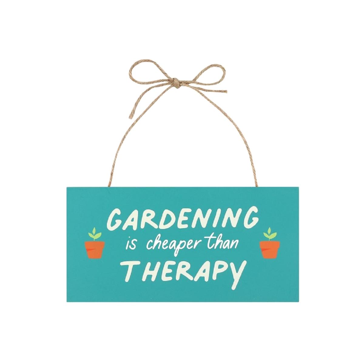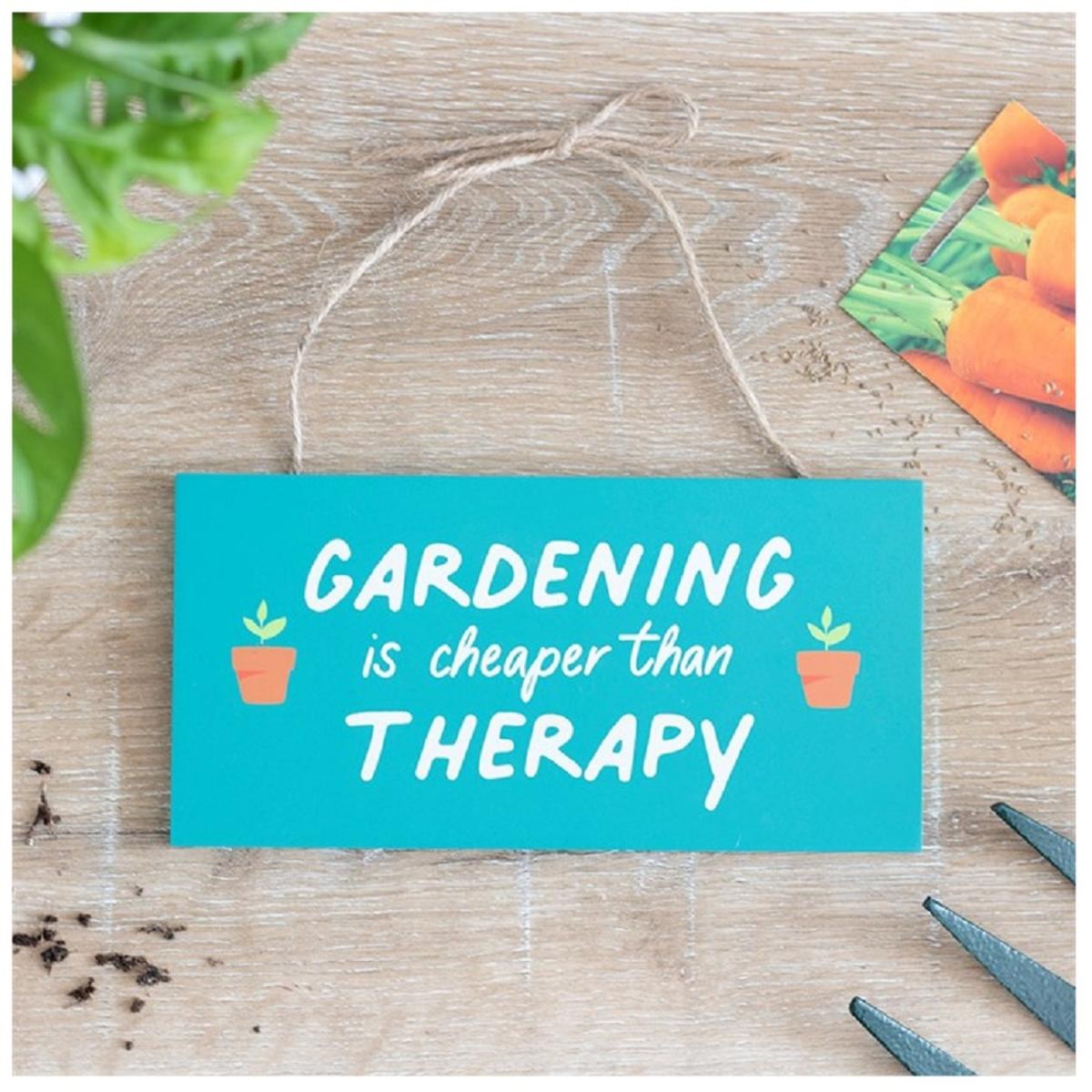 A fun decorative sign for the greenhouse, garden or shed which reads 'Gardening is cheaper than therapy'.