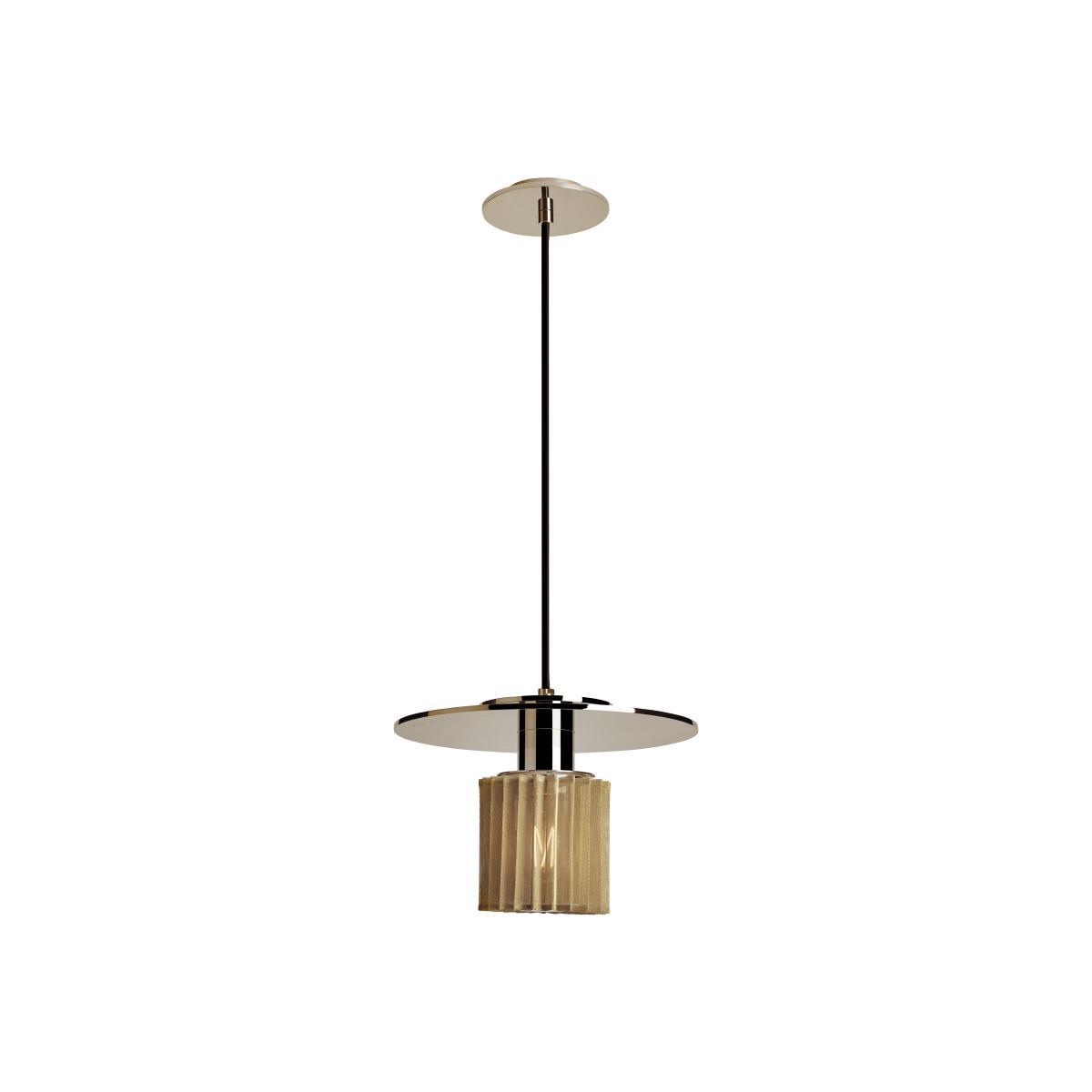 "Majestic, flamboyant light. During the refurbishment of the Château de Versailles' Dufour Pavilion, architect Dominique Perrault and designer Gaëlle Lauriot-Prévost, created the "In the sun" collection in homage to the Sun King. A radiant collection with golden and silver colours, which picks up on the stylised form of the sun, the emblem of the monarch. The In the Sun pendant shines with presence and elegance. It is made up of a tinted aluminium disk as smooth and radiant as a mirror in which the diffuser is reflected in the shape of the sun. The diffuser is glass, surrounded by a steel sheet mesh: it diffuses a direct light down that’s filtered through the mesh, drawing beautiful light beams in space. With "In the sun", the magic takes over your interior. From the lit room a chic and sumptuous atmosphere is born. ".