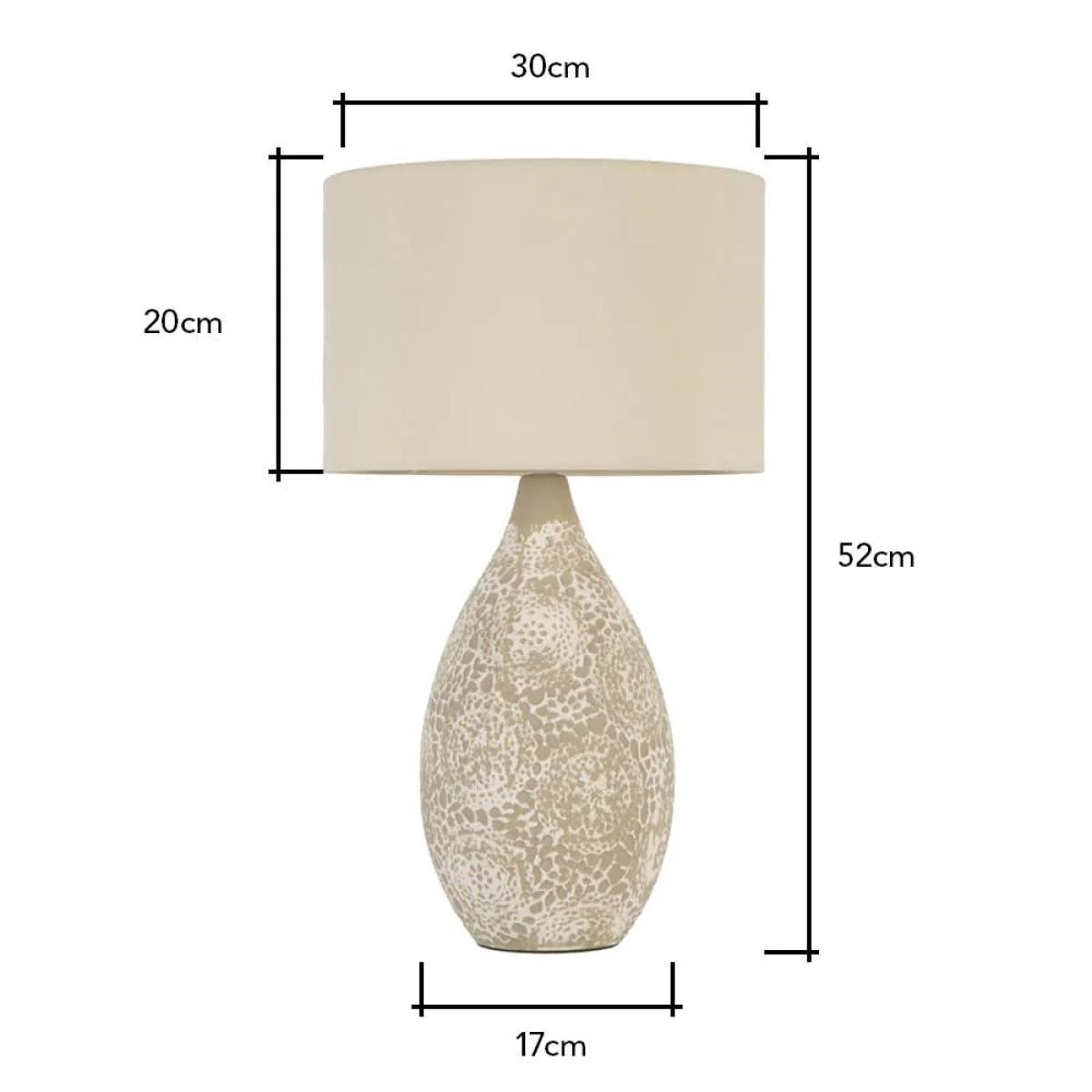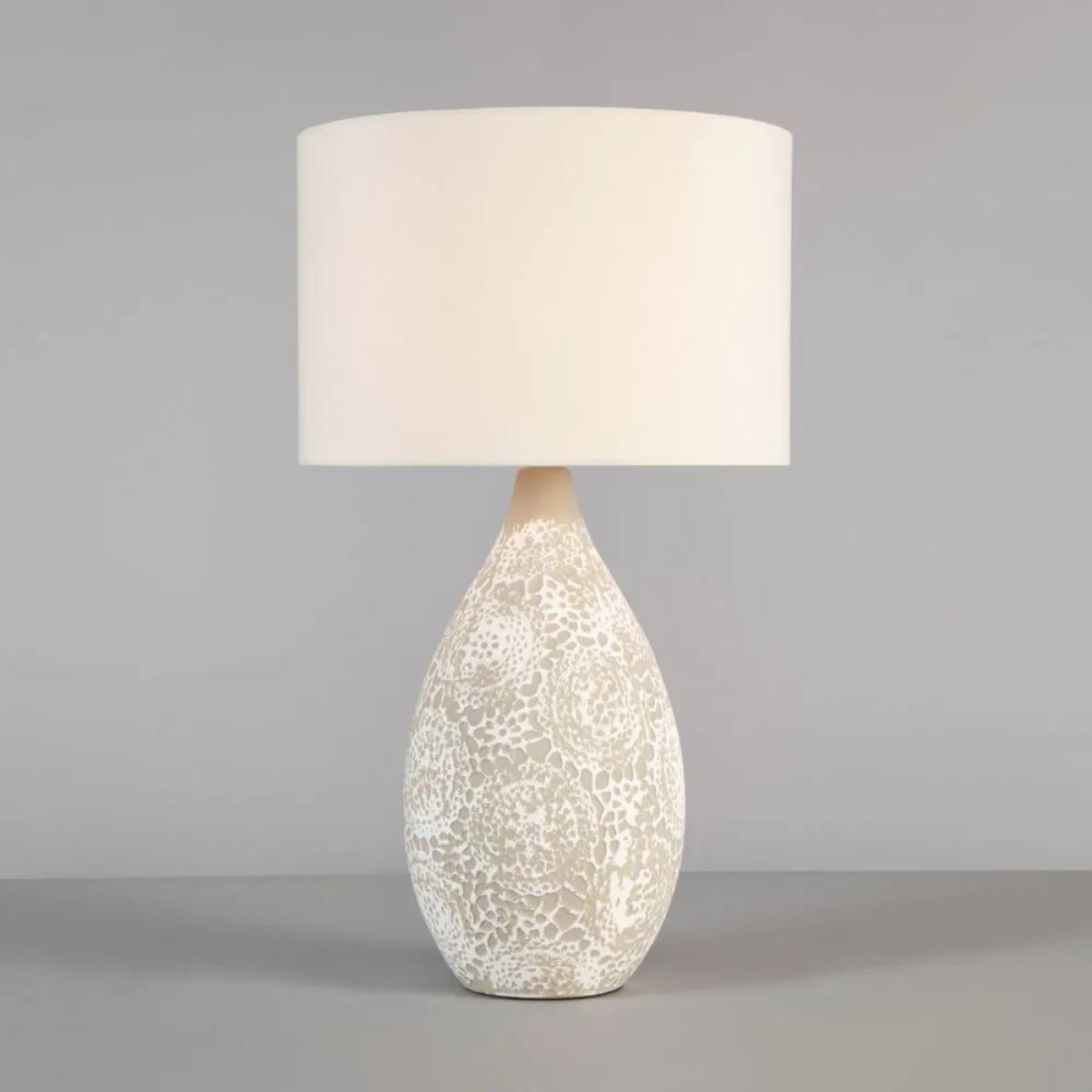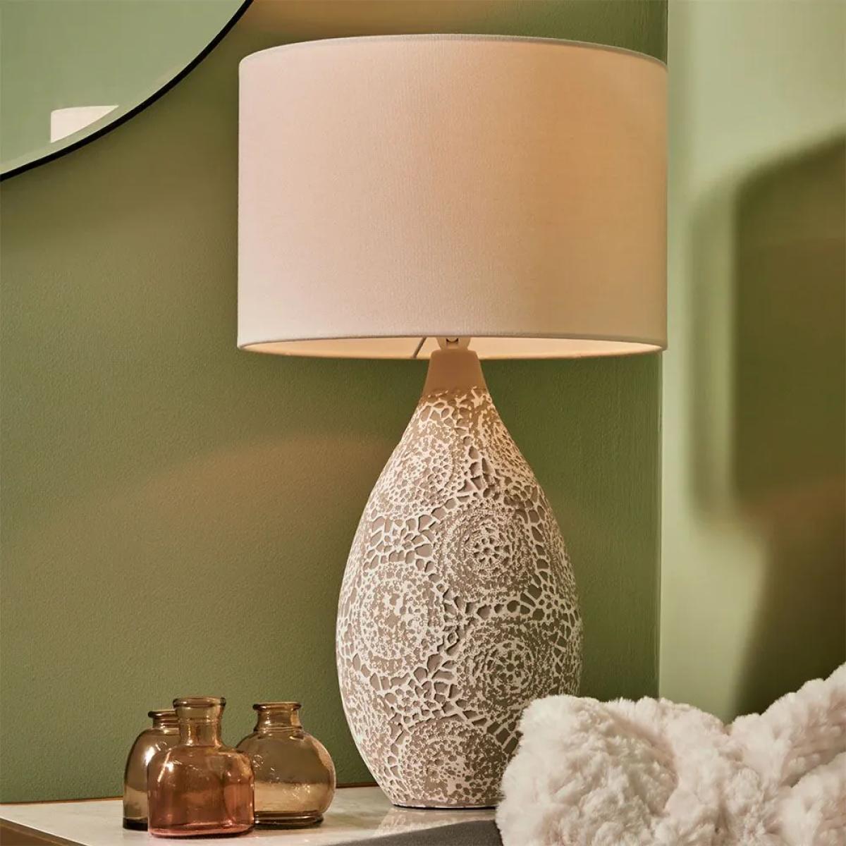 Bring a rustic feel to your home décor with the Inar Ceramic Table Lamp. This table lamp features a painted white doily-inspired etched design for a handcrafted aesthetic that looks ideal in neutral colour schemes. It also comes in a natural finish with a vase shaped based and a natural linen lampshade which diffuses a gorgeous warm glow into the room, ideal for styling on bedside tables in boho interior design.