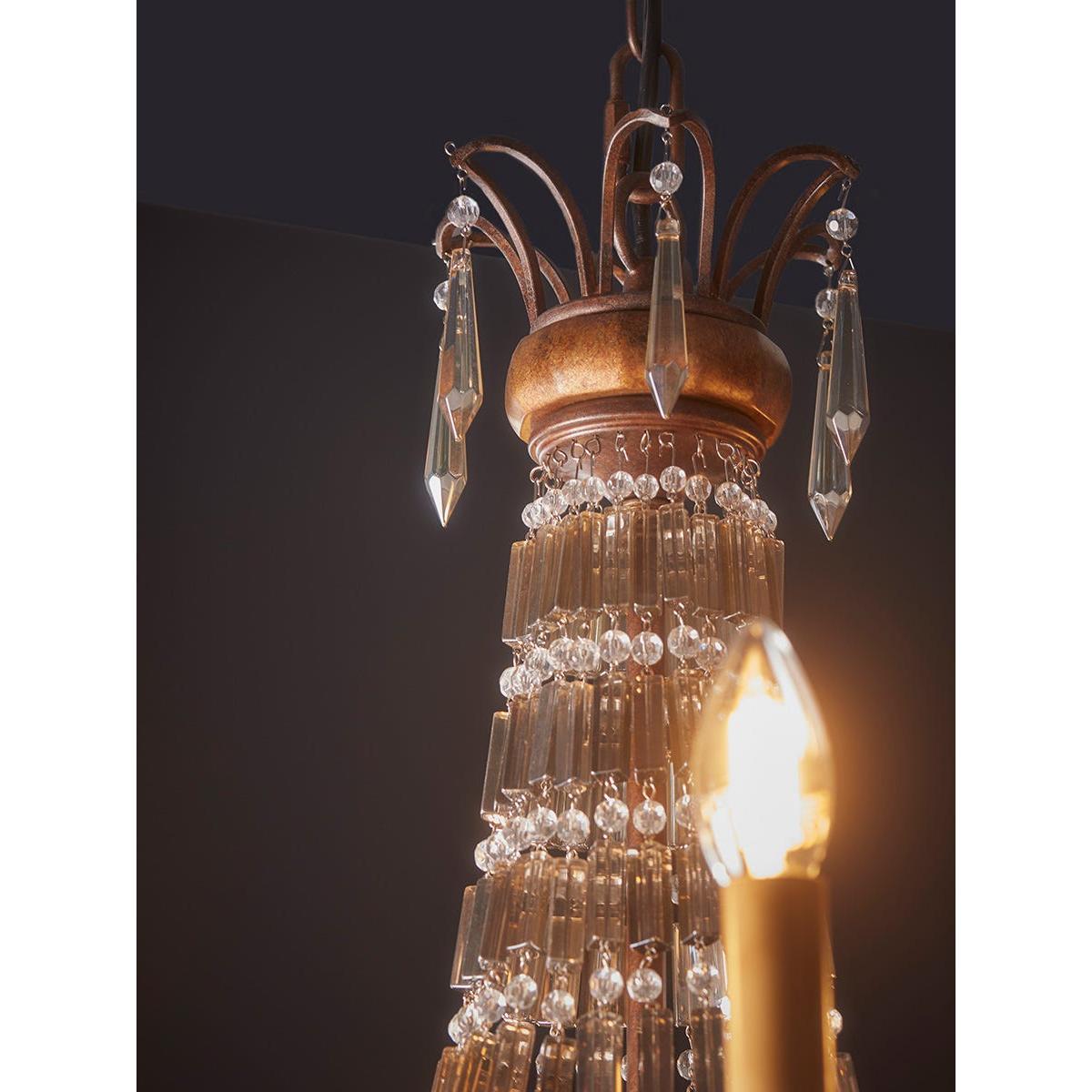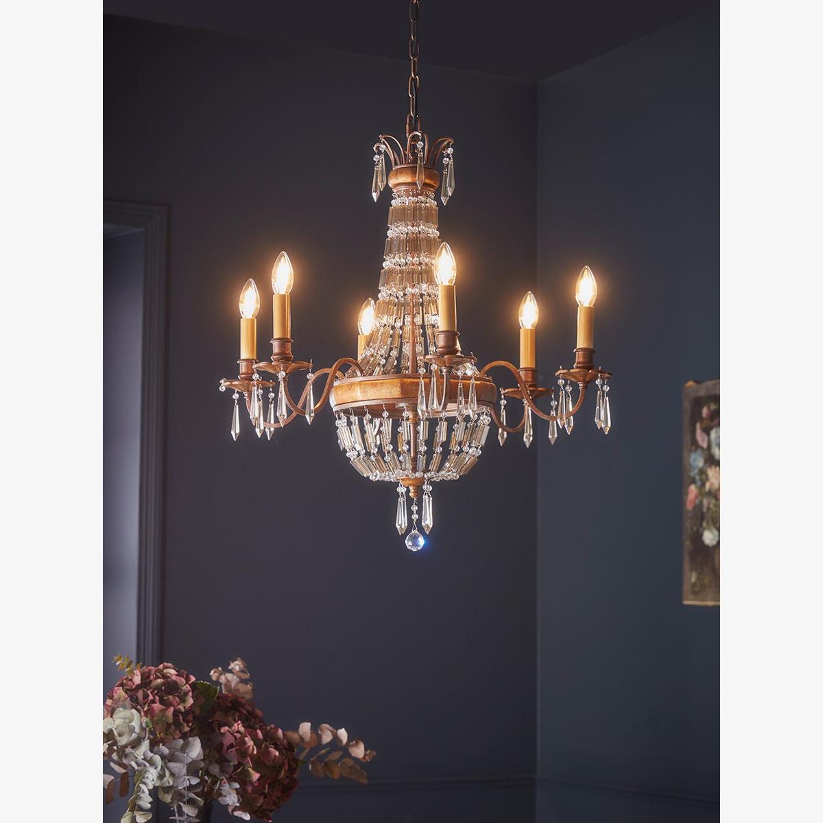 Full of Baroque opulence, our Inaya Chandeliers are overflowing with old world Italian glamour. These stunning light fittings have a decadent bronze finish and are dressed with antiqued quartz crystals that will dance beneath the light and cast magnificent patterns across your walls and ceiling. Our large chandelier features six lamp holders, supported on upturned arms and held by cleverly aged candle tubes which add to the romance. Our small Inaya Chandelier features four lights. Discover how to create the perfect lighting scheme for your home using our Lighting Buying Guide.