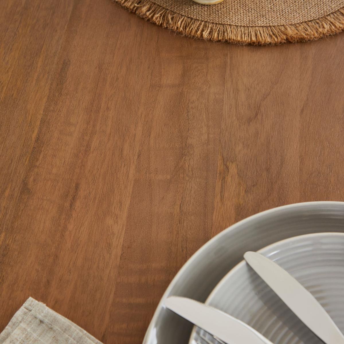 I love this dining table for its warm, natural mango wood finish that adds an inviting touch to both modern and rustic interiors. It works particularly well in Scandinavian, boho, or farmhouse-inspired spaces, where its earthy tone complements neutral palettes or vibrant accents. Practical styling tips include dressing the table with a simple runner or placemats to highlight its woodgrain, and pairing it with woven or rattan chairs for a cohesive look. Since the table's sturdy design offers durability, it also lends itself well to casual family meals or relaxed dinner parties, making it as functional as it is visually appealing.