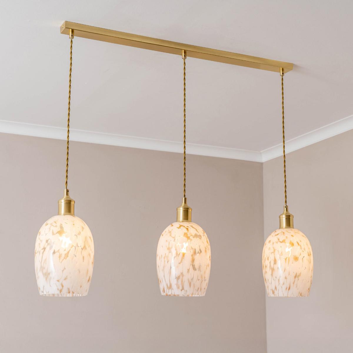 Time to celebrate your home decor with this brushed gold 3-drop bar ceiling light, complete with three stunning India confetti glass shades. The soft, cosy glow from the confetti pattern creates the ideal atmosphere, while the brushed gold finish adds a sprinkle of class. Whether you're entertaining guests or enjoying a quiet cuppa, this light brings effortless charm to any space. Perfect for kitchens, dining areas, or anywhere you need a little extra shine.