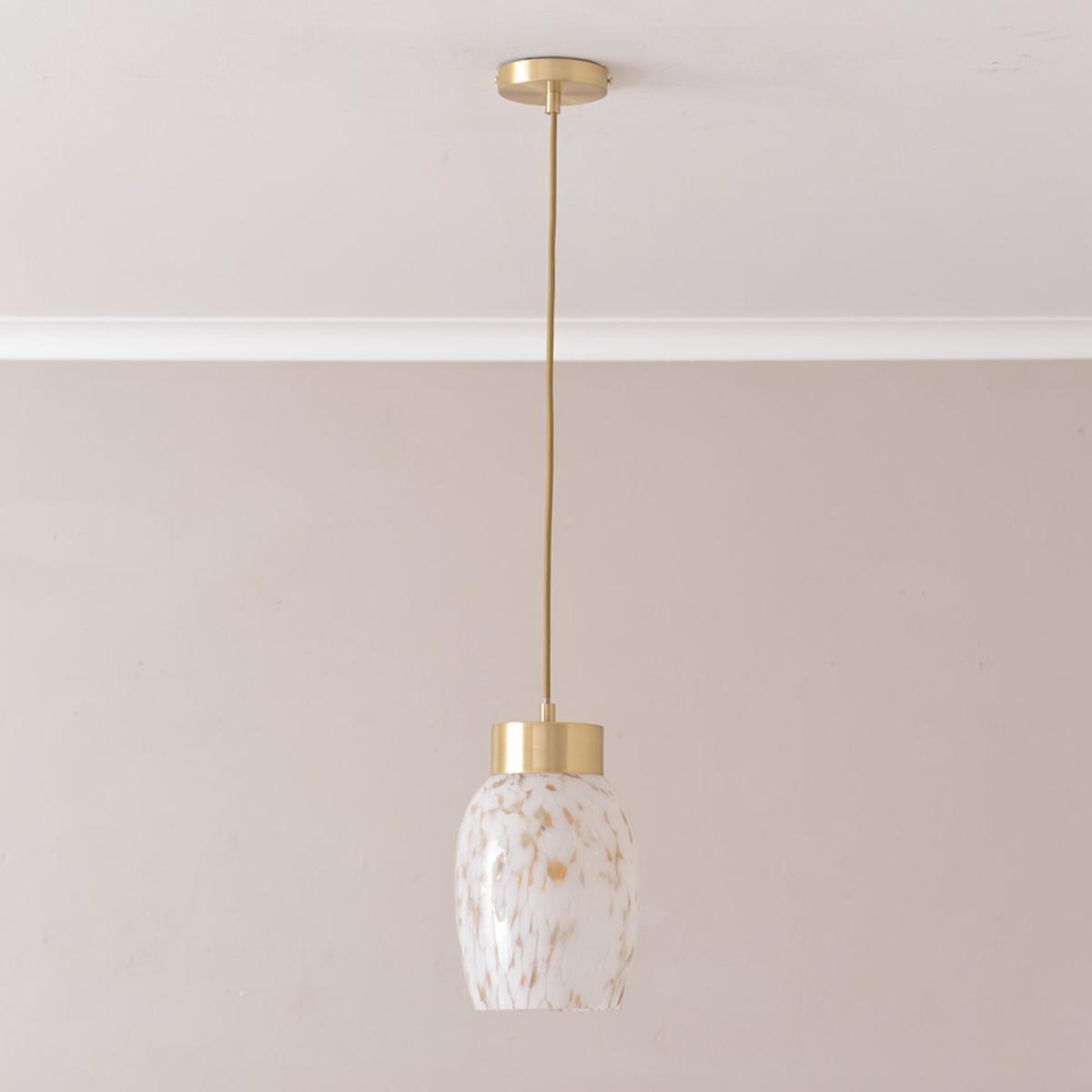 I really like this pendant light because of its elegant mix of brushed gold and the subtle, speckled glass. It works well in contemporary or even transitional interiors, adding a touch of understated luxury. Its delicate size makes it ideal for smaller spaces like kitchens or dining areas, but it can also serve as a statement piece above a side table or an island. Practical styling tips include grouping a few of these in a cluster for a more dramatic effect, or pairing it with other brass accents for a cohesive look. Keep the surrounding decor simple to let the light and the materials shine, and consider adjusting the height for optimal task lighting or ambience.