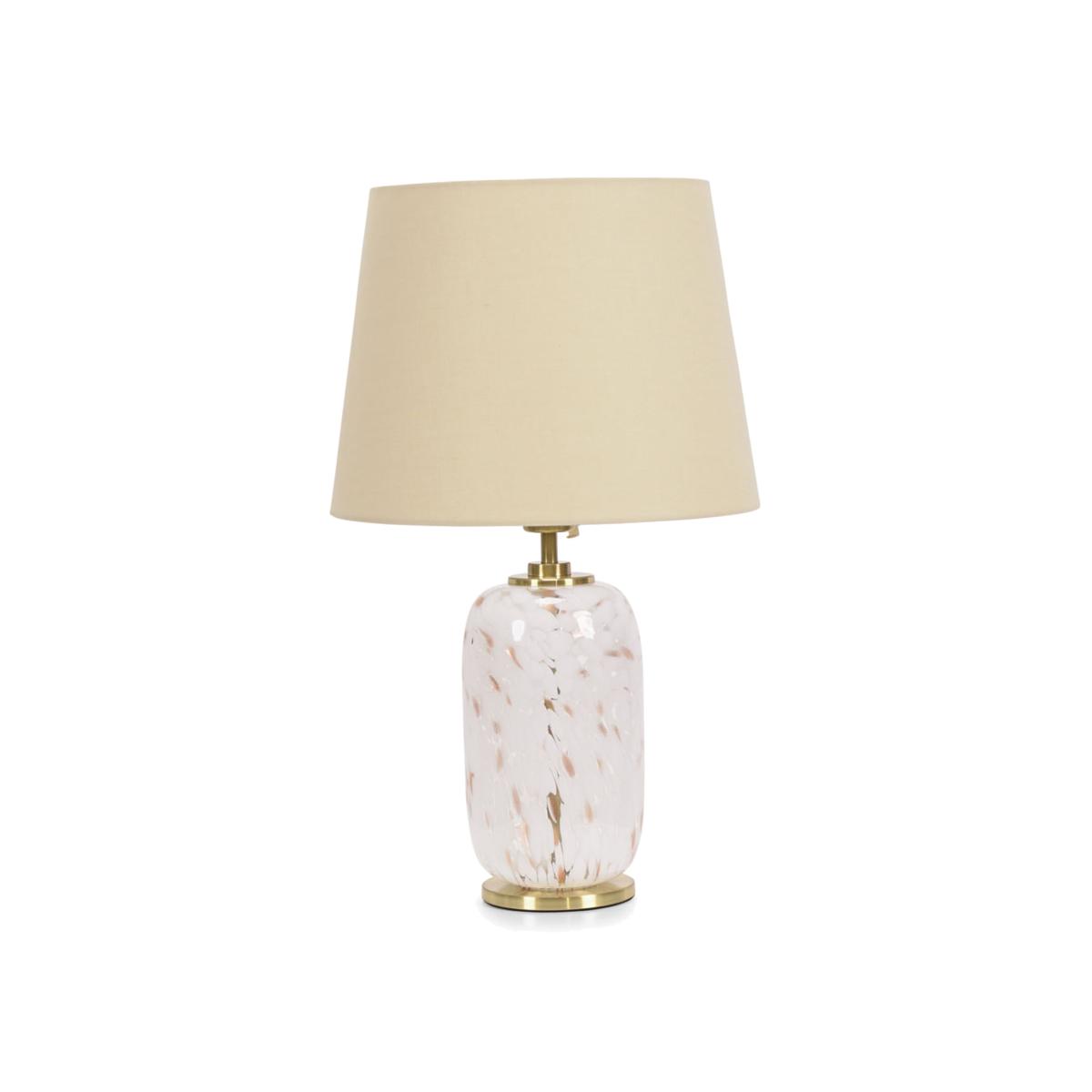 The India confetti glass table lamp in white takes the simplicity and timelessness of a classic lamp silhouette and injects some fun with confetti into the glass. Glass table lamp base with metal accents and a fabric shade. Featuring a rocker switch on a 150cm cable with a UK plug. Make a statement with all that space. Ideal for turning an empty side table into a moment. Best in living rooms, hallways and bedrooms. Requires 1x E27 bulb, personalise your lighting with your choice of warm, cool or smart bulb. All bulbs are LED by default. Doesn't require installation, just plug into any UK plug socket and get glowing! Comes with a 150cm cable for hard to reach plugs.