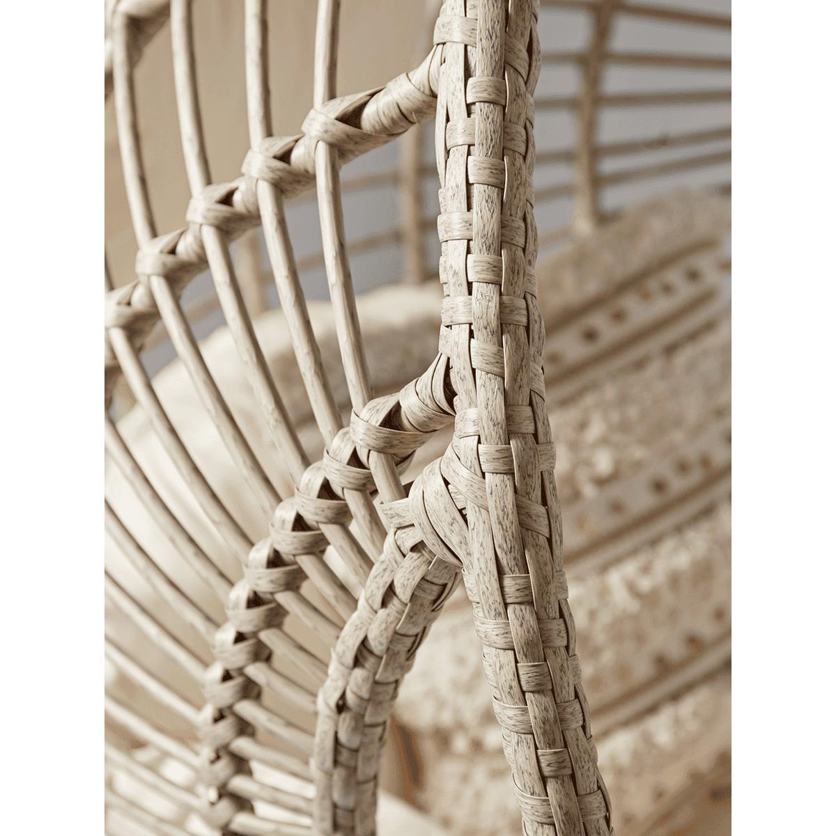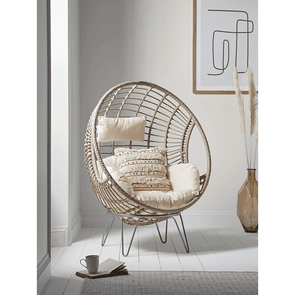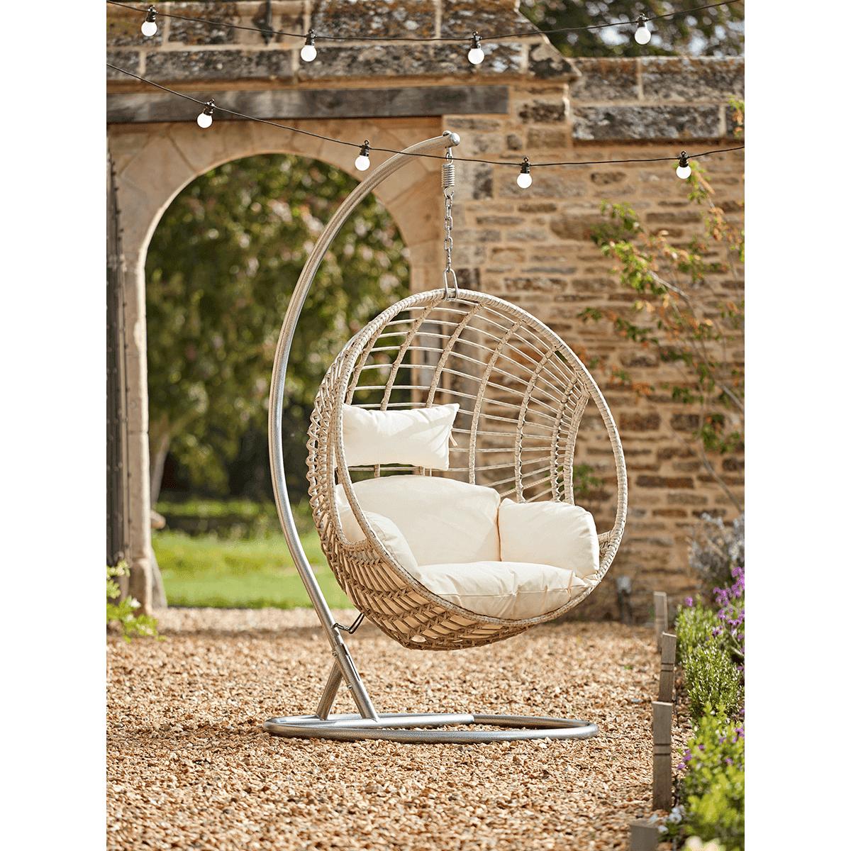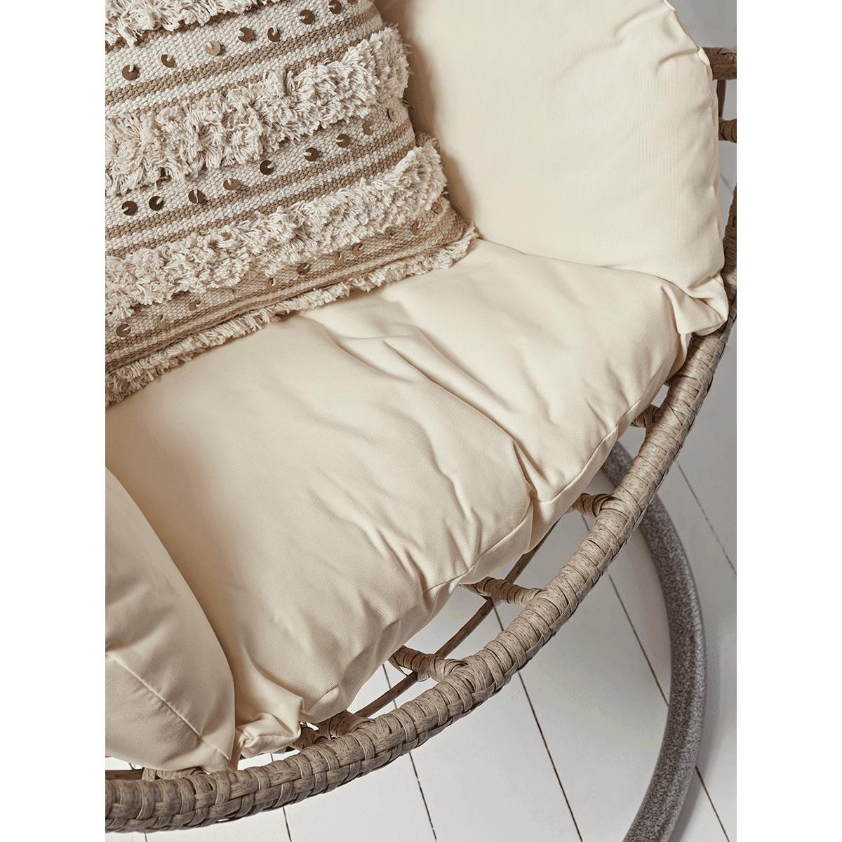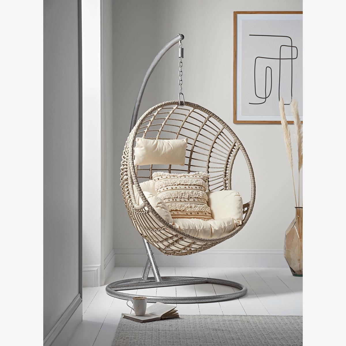 Made from durable materials that are virtually indistinguishable from light rattan, our impressive hanging chair has been intricately woven around a strong metal frame in a smooth, spherical shape. Big enough to snuggle up with a book and a cuppa, our stylish chair includes sumptuously filled tie-on cream headrest and seat cushions, the covers of which can be removed for storage and washing. Choose whether to hang your chair, or nestle it in its stand - either position will make a true impact in your space. Whether you gently swing, or simply cocoon, here’s a very magical place to spend some time, both indoors and outdoors.