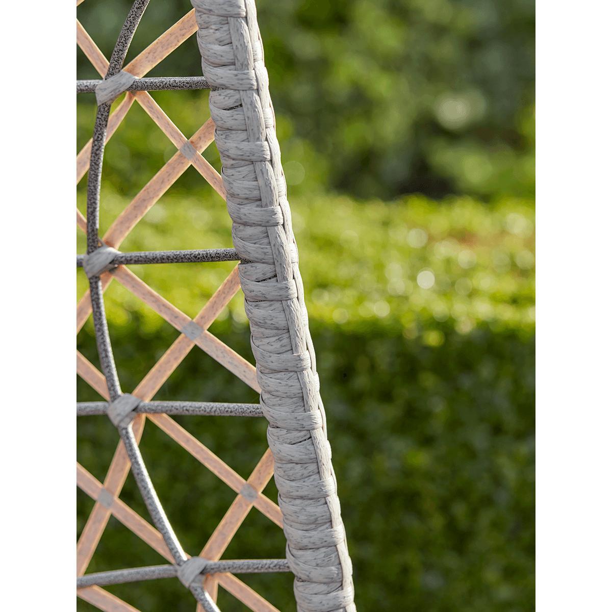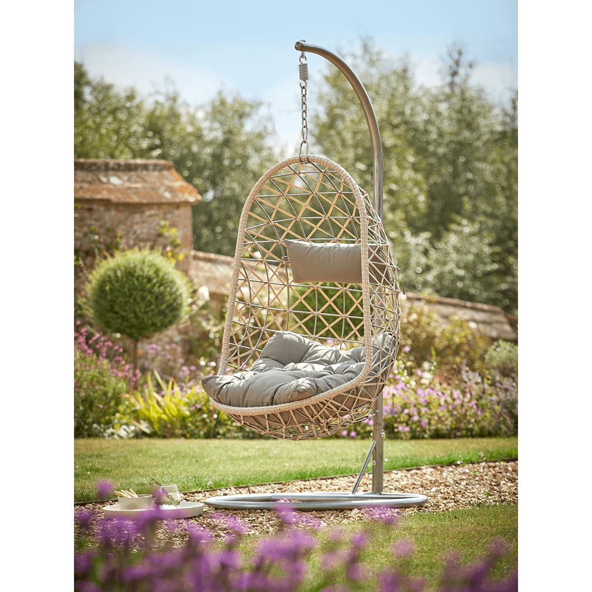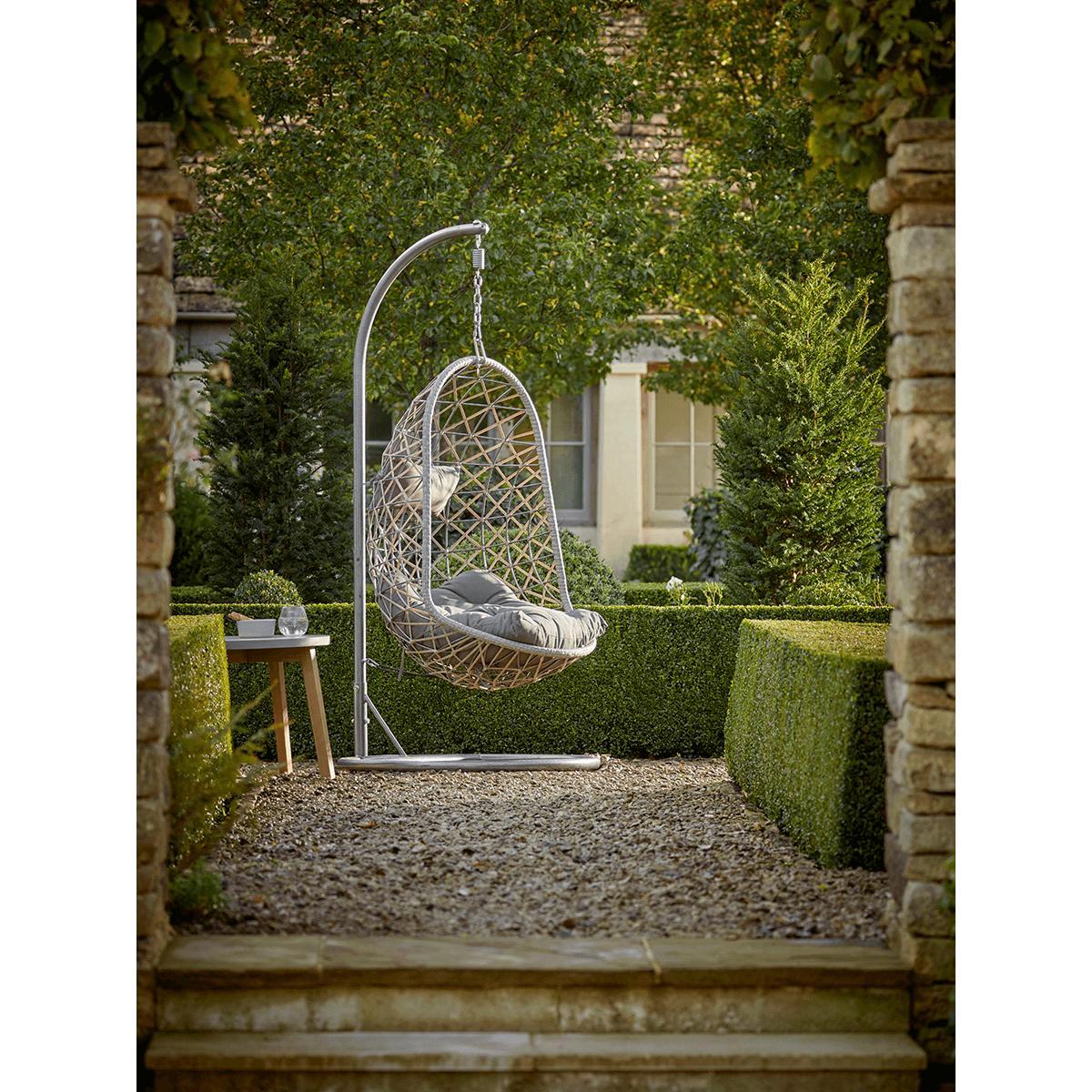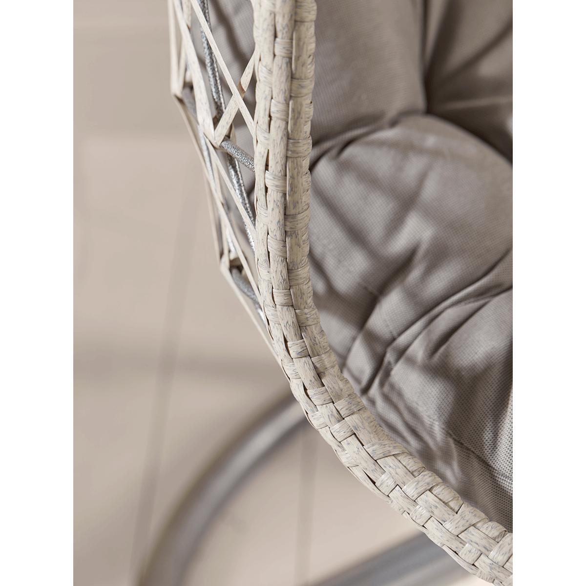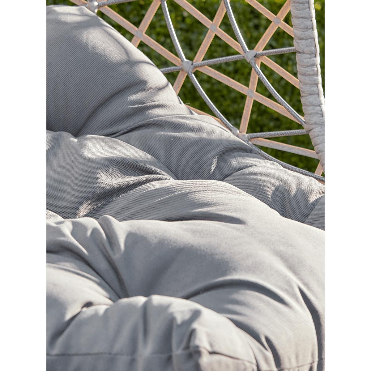 Perfect for more compact spaces, but with absolutely no concessions on comfort and style, our slender, oval-shaped hanging chair in grey has a weighty, circular frame for stability and a chain to hang the seat from. The seat itself is shaped perfectly for relaxing indoors or out, and includes two grey cushions with ties to attach to the open, faux wicker weave. Position the seat cushion and headrest to suit you, then recline in style. Please note: This chair comes with the grey headrest and seat cushions pictured.