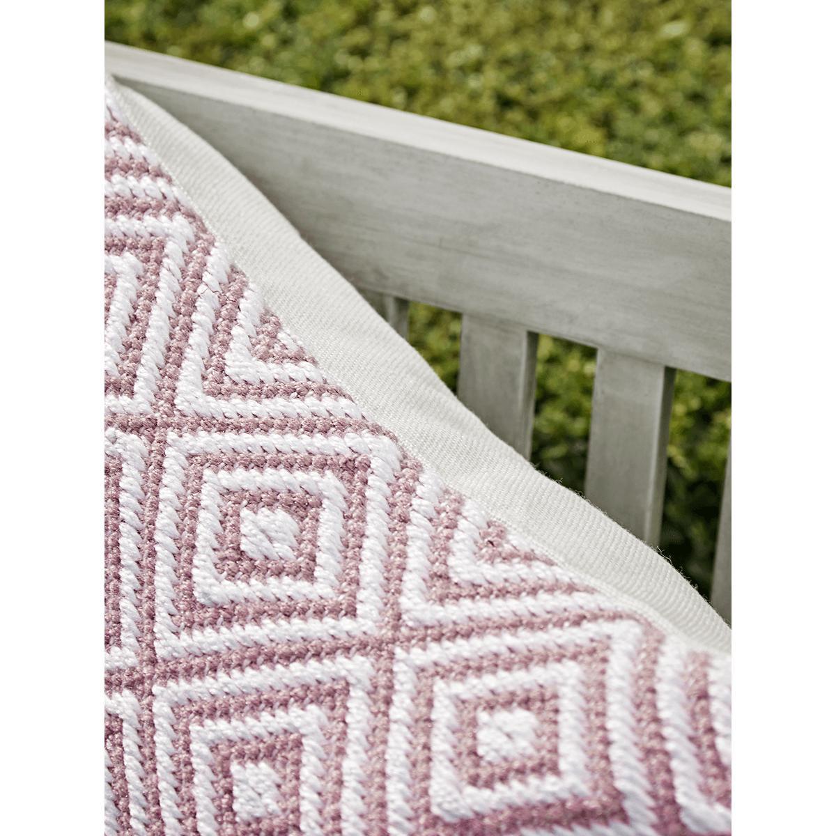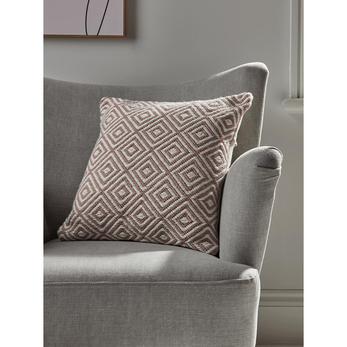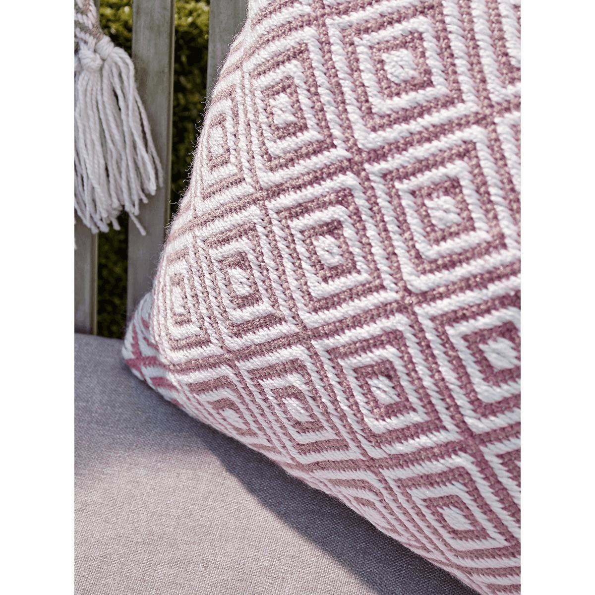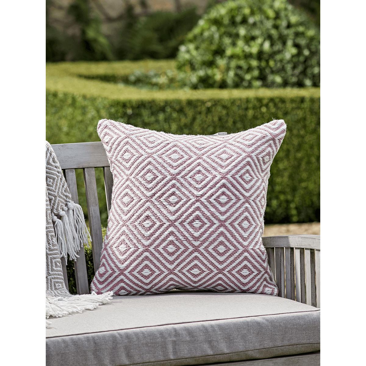 With a gorgeous, geometric square pattern in soft blush, our versatile cushion will help you to add texture and style to your outdoor space. Each is handwoven, with a soft look and feel, perfect for adding a decorative touch to your outdoor furniture. A matching. Throw. And. Rug. Are also available.