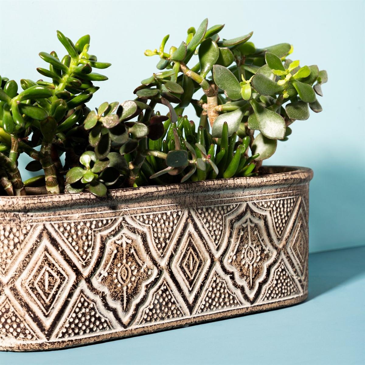 This geometric pattern trough is perfect for housing small plants around the home. Features a colourway of light brown tones. Great for windowsills or shelving. By Sass & Belle.