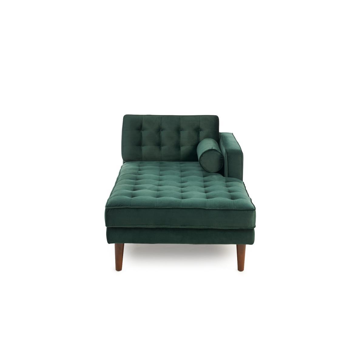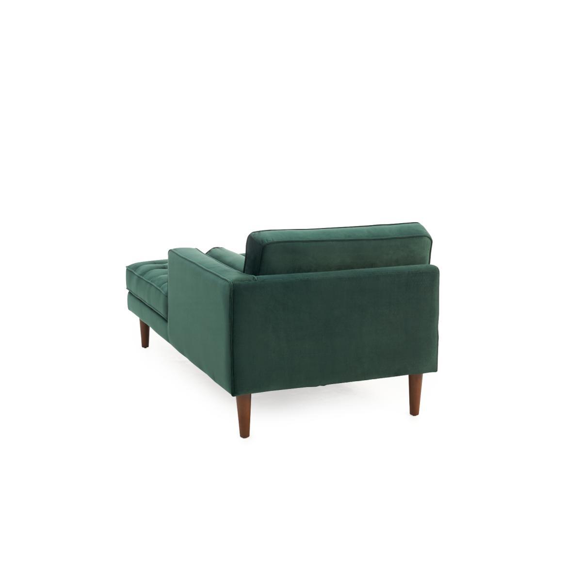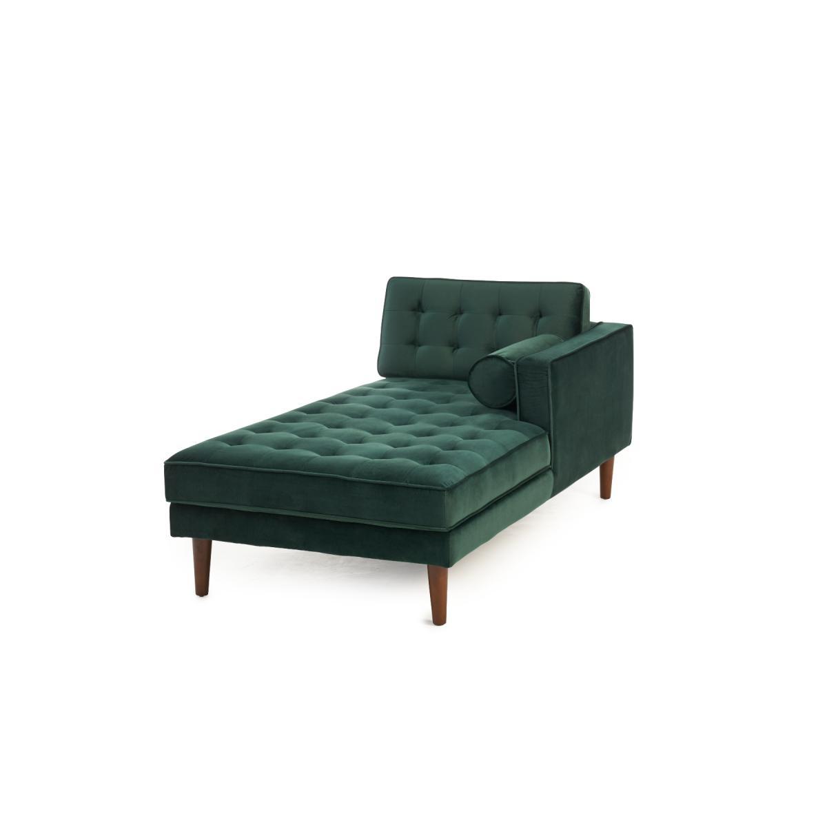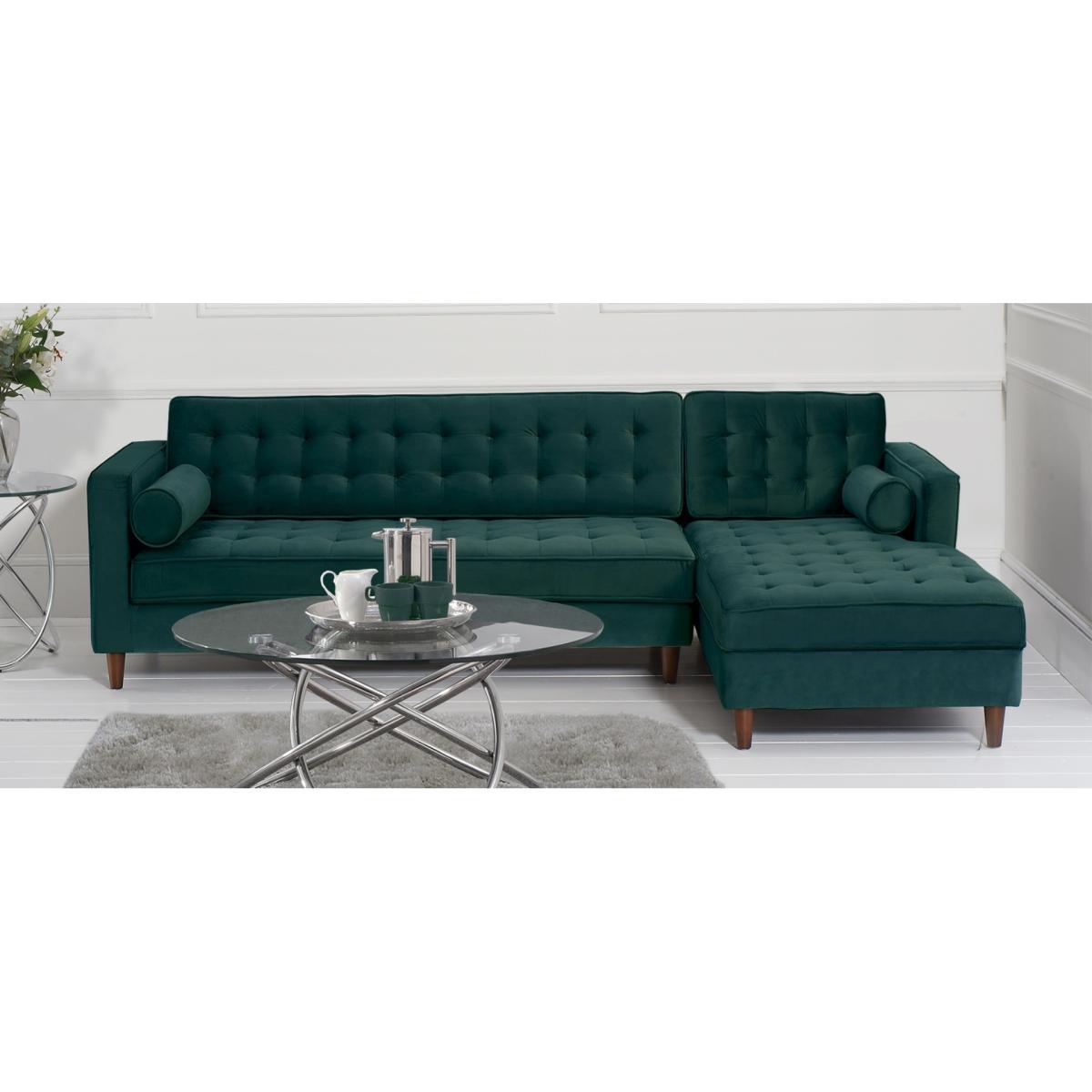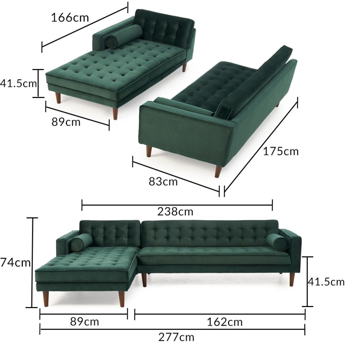 The Indus Green Velvet Left Facing Chaise Sofa makes a stylish impression in any home. Featuring clean modern lines and a retro deep buttoned design, the chaise sofa effortlessly blends comfort and style. The Left facing chaise sofa is upholstered in smooth rich green velvet for an eye-catching look that makes the Indus a true statement piece. For a comfortable sit, the sofa boasts deep foam filled seats. Also available in a Right Facing Option Note: Sofa height is 61cm without back cushions.