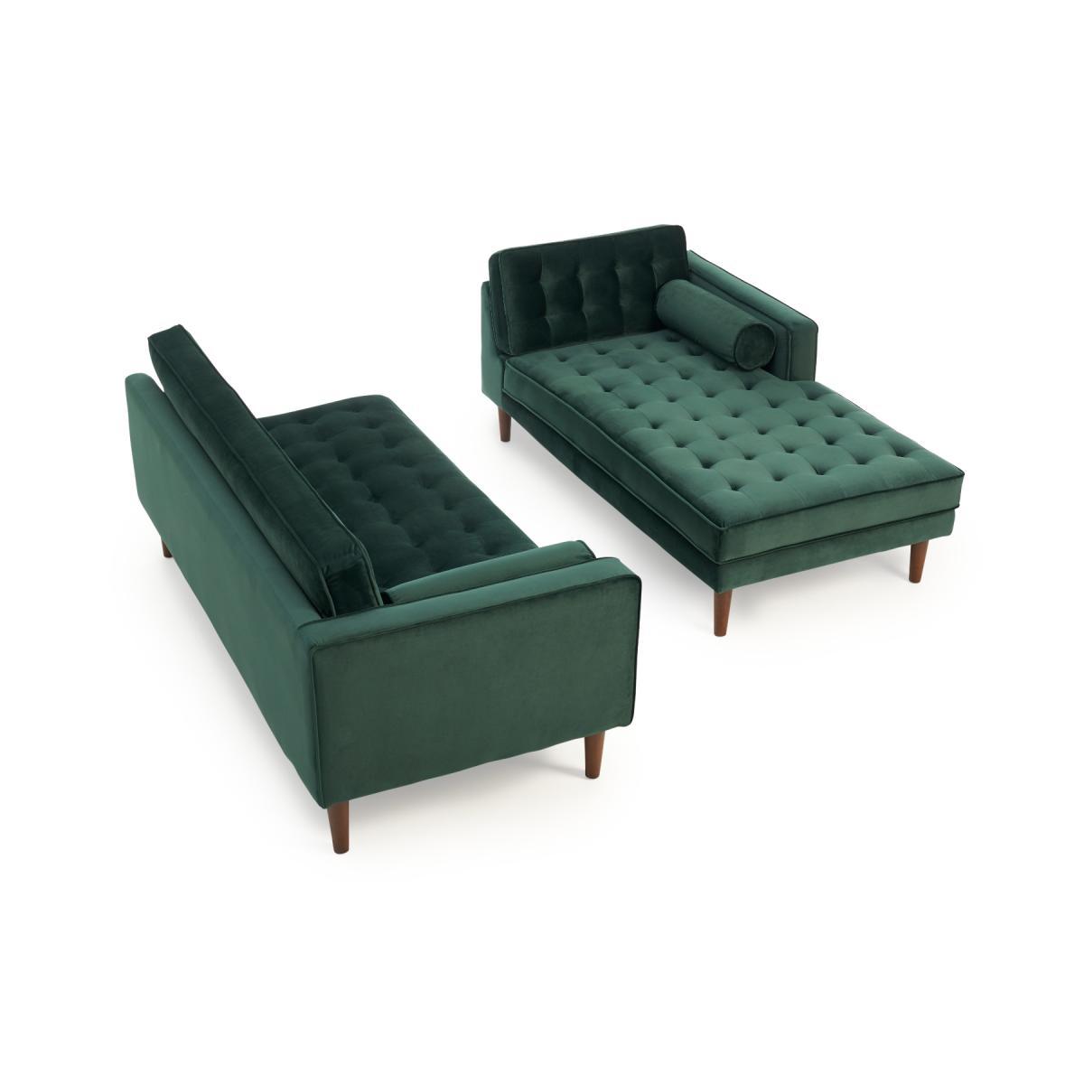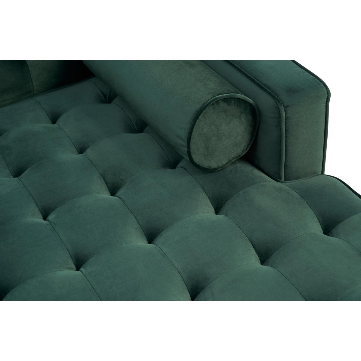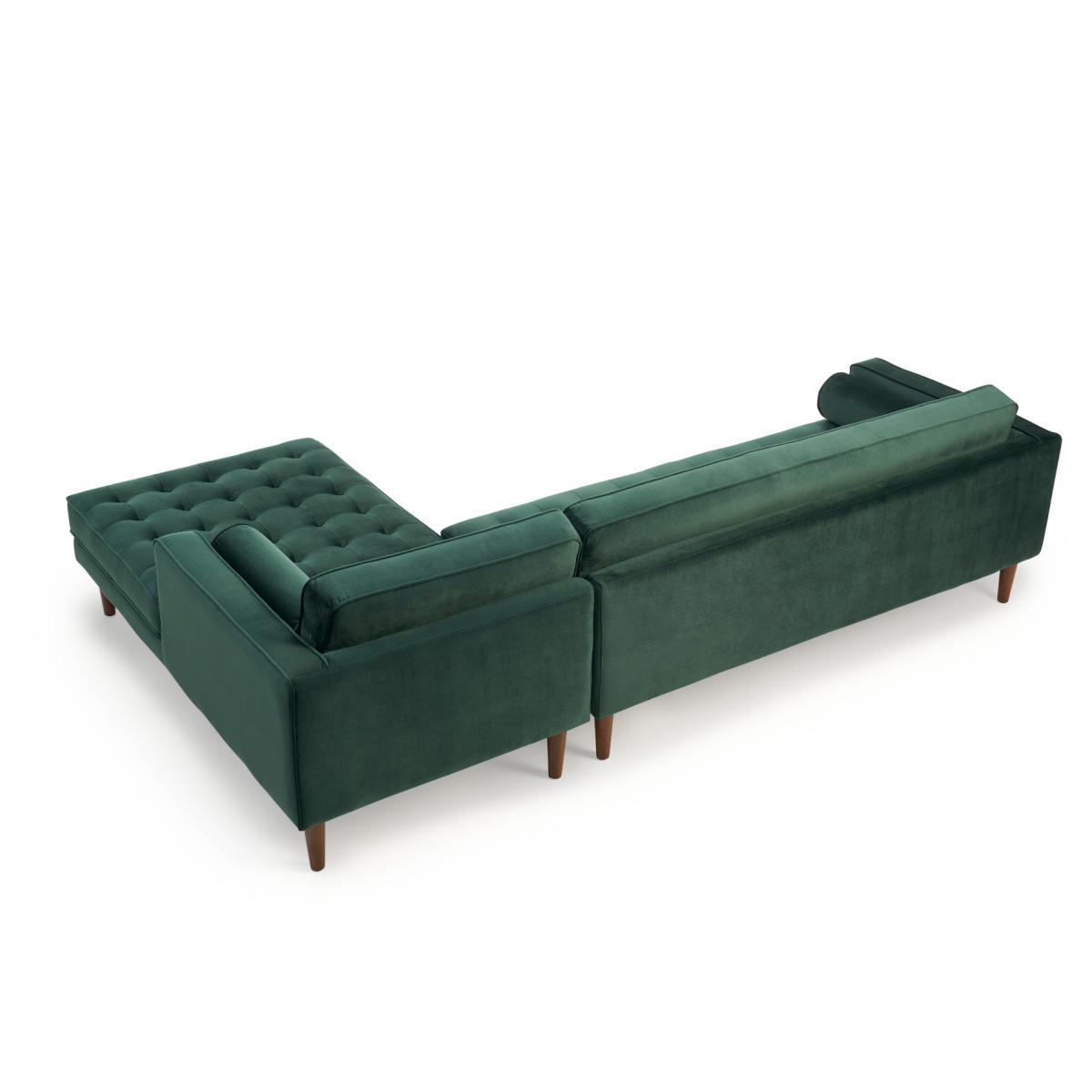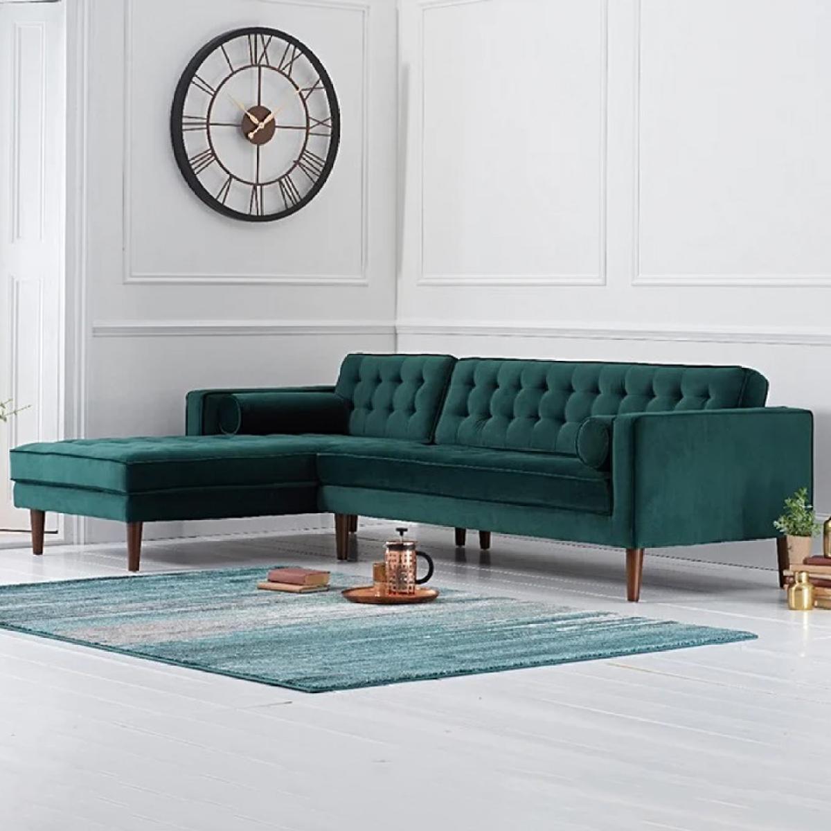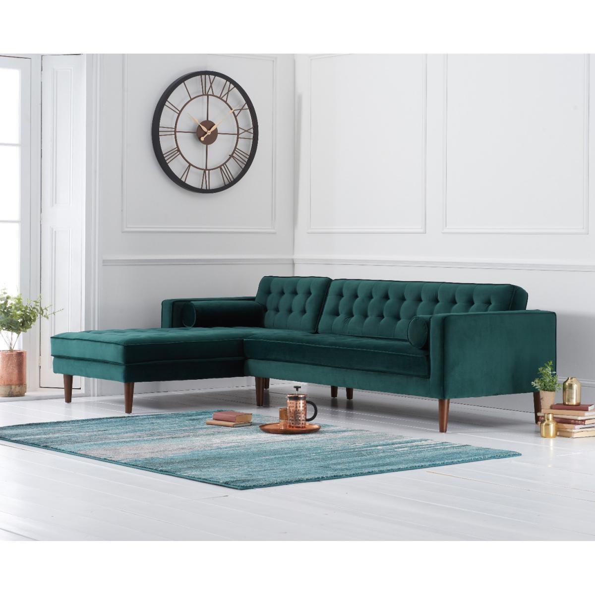 The Indus Green Velvet Left Facing Chaise Sofa makes a stylish impression in any home. Featuring clean modern lines and a retro deep buttoned design, the chaise sofa effortlessly blends comfort and style. The Left facing chaise sofa is upholstered in smooth rich green velvet for an eye-catching look that makes the Indus a true statement piece. For a comfortable sit, the sofa boasts deep foam filled seats. Also available in a Right Facing Option Note: Sofa height is 61cm without back cushions.