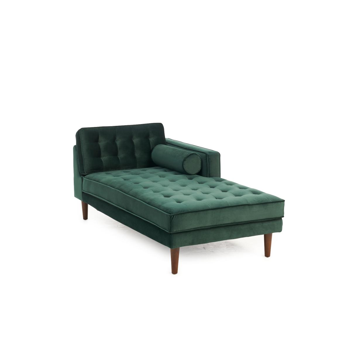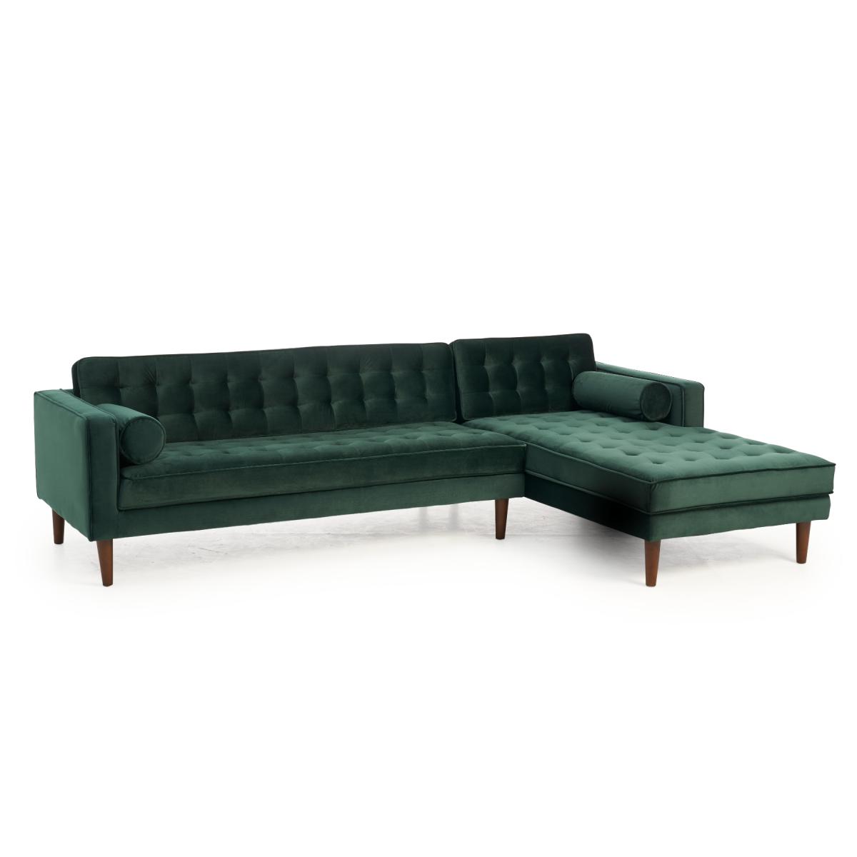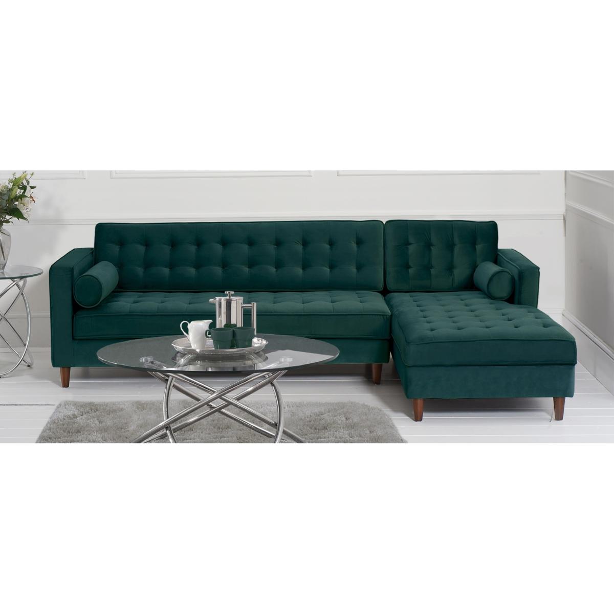 The Indus Green Velvet Right Facing Chaise Sofa makes a stylish impression in any home. Featuring clean modern lines and a retro deep buttoned design, the chaise sofa effortlessly blends comfort and style. The right facing chaise sofa is upholstered in smooth rich green velvet for an eye-catching look that makes the Indus a true statement piece. For a comfortable sit, the sofa boasts deep foam filled seats. Also available in a Left Facing Option Note: Sofa height is 61cm without back cushions.