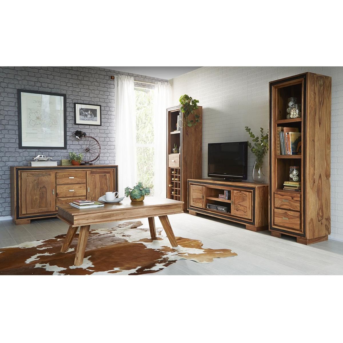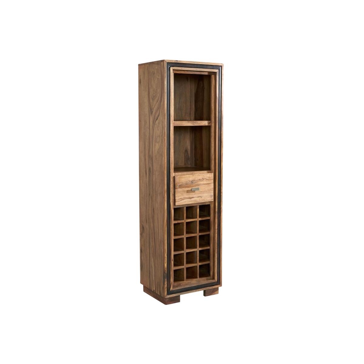 Solid Grade A Sheesham wood wine bookcase with one drawer and 2 shelves. Handcrafted by skilled craftsmen in India from solid grade A Sheesham wood, this range is eco-friendly, with a contemporary design. It has a natural Sheesham tone with natural wood variations and darker edges.