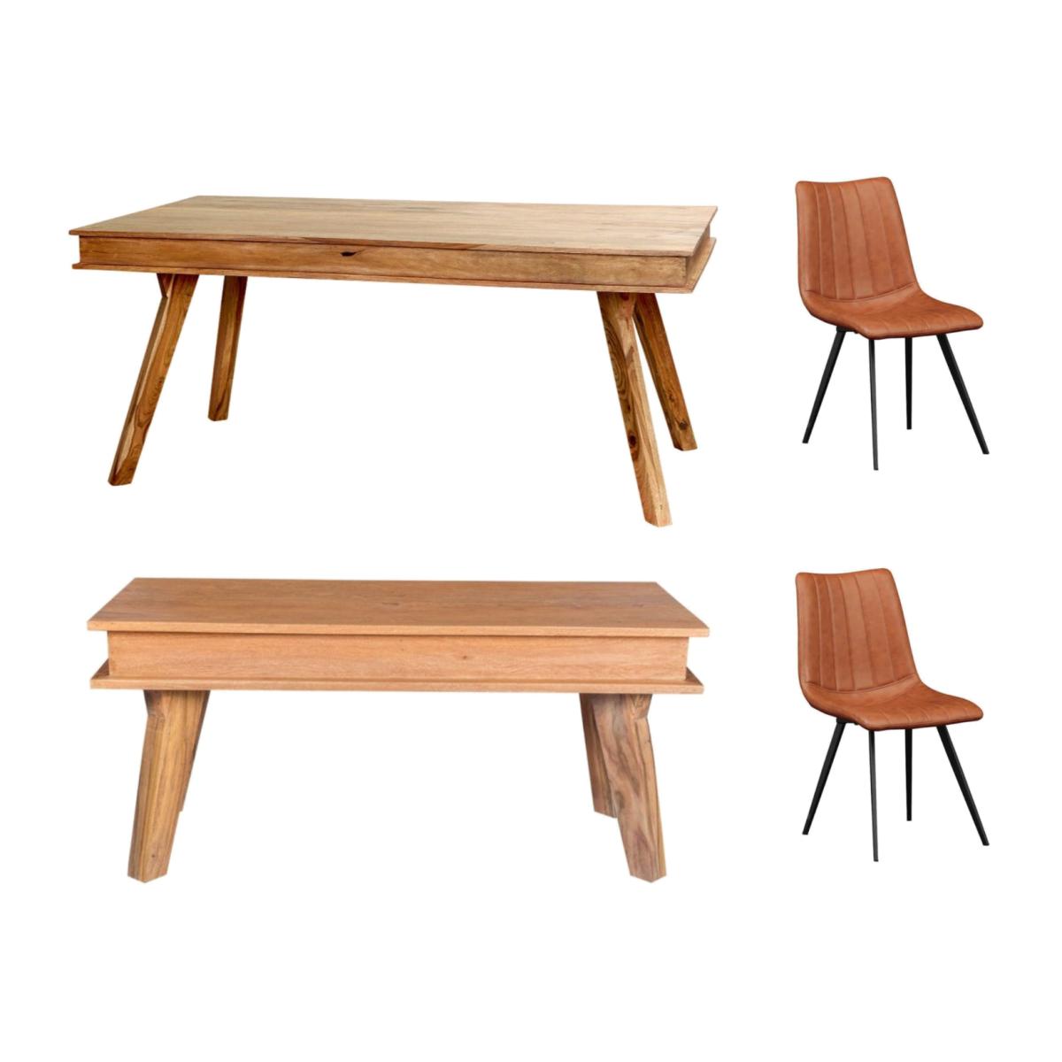 This Indus Sheesham Table Set has 1 dining table, 2 chairs, and 1 bench. Handcrafted by experienced artisans in India, the set is made of Grade A Sheesham wood, offering an eco-friendly, contemporary design. The natural sheesham color has unique wood variations. The chairs offer a modern aesthetic with vertical accent stitching and a soft vegan leather seat for comfort. The bench is made of 100 Sheesham wood, partially assembled and featuring a natural tone with dark edges. Brand new and boxed.
