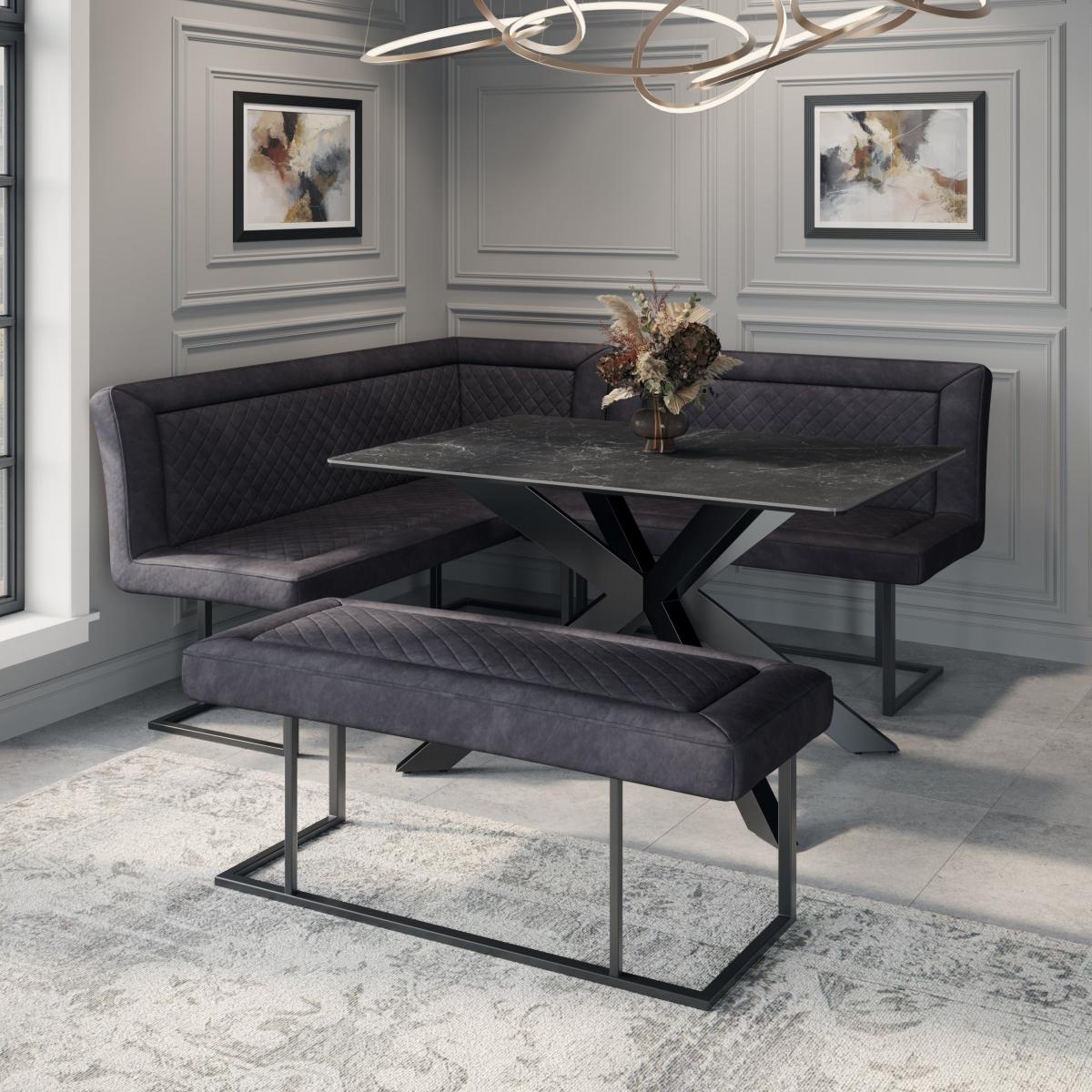 * Seats up to 6 people* Choice of black or grey ceramic effect top* Velvet upholstered benches with diamond stitching* Perfect for cosy dining room vibes The Indus Valley 6 Seater Dining Table Corner Bench Set adds a touch of sophistication to your dining room. This set features a choice of a stylish black or grey ceramic effect top, complemented by sleek black powder-coated metal legs. The matching benches, upholstered in plush velvet with diamond stitching, are perfect for family dinners and catch-up chats with friends. Elevate your dining experience with this blend of style and comfort. Please note we are unable to deliver this item to Northern Ireland.