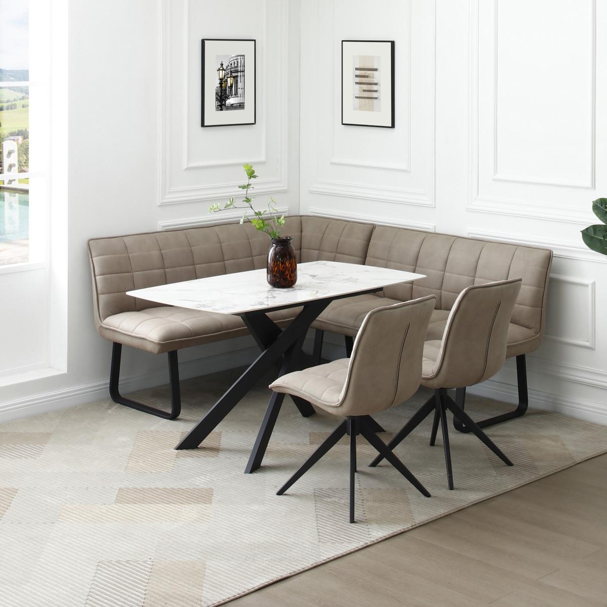 * 6 Seater table* Marble effect ceramic top* Powder coated metal legs* 6 x upholstered chairs included Featuring a stunning ceramic top with a marble effect, this dining table is supported by starburst black iron legs that add a modern touch to your space. The matching corner bench and chairs, upholstered in soft taupe fabric, offer both comfort and style. Designed to seat up to 6 people, this set is ideal for cosy, kitchen-diner vibes, making it the perfect choice for family dinners and casual gatherings. Please note we are unable to deliver this item to Northern Ireland.