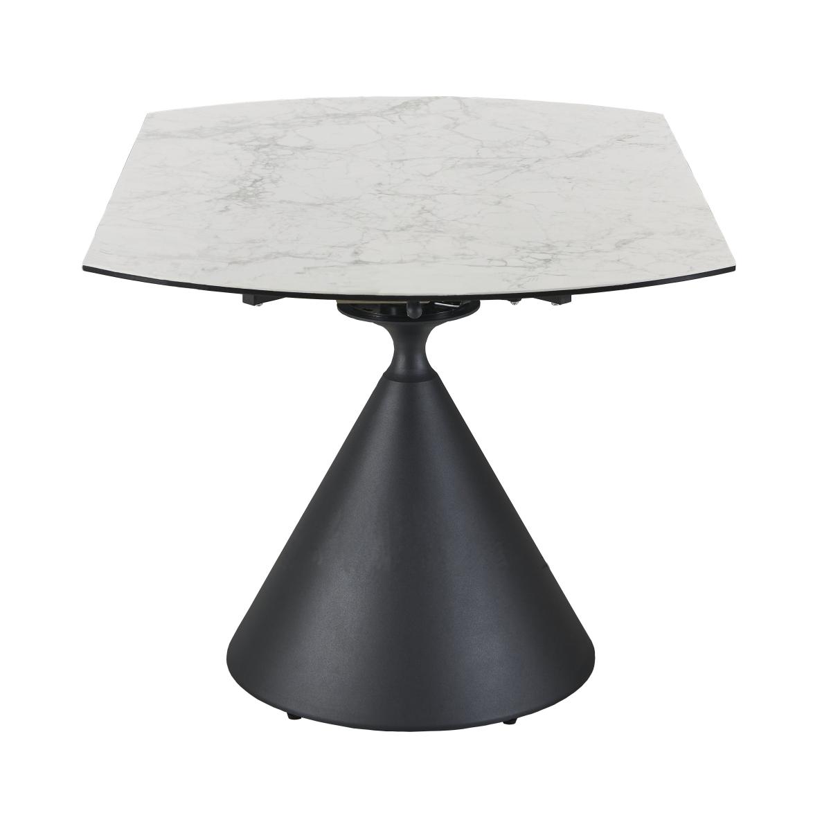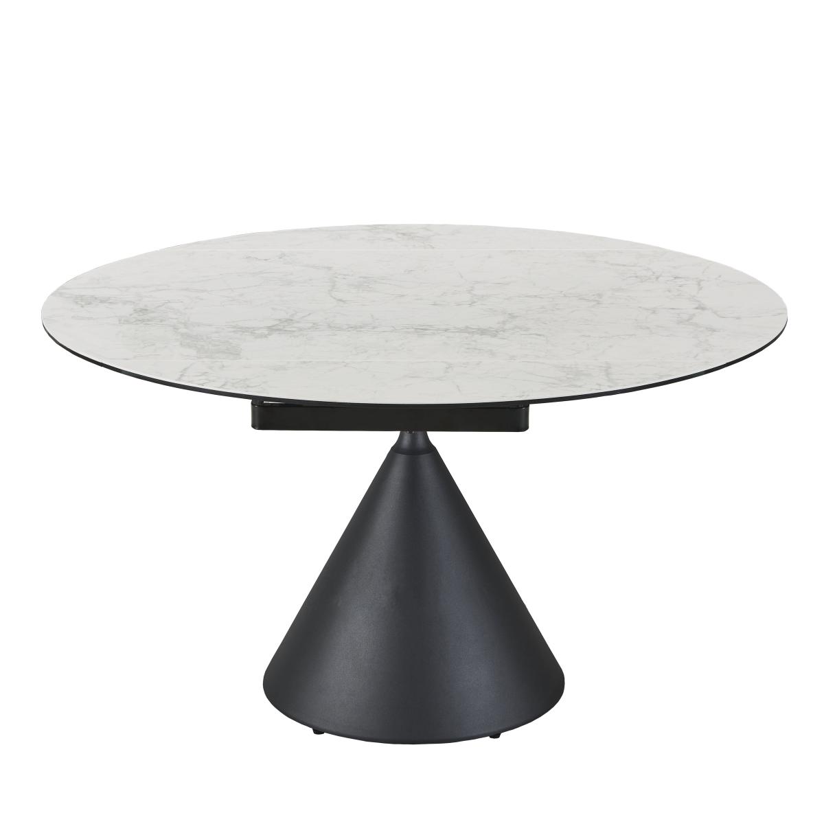 * 1 x Dining Table and 4 x Dining chairs * Ceramic table top with marble effect finish * Black Metal legs * Foam filled seat This well-balanced dining set brings together sculptural design and smart practicality. The round ceramic tabletop showcases a marble-effect finish, supported by a bold conical base that adds presence without overpowering the room. The real showpiece, though, is the smooth extension function that expands the table from 80cm to 130cm, offering flexibility for guests or larger meals. It's paired with four aura chairs, upholstered for comfort and subtly curved for a relaxed feel.