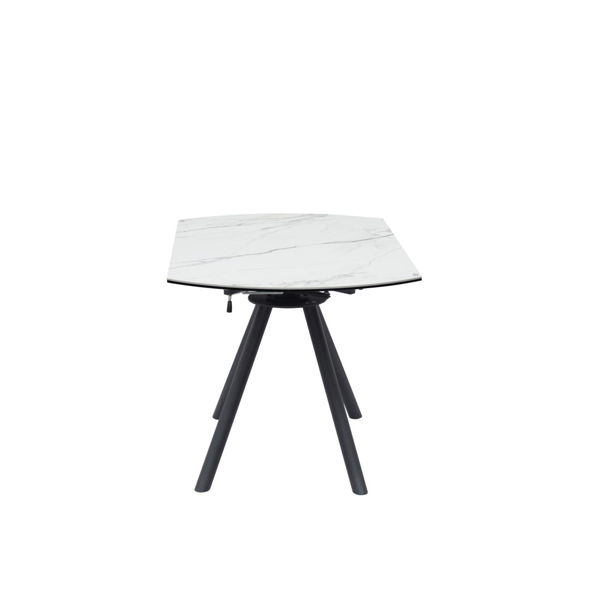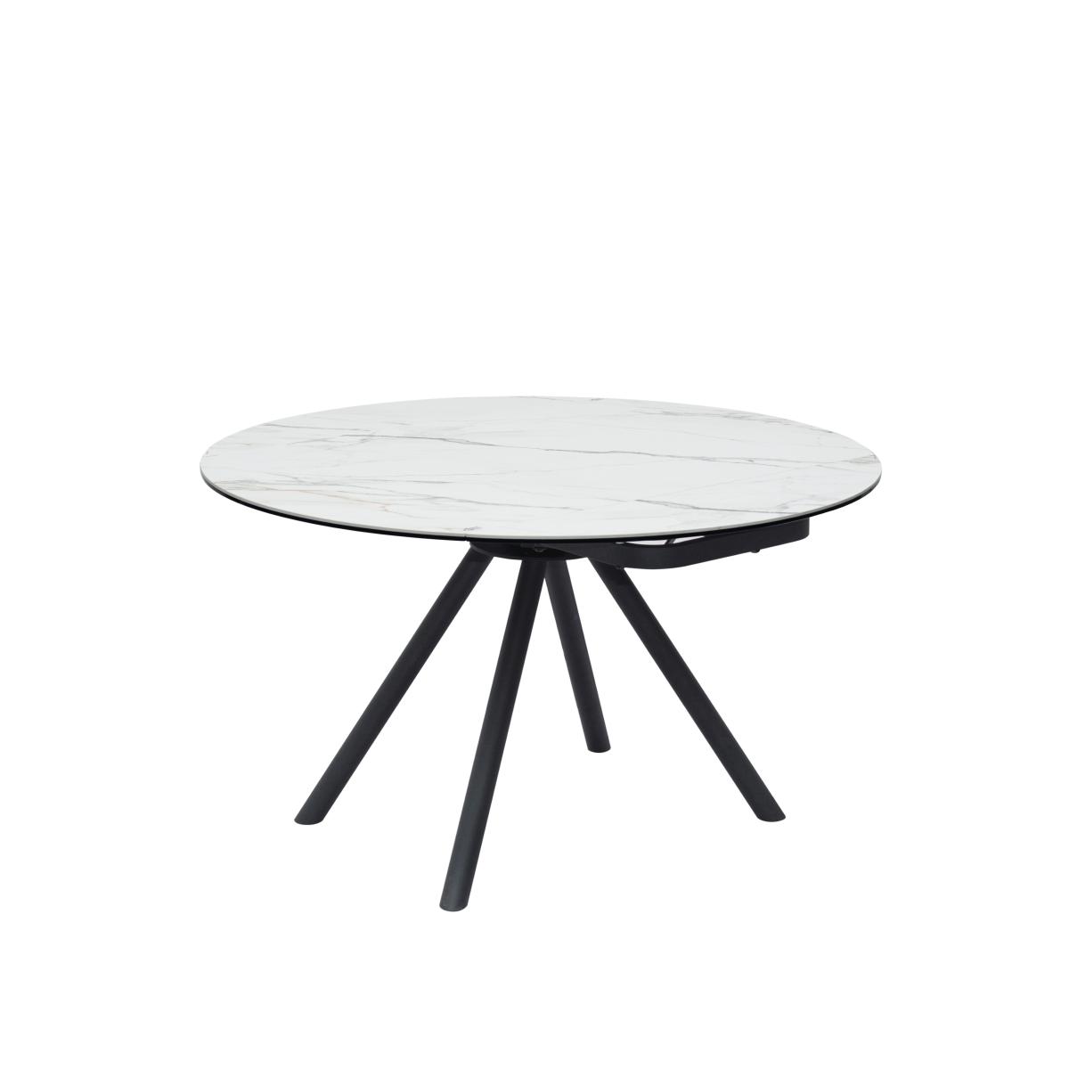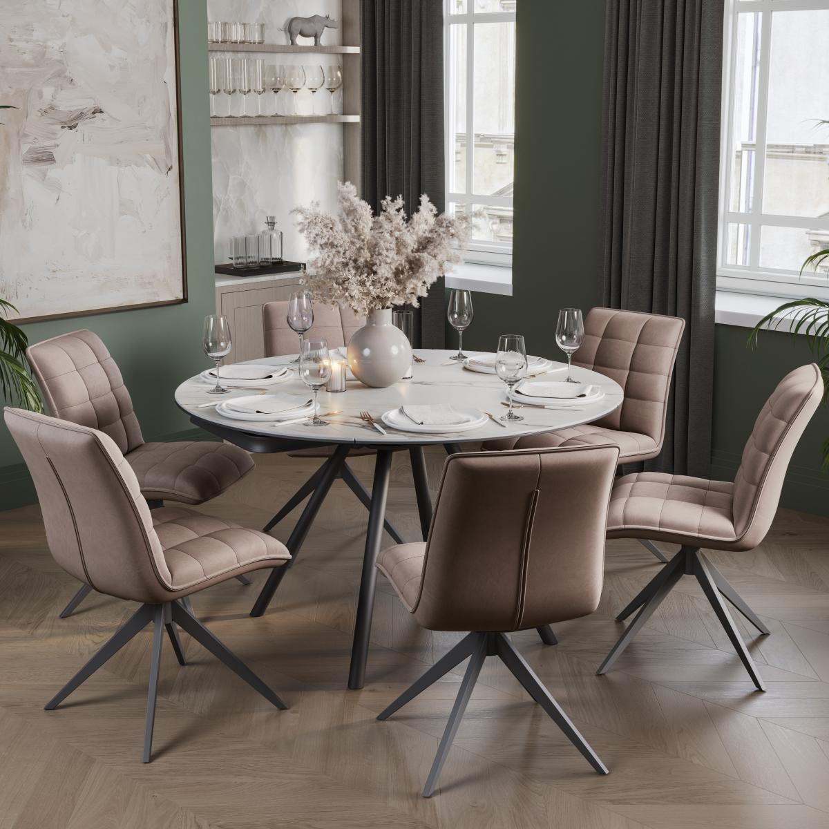 * 1 x Dining Table and 6 x Dining Chairs * Ceramic table top with coated metal legs * Extendable - round to rectangle * Soft upholstered chairs Blending clean lines with smart functionality, this round dining set is a modern must-have. The ceramic table features a marble-effect finish for a touch of luxury, supported by sleek black metal legs. It comfortably seats six with the included Aura chairs, and thanks to its easy extension mechanism, you can go from cosy family dinners to larger gatherings in no time—expanding from 80cm to 130cm with minimal effort.