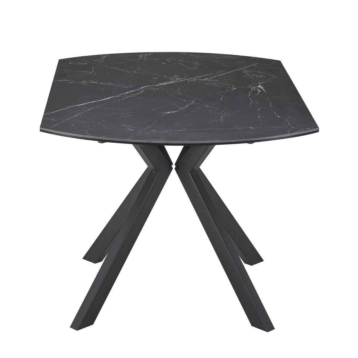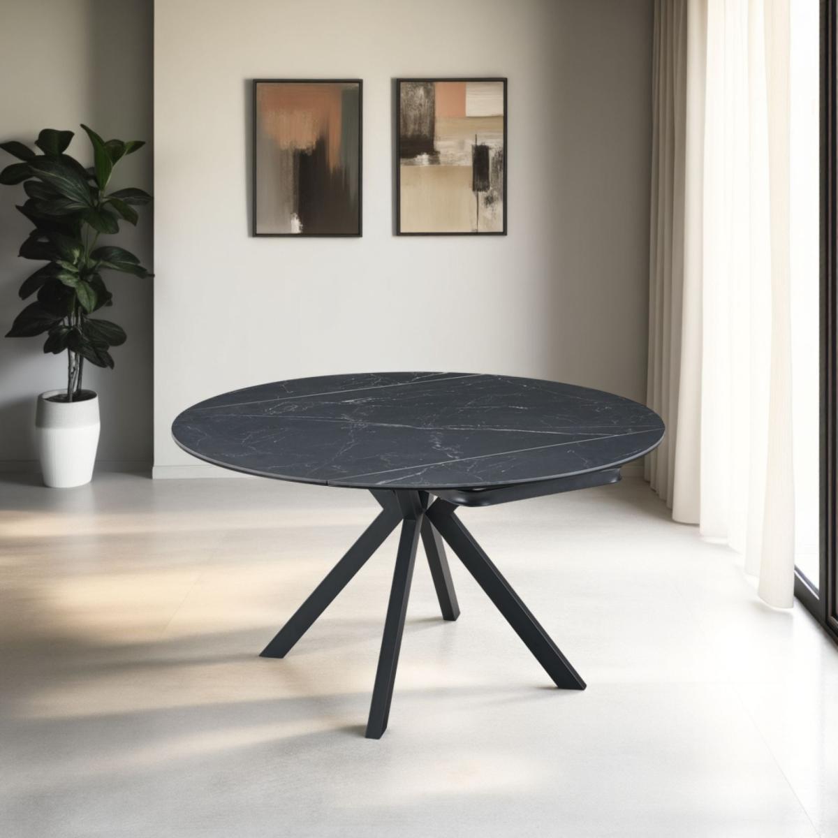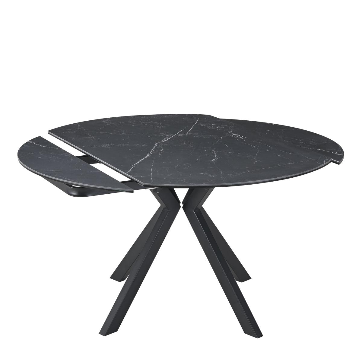 * Marble effect table top * Black Metal legs * Seats up to 6 people For those who want flexibility with a side of style, this round extending table is an excellent choice. The ceramic surface mimics marble for a clean and durable finish, and the base is grounded in modern black metal. It expands smoothly to accommodate extra guests, making it a practical yet good-l