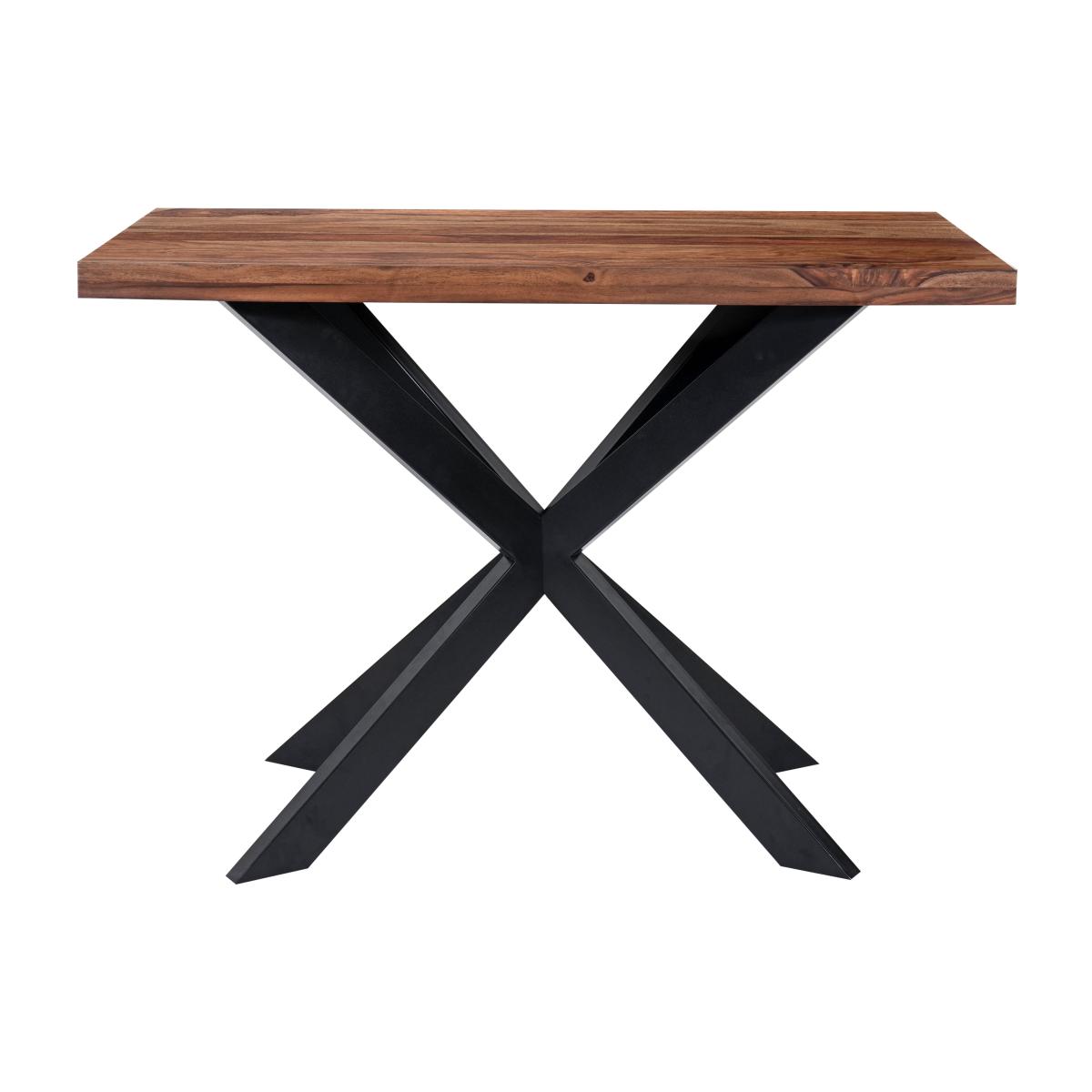 * Solid wood top * Metal legs * Natural wood finish * Modern design Perfectly sized for smaller spaces, the Indus Valley small dining table retains all the charm and durability of its larger counterpart in a more compact design. The natural Sheesham wood top exudes warmth and character, while the black metal X-frame legs create a striking industrial touch.