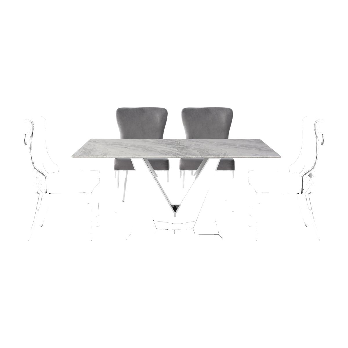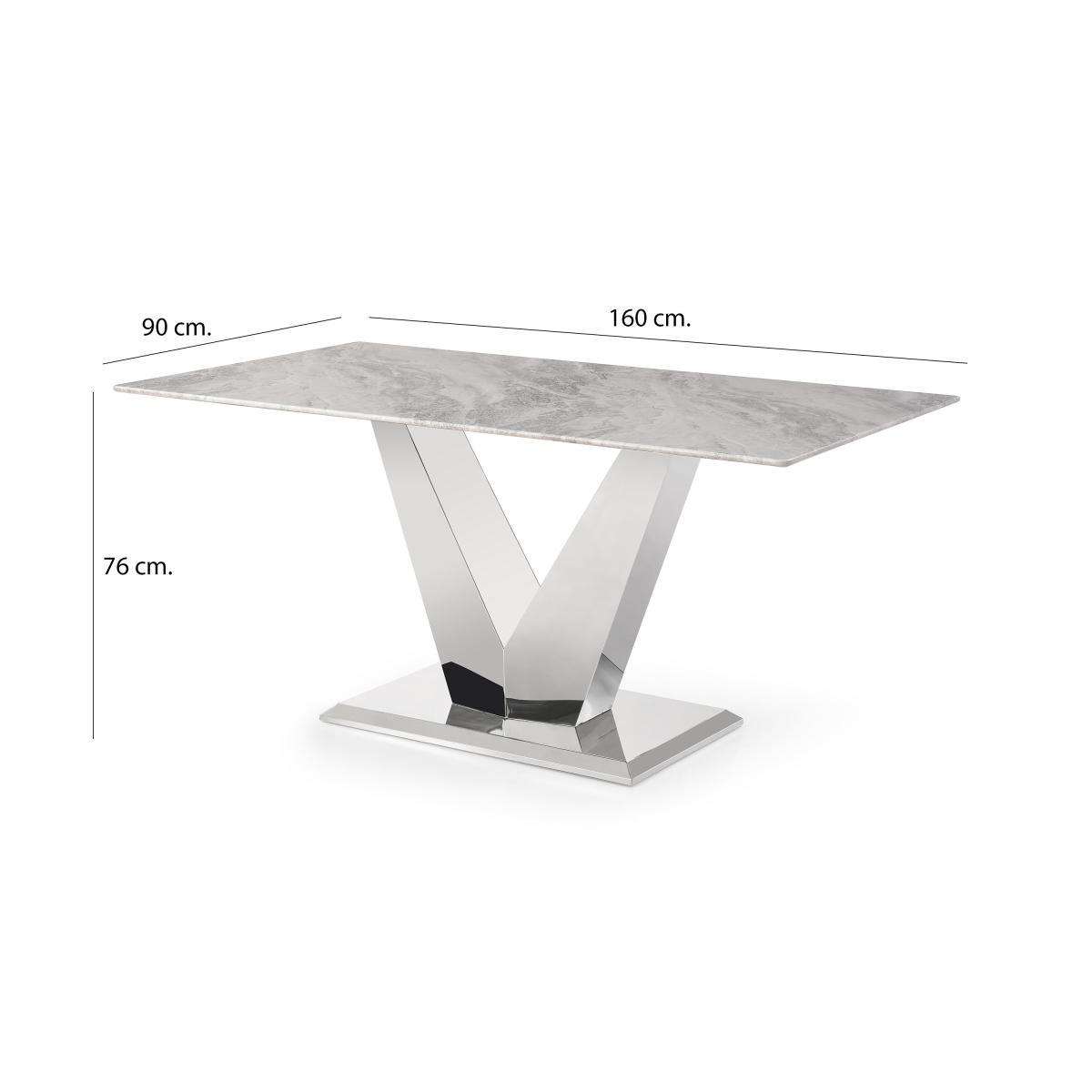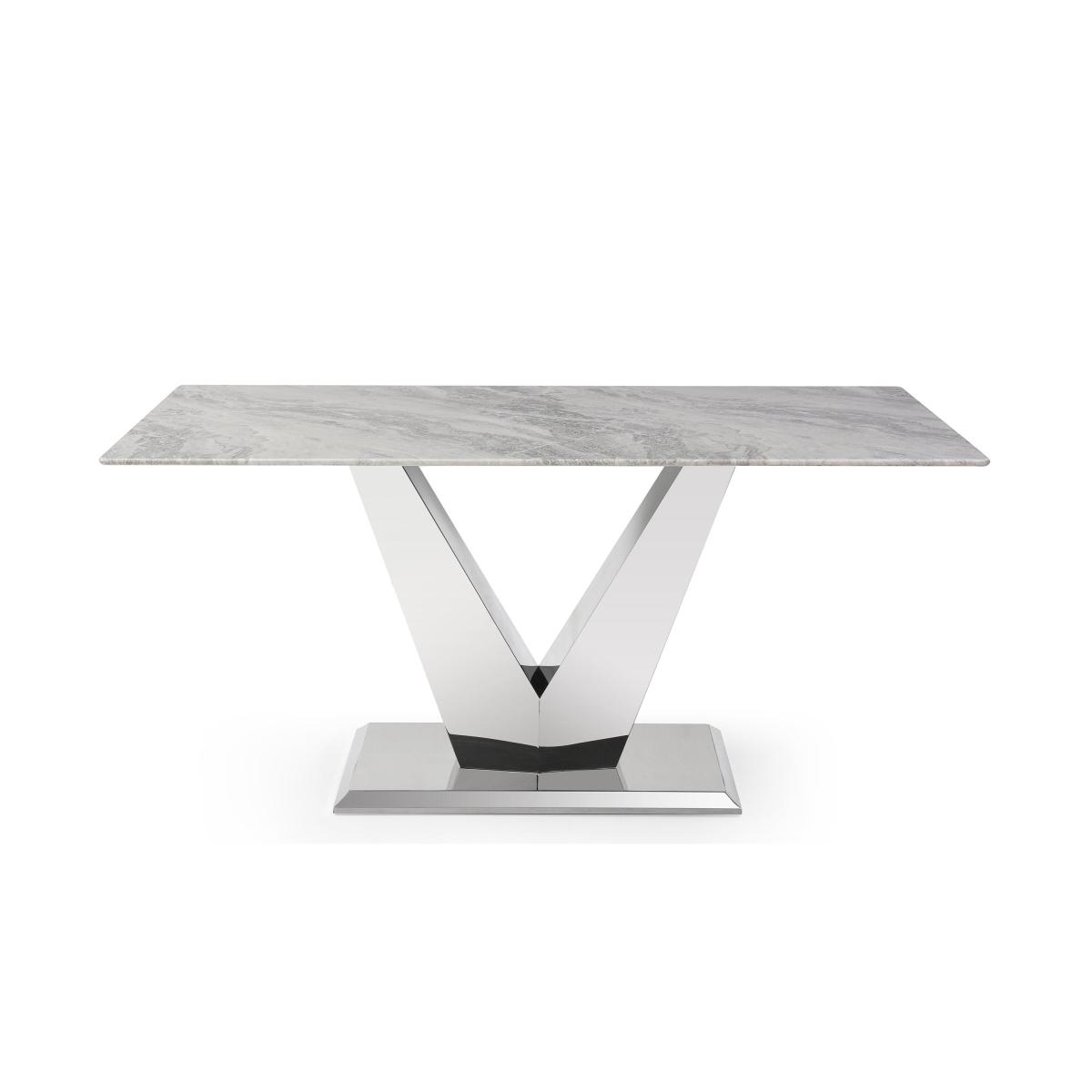 * Stylish Marble effect top* Polished stainless steel legs* Seats up to 6 people* Part assembled* Glamorous modern design The Indus Valley Metro Dining Table seamlessly blends luxurious marble with a striking polished stainless steel base, creating a cutting-edge design. Its unique V-shaped base not only adds a contemporary touch but also ensures stability, comfortably seating 6-8 people. Please note we are unable to deliver this item to Northern Ireland.