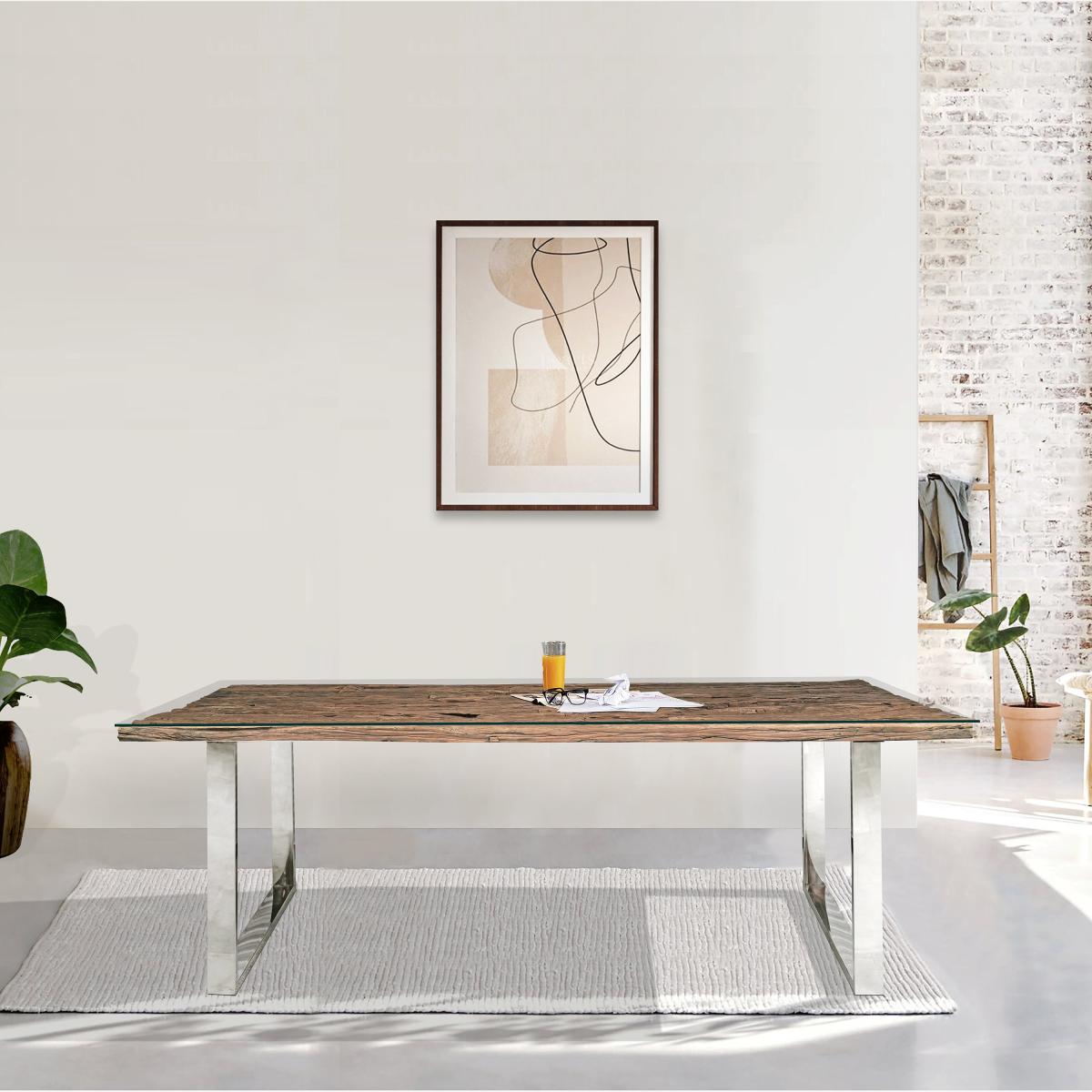 I’m a fan of this sleeper dining table for its mix of reclaimed-wood warmth and sleek stainless-steel legs - it brings just the right balance of rustic character and contemporary edge. It suits everything from industrial lofts (pair it with metal-framed chairs) to more relaxed farmhouse or Scandinavian schemes (use simple white or muted-toned seating). Styling-wise, keep the table clutter-free: a low-profile runner or a couple of neutrally glazed ceramic pots down the centre works beautifully without hiding the wood grain. Mix in textured linens for place settings and, if you have the space, add a linear pendant light above to emphasise its generous length.
