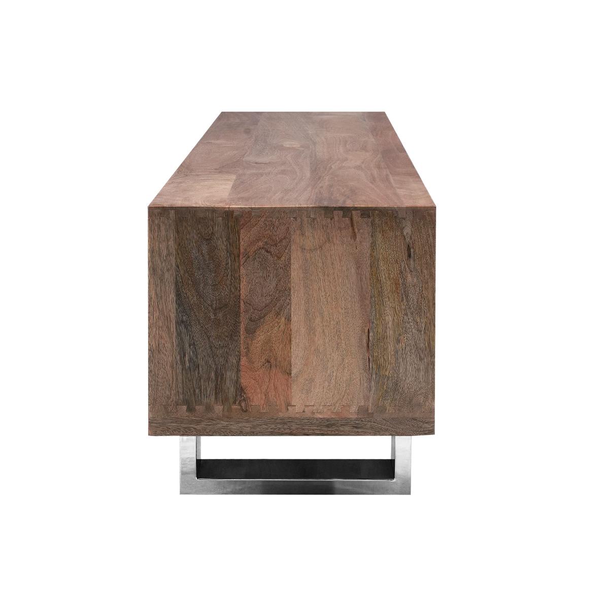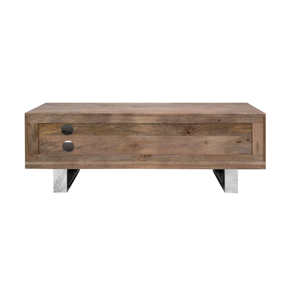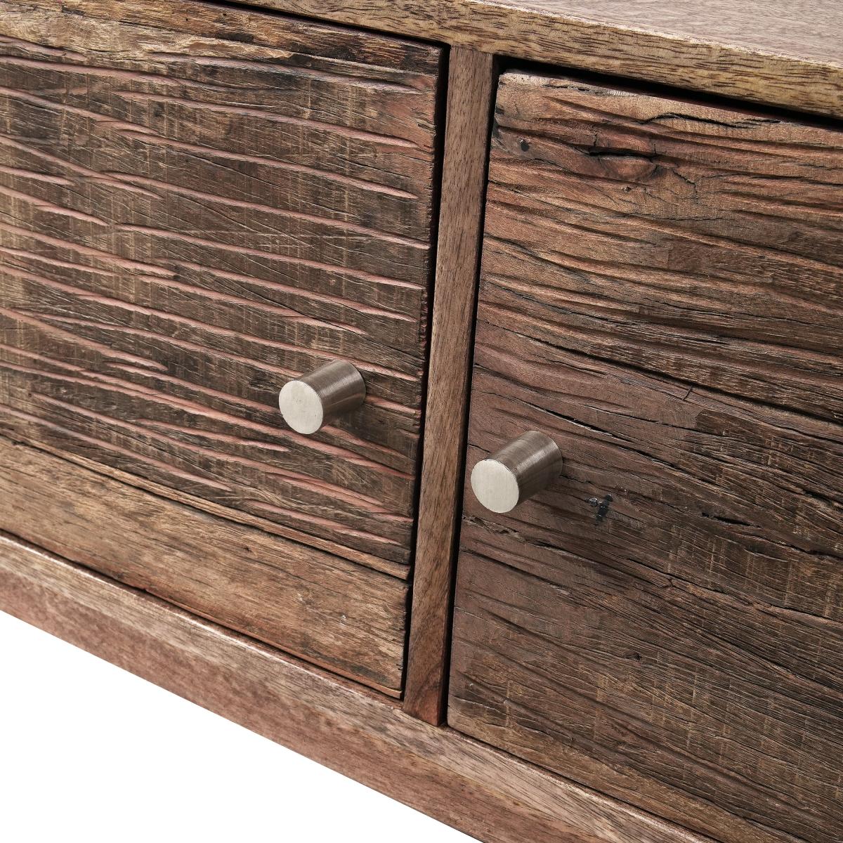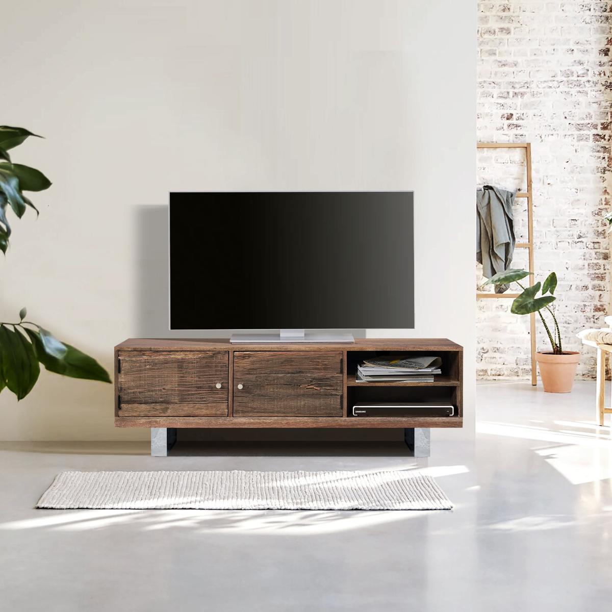 This Indus Valley Railway Sleeper TV Stand is a perfect fit for up to a 44" TV. Made with solid reclaimed sleeper wood and polished stainless steel SS U-base legs, it combines rustic charm with an industrial look. With two open shelves and a spacious cupboard, this TV cabinet provides ample space for consoles and accessories, making it a unique and functional addition to your living room.
