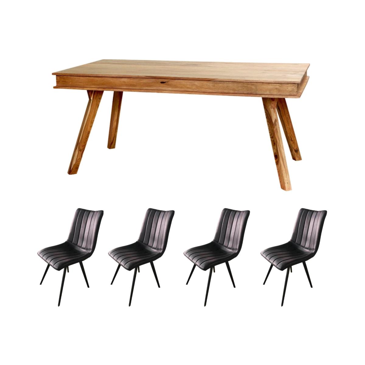 Crafted with passion by skilled artisans in India from solid Grade A Sheesham wood, the Indus Sheesham Medium Table Set brings a contemporary flair to your home. Featuring a natural sheesham tone with natural wood variation, this eco-friendly set includes 1 dining table and 4 chairs with striking vertical accent stitching for extra detail. Soft vegan leather seats offer ultimate comfort and ease of cleaning, allowing you and your guests to relax in style after the meal is done.