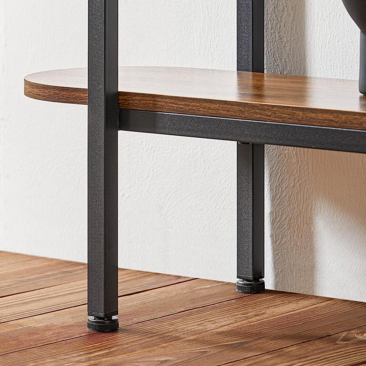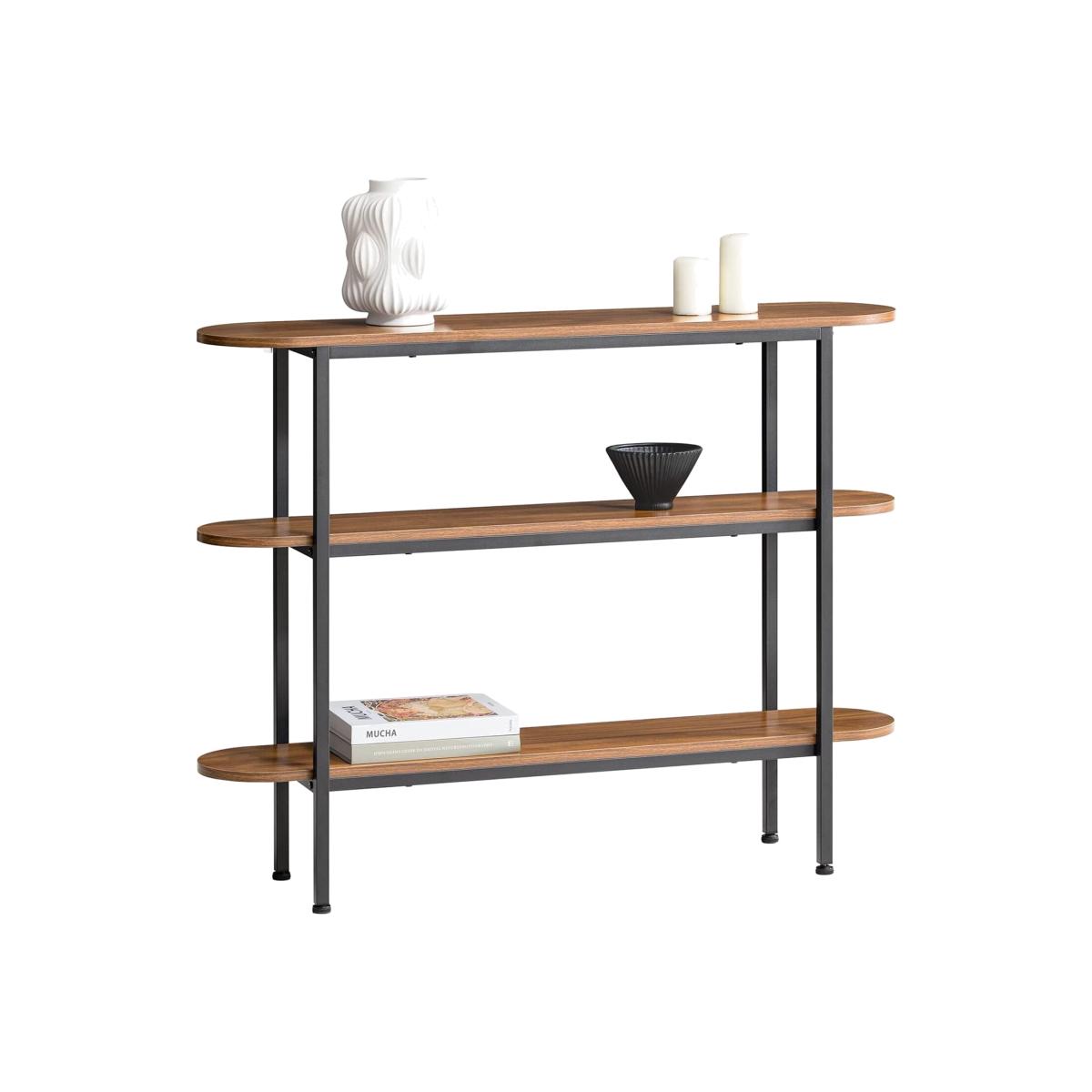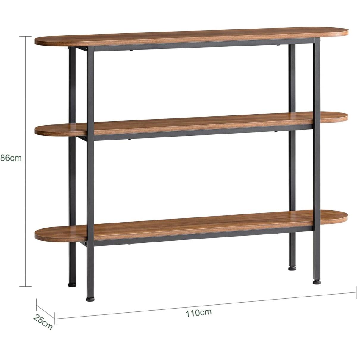A diverse and contemporary product, would be suitable for a variety of locations, like hallway, living room and office.3 shelves provide plenty of storage and display space for you. It features adjustable feet under each metal leg to ensure it stay level on uneven floor.25cm in depth, the side table is narrow enough to fit even in a small corridor. Made of high quality particle board with walnut effect printed and black powder coated steel frame. Stable and durable. Coming with anti-tipping device, ensuring great stability and safety. It is very multi-functional due to the slender and clean design yet practical feature. The simple lines and subtle industrial style will give a contemporary twist to the focal point of any living room. Material Particle board, metal.