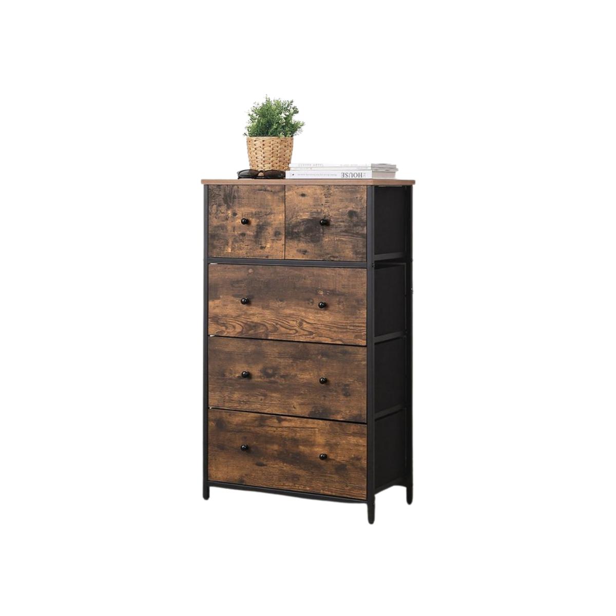 This 5-drawer dresser tower offers generous storage for clothes, accessories, or daily essentials, helping you declutter your closet and make room for more. With a rustic brown wood-look surface, matte black steel frame, and solid wood knobs, this dresser blends industrial style with warm, natural tones to complement a variety of interiors. Crafted from a sturdy metal frame, durable particleboard top and drawer fronts, and lightweight fabric drawers, this organiser combines strength and functionality for long-lasting use. Whether in the bedroom, nursery, hallway, or entryway, this chest of drawers keeps everything from clothing and linens to baby supplies and on-the-go items neatly organised and easy to access. Includes clear instructions, labelled parts, an Allen key, and 4 adjustable feet to ensure stability - even on uneven floors. Assembling your new storage unit is quick and straightforward.