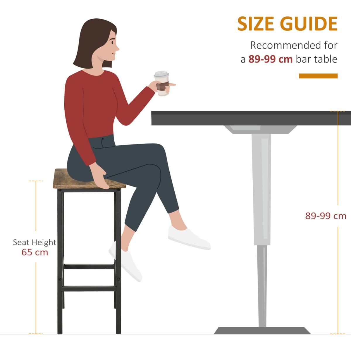 Simple, modern style in the form of a traditional kitchen piece - the humble bar stool. These two industrial-style kitchen stools are great for creating impact wherever they stand. Each frame is made from metal for a strong structure, fitted with a bottom bar to rest your legs comfortably. The seat tops are made from particle board for durability, finished in a suave wood-effect look. The 65cm height makes it idea to pair with higher surfaces, such as kitchen countertops.