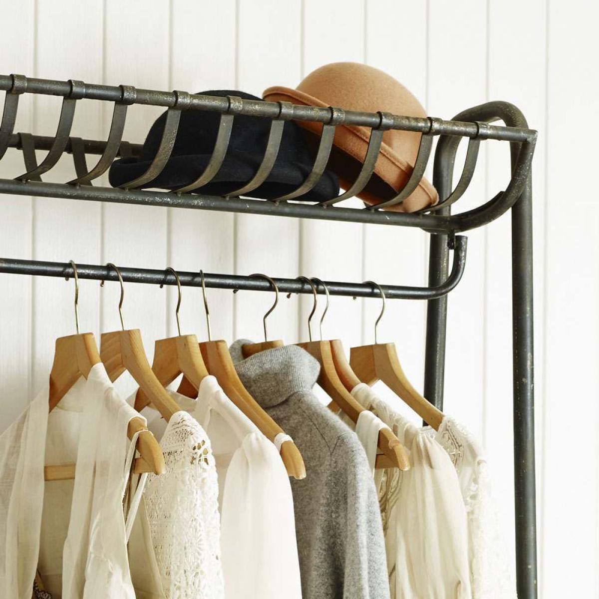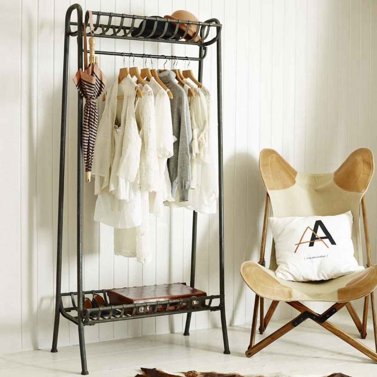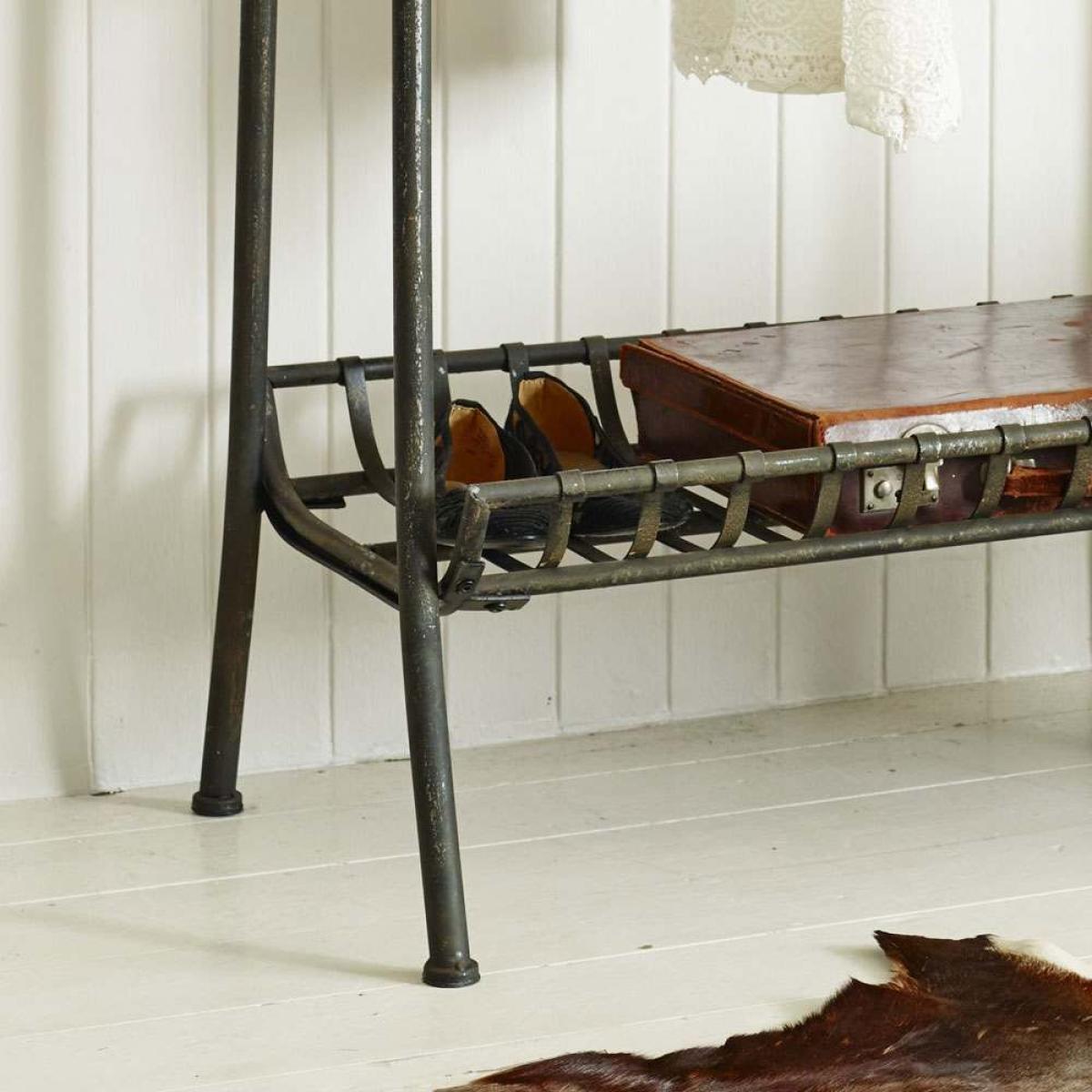 An industrial style black metal clothes rail, finished in an aged patina, with a useful top and bottom shelf for personal accessories.