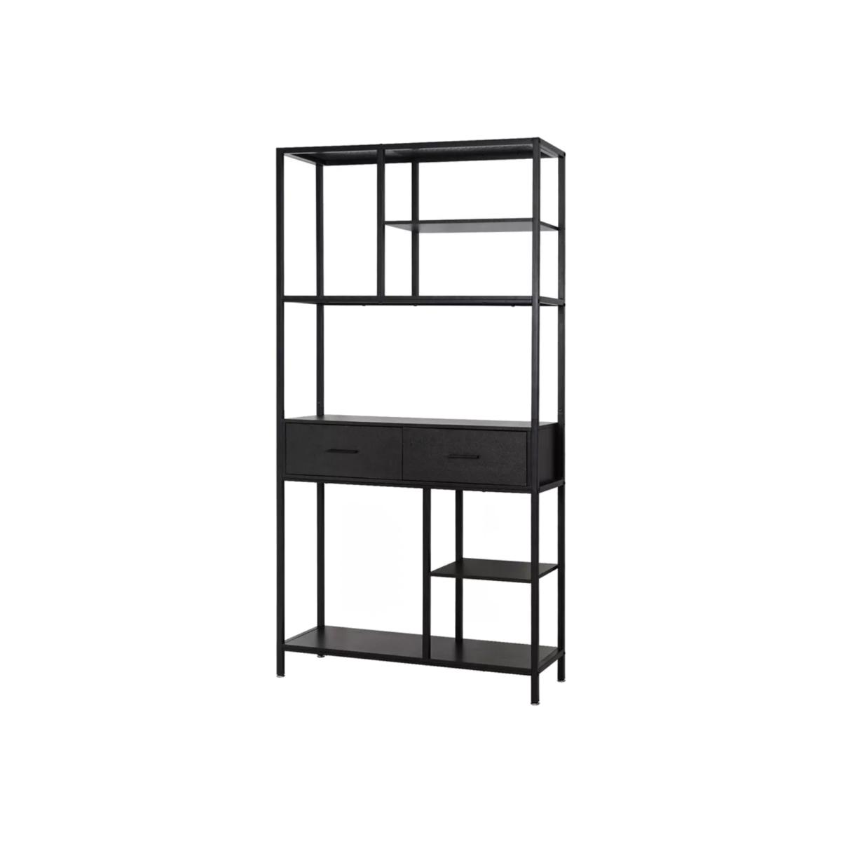 This bookshelf offers ample space for books, documents, kitchen appliances, plants, and more, helping you keep your space organized and clutter-free. The shelf includes two deep pull-out drawers, providing secure and ample storage for smaller or valuable items. This freestanding shelf can be used as a bookshelf, kitchen rack, or display unit in various rooms like the study, kitchen, or living room. Crafted with a black metal frame and MDF boards, the rustic design adds a unique, stylish touch to your home decor. All hardware and instructions are included for hassle-free assembly, so you can quickly set up your bookshelf.