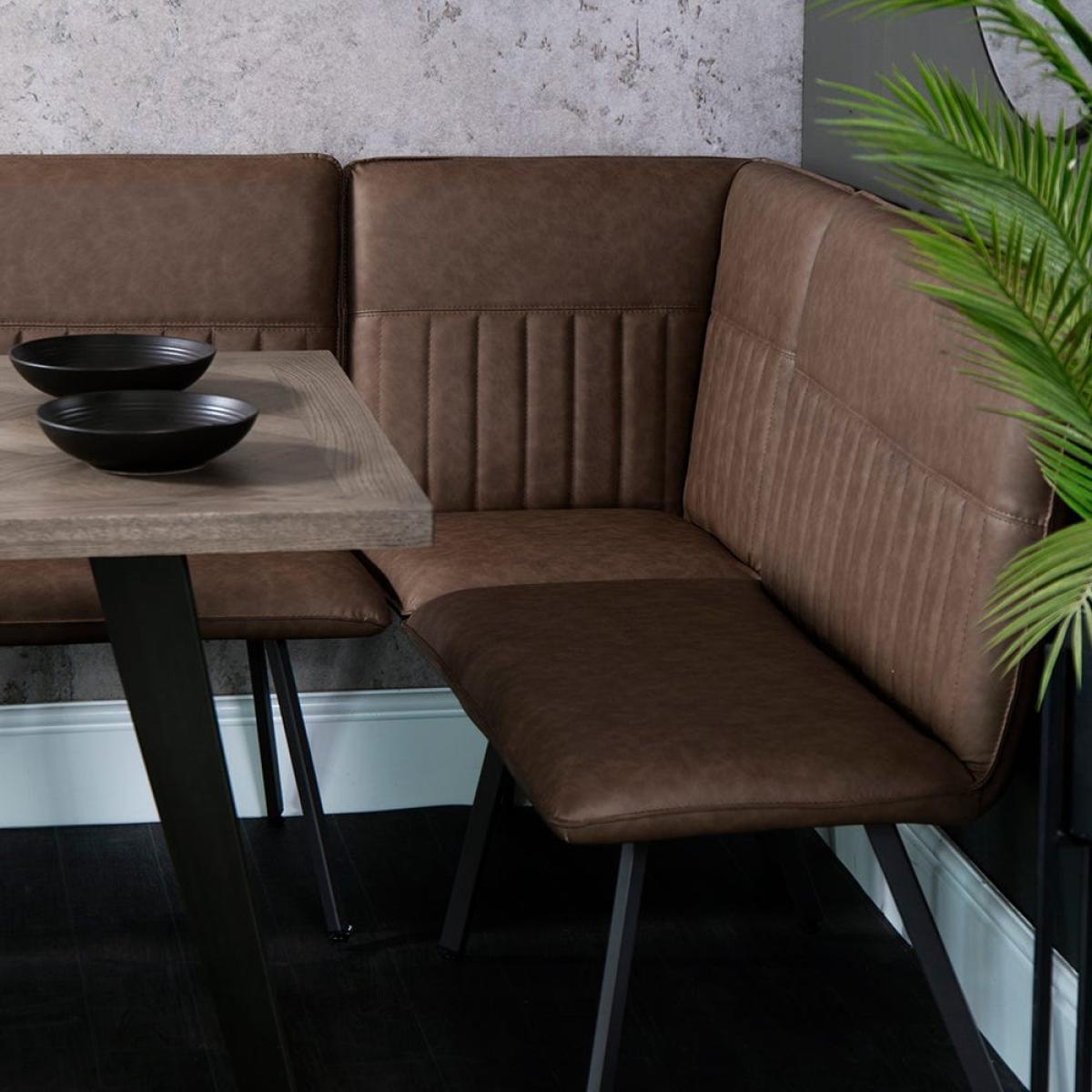 I love this corner bench for its versatile industrial vibe, which works particularly well in contemporary or urban-style interiors. Its rich brown leather adds warmth and texture, creating an inviting yet edgy focal point. It's perfect for pairing with wooden or metal tables, and works well in kitchens, dining areas, or even as a statement piece in a lounge. To style it effectively, consider adding cushions or throws in contrasting fabrics or colours to soften the look, and enhance the industrial feel with metallic accessories or minimalist tableware. This bench is both practical and stylish, effortlessly combining comfort with a modern aesthetic.