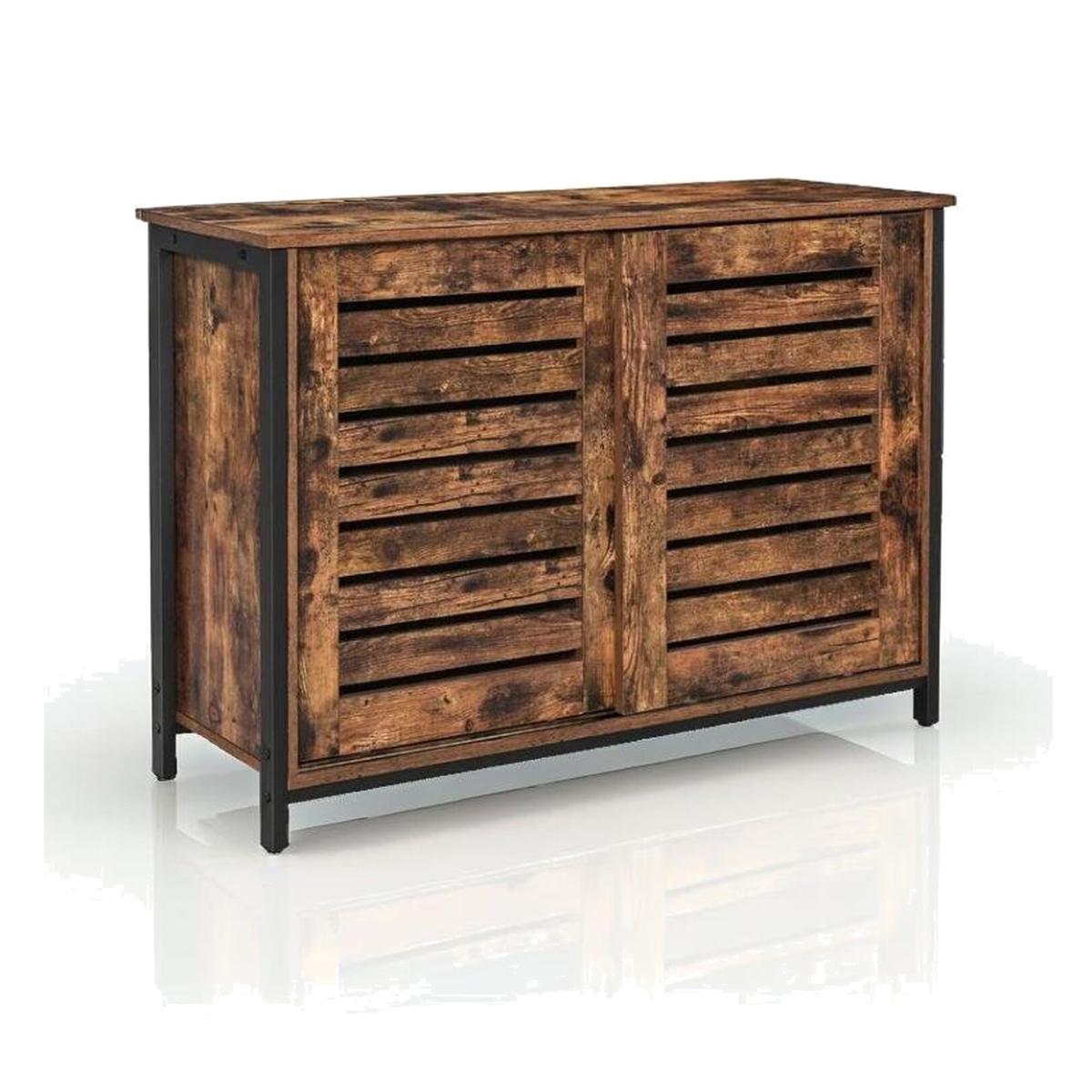 If your kitchen lacks spice, your dining room lacks pepper, or your living room lacks taste, this sideboard with a black steel frame and rustic brown louvred doors can give your rooms that final touch. The construction of this chest of drawers is straightforward with the included Allen key, screwdriver, and clear instructions, ensuring that everything is securely assembled. Shaky furniture can be a nuisance, but the adjustable feet of this storage cabinet compensate for any unevenness in the floor, providing stability. The unique louvred doors glide smoothly past each other, allowing you to slide one door over the other to reveal decorations stored inside.