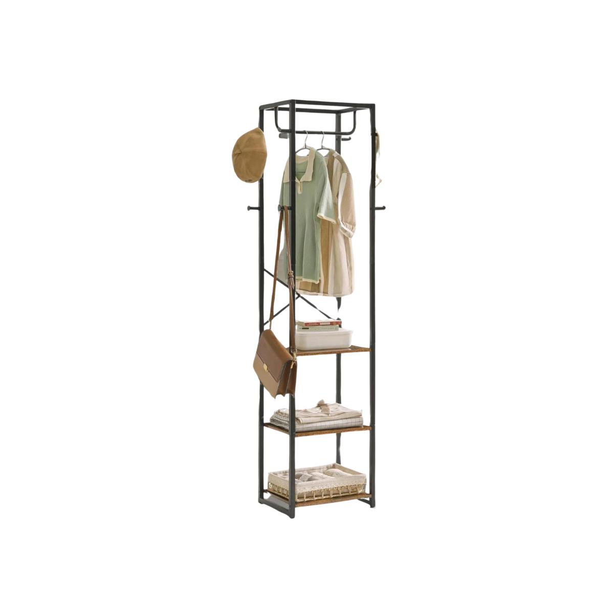 This multifunctional coat rack combines 3 shelves for storing shoes, bags, and daily essentials with 8 hooks and hanging rods for coats, hats, scarves, or totes, offering versatile storage solutions in one compact unit. Designed with a space-saving layout, this hall tree hanger fits perfectly in hallways for organizing household items. It's also suitable for corners in living rooms and bedrooms, maximizing storage without occupying much floor space. Crafted from particleboard and a robust metal frame, this coat rack ensures stability and durability with no risk of wobbling or collapsing. It's built to withstand daily use and provide long-lasting reliability. Featuring an X-shaped brace in the middle, this coat rack enhances structural stability. Each partition shelf can support up to 22 pounds, while each hook is capable of holding up to 11 pounds, ensuring secure storage for various items. Assembly is hassle-free with numbered parts and clear instructions provided. You can quickly assemble the freestanding coat rack to fit seamlessly into your hallway or living room, adding an industrial charm to your decor.