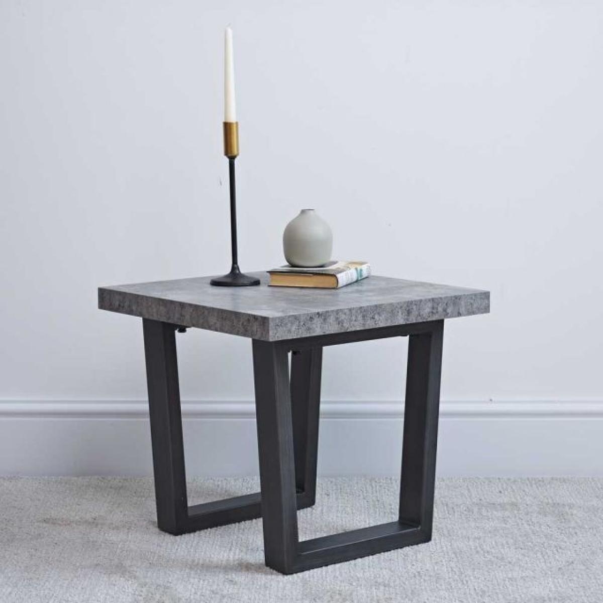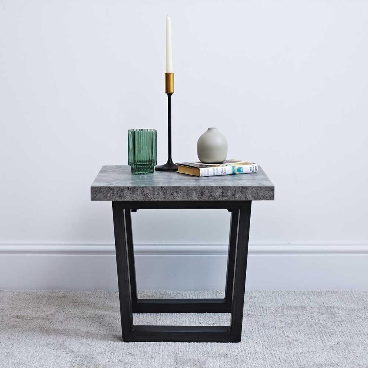 The square Industrial lamp table combines modern style with industrious vibes as seen with its faux concrete table top and simple but robust black metal legs. Team with the rest of the collection to complete the look. W50cm x D50cm x H45cm Simple self assembly