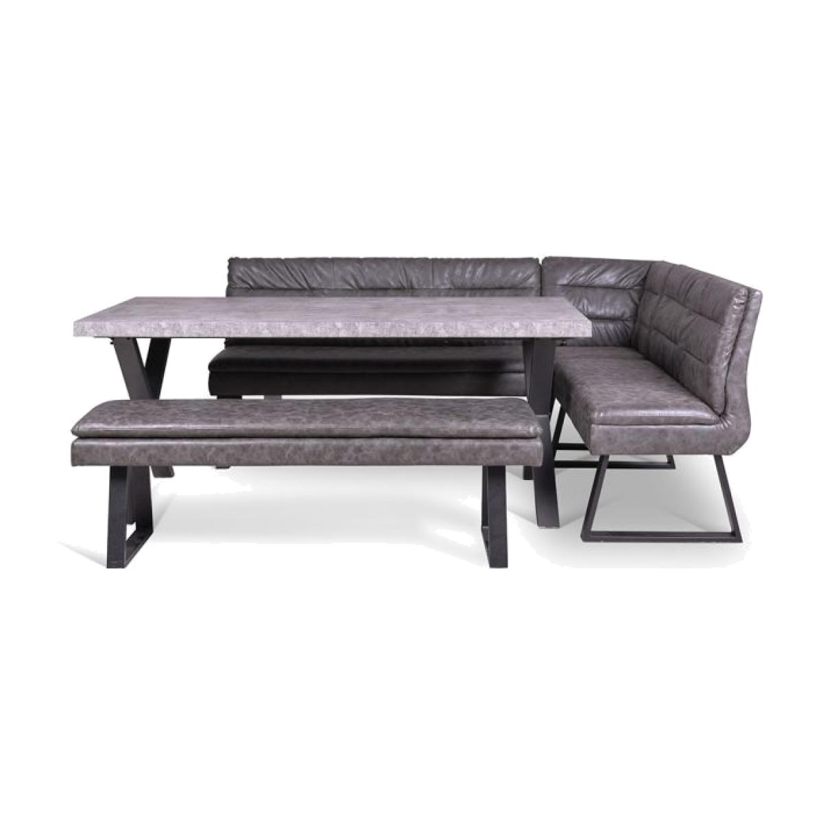 This dining bundle of our Industrial Faux Concrete Dining Table, Industrial Corner Bench and Industrial Low Bench in grey will bring cool modern vibes to any kitchen or diner. The table has an attractive concrete effect top and is supported on modern crossed matt back metal legs. The corner bench and low bench complement the set with their faux leather upholstery, deep cushioned seating and industrial black metal legs, creating social seating space perfect for dining with family and friends.
