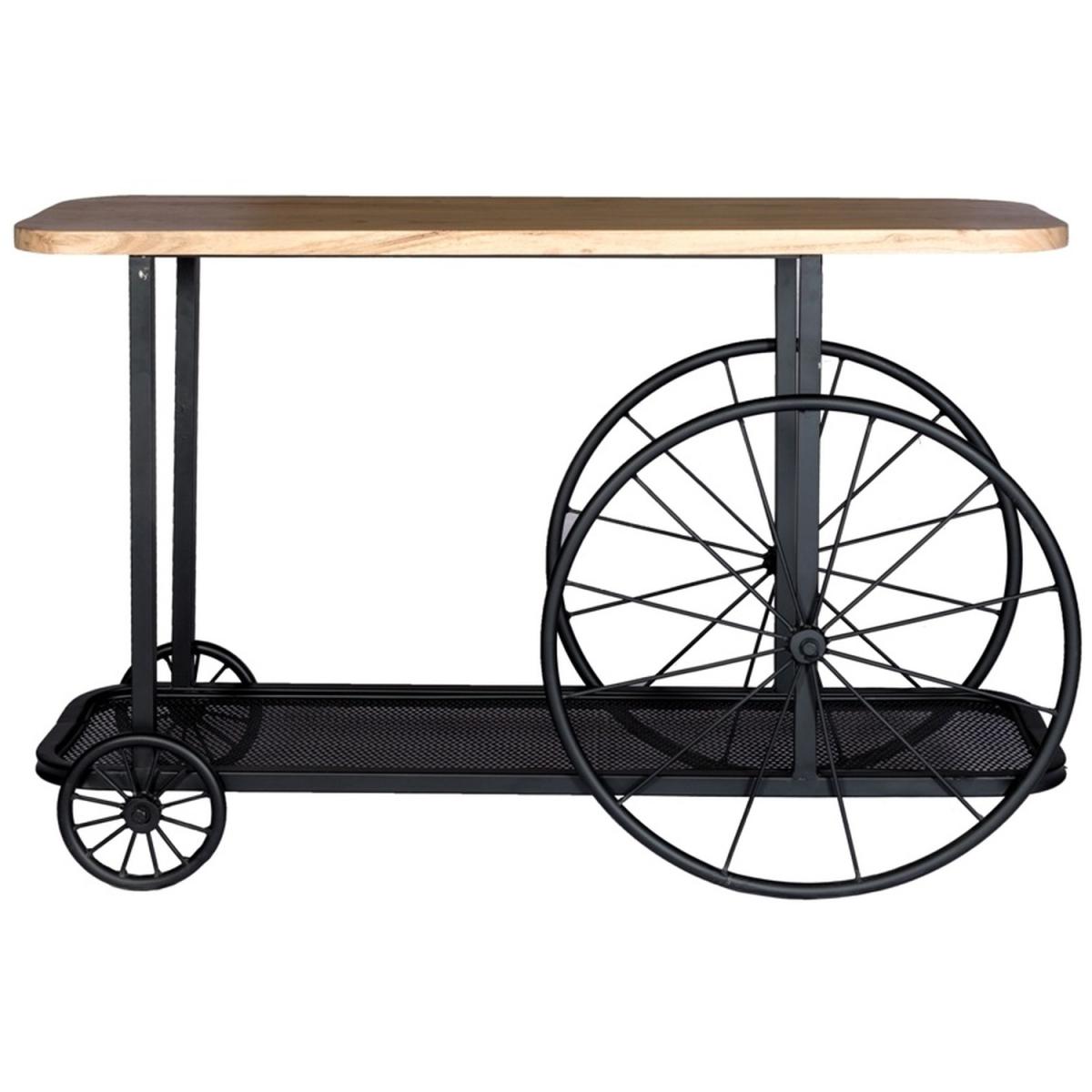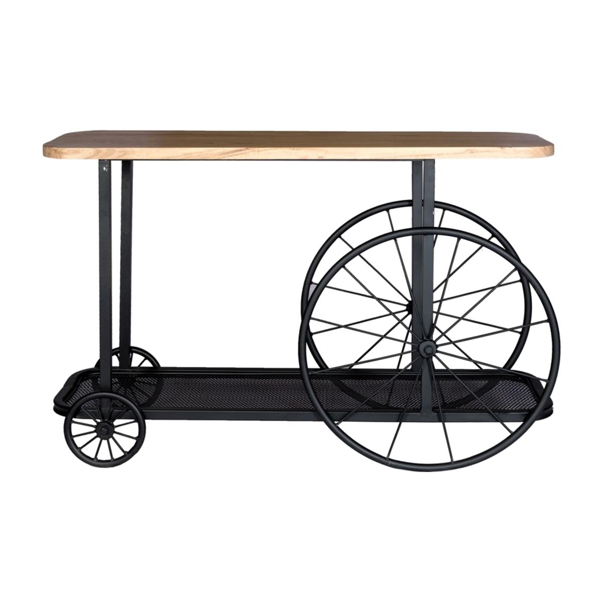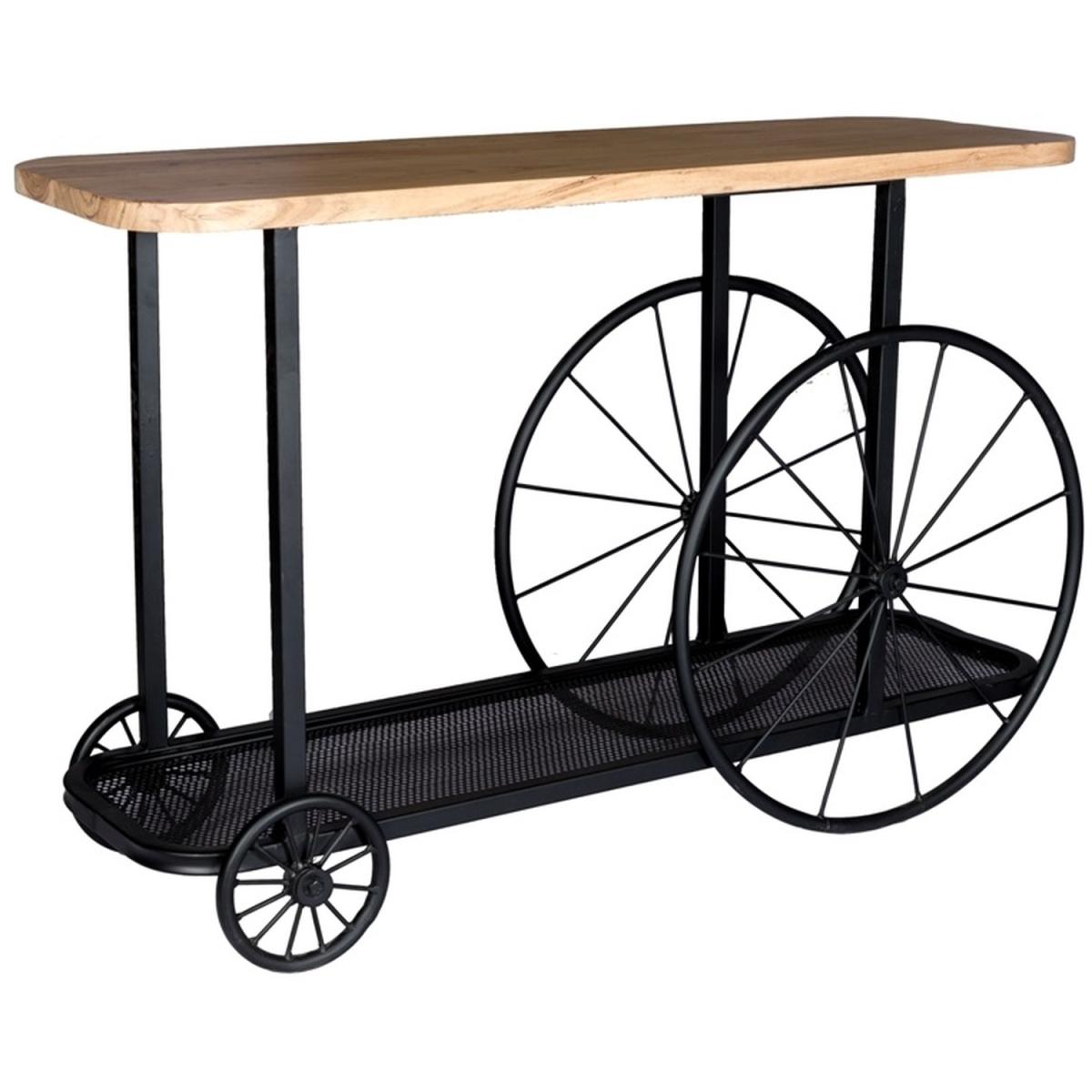 Handmade furniture, crafted by skilled craftsmen in India, will add a touch of character to any contemporary space. A chic industrial style inspired Console / Hall Table with a Solid Mango Wood Top and reclaimed metal base complemented by 4 wheels at the bottom, 2 small on one side and 2 larger on the other side, to create a unique design that will add character to your home. Lacquered in a matte finish. Ideal A unique industrial design is given by the metal base and the addition of the craft wheels. Eco-Friendly Reclaimed Industrial Metal & Solid Wood.