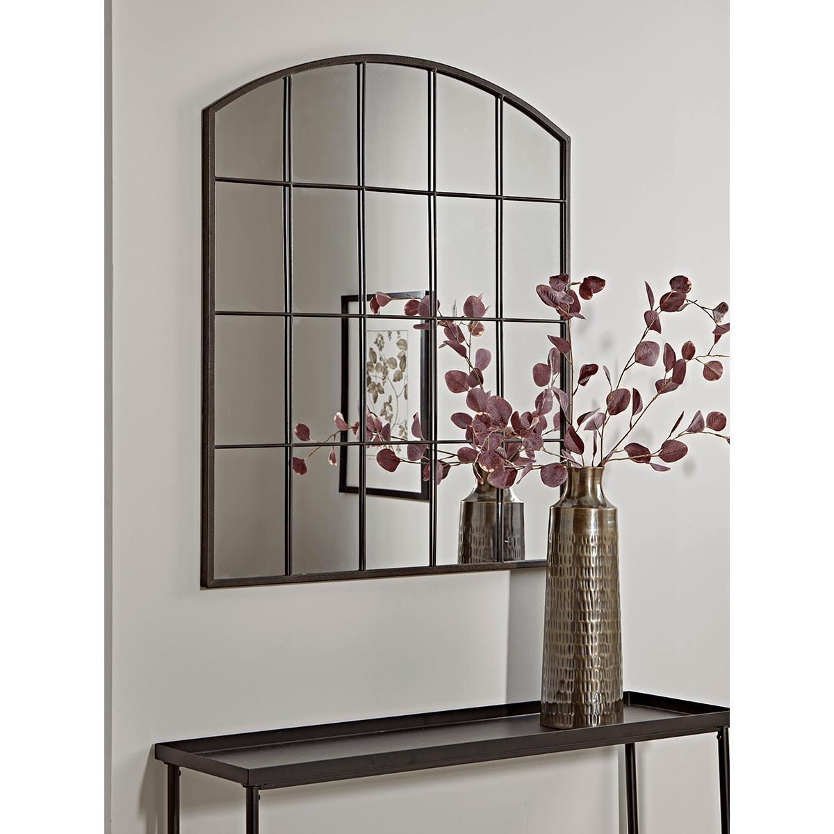 With a gently distressed black metal finish and curved window shape, our bold industrial style mirror will make a statement in your living space. Inspired by our bestselling window mirror collection, it encapsulates factory chic with an elegant twist. Its bold black frame is softened by its curved top, and it can be hung on a wall or propped on a surface as you wish.