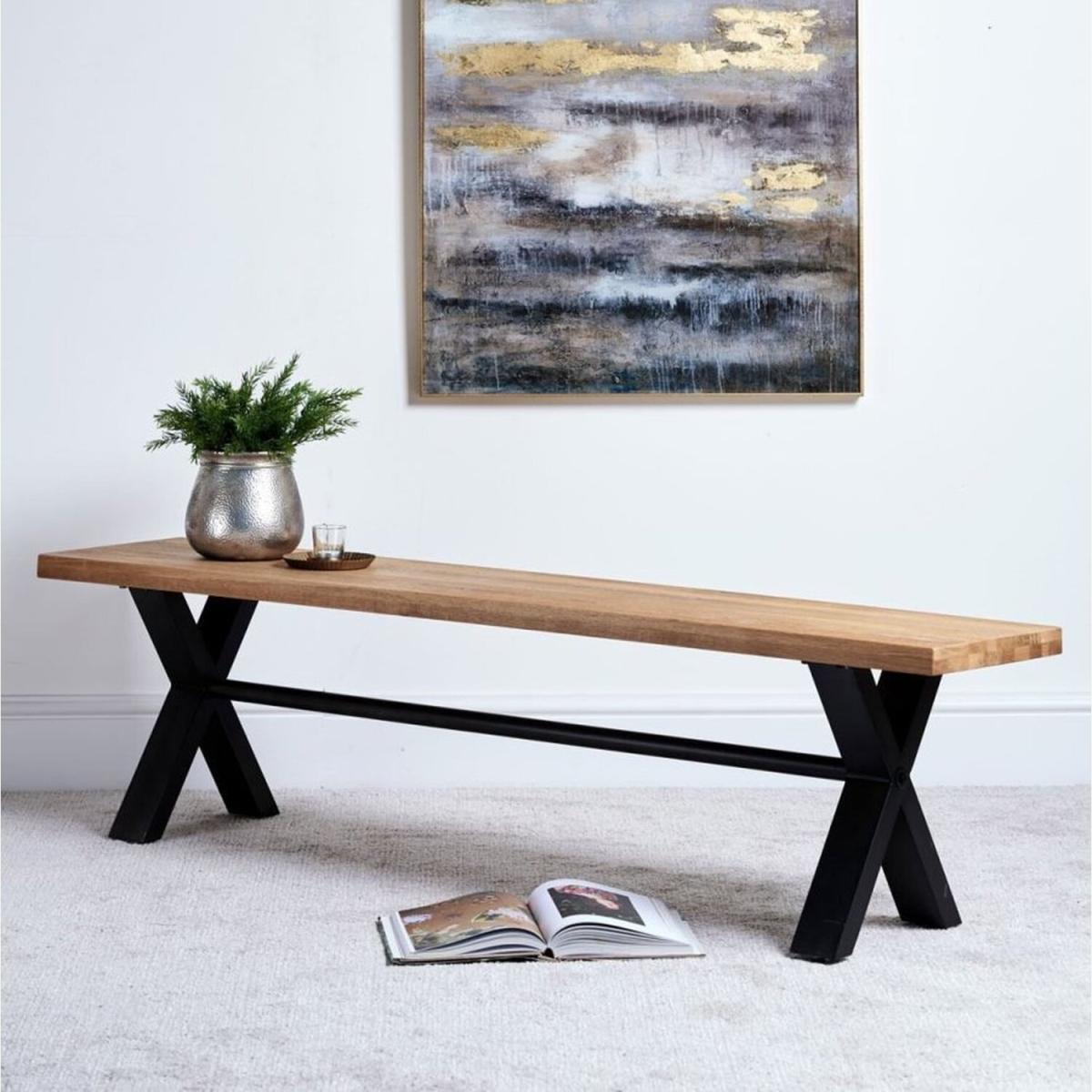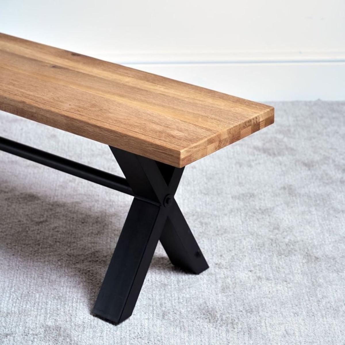 I love this bench for its clean, minimalist design and the beautiful contrast between the rich oak top and the sturdy black base. It works particularly well in industrial or contemporary interiors, adding warmth and texture without overwhelming the space. Practical styling tips include pairing it with leather or metal chairs for a cohesive look or keeping it simple with a centrepiece like a vase or a small plant, as shown here, for a touch of greenery. Its 140cm length makes it versatile - ideal for dining areas, entryways, or even as additional seating in a living room. To make the most of it, consider layering with cushions or throws for extra comfort and style.