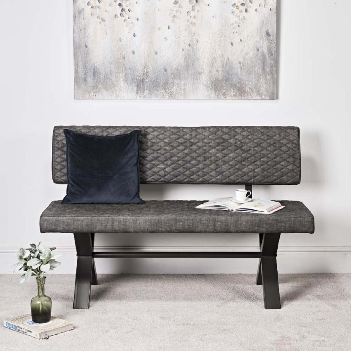 The Industrial Dining Bench is now available with a supportive back section. Featuring the diamond stitched faux leather and heavy duty industrial black metal legs the bench is perfect for a more communal dining experience. Dining benches are also a great way to save space because they allow seating closer to a wall than perhaps a set of dining chairs which need more room behind them. This bench looks amazing with our Industrial Concrete Effect Dining Tables too. *Industrial Look *Faux Leather Upholstery *Black metal powder coated criss cross legs *Dimensions: W140cm x D56cm x H89cm